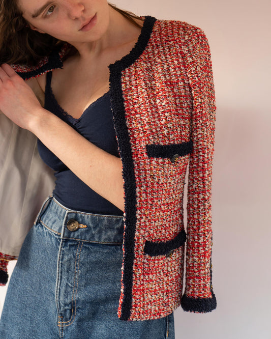 FR34-36 Chanel Spring 1997 Red and White Wool Tweed Longline Blazer with Patch Pockets and Structured Cut