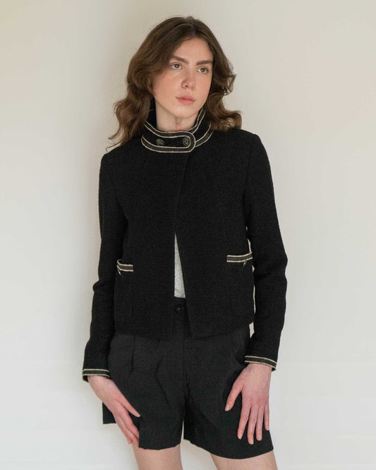 FR34-36 Chanel Fall 1988 Double Breasted Two Pocket Military Style Collarless Wool Jacket