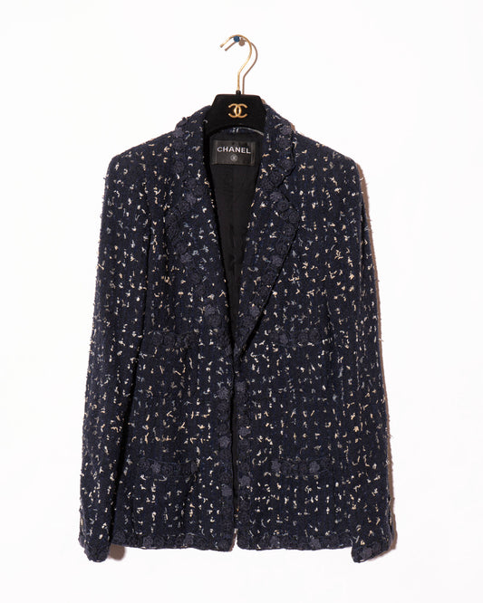 FR34-36 Chanel Cruise 2003 Double Breasted Camellia Detail Black and White Fantasy Tweed Jacket