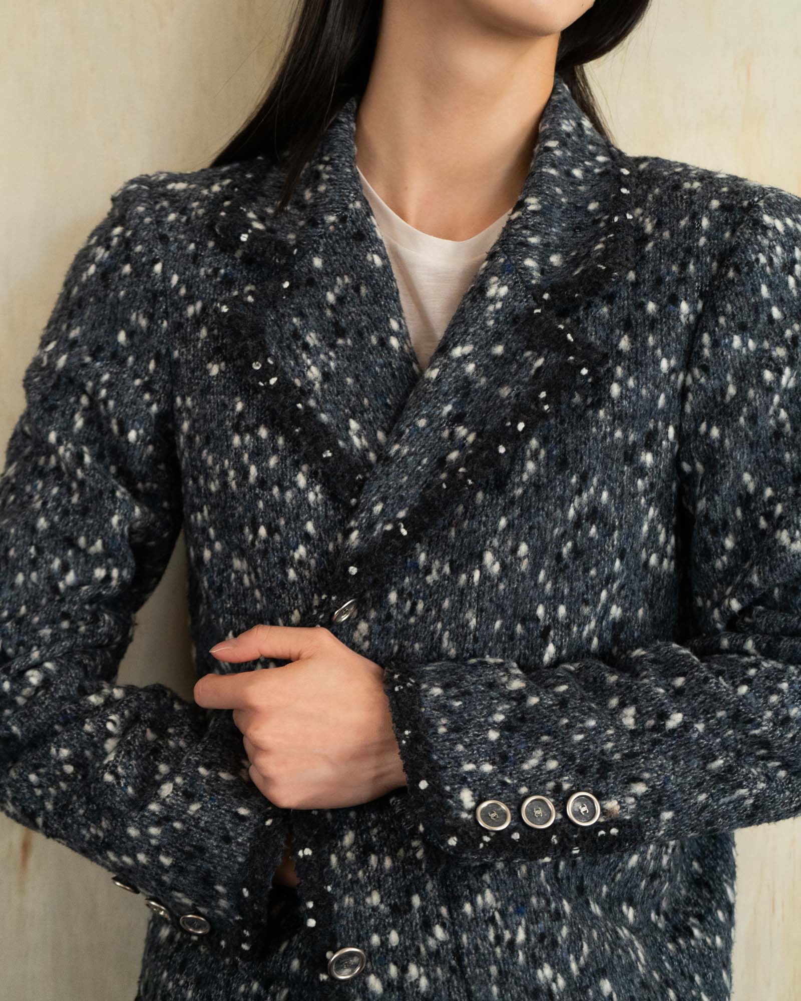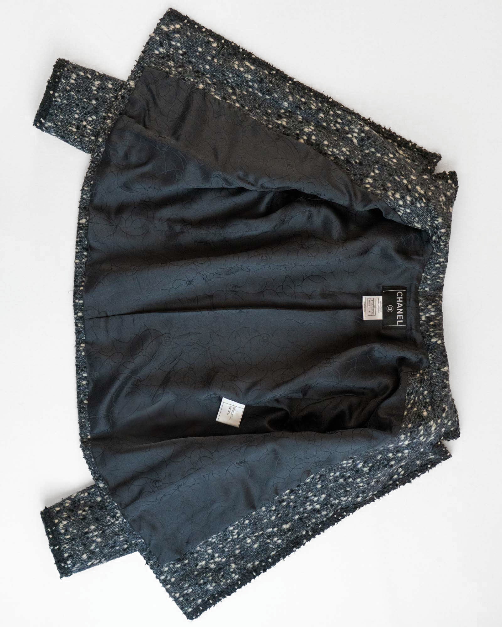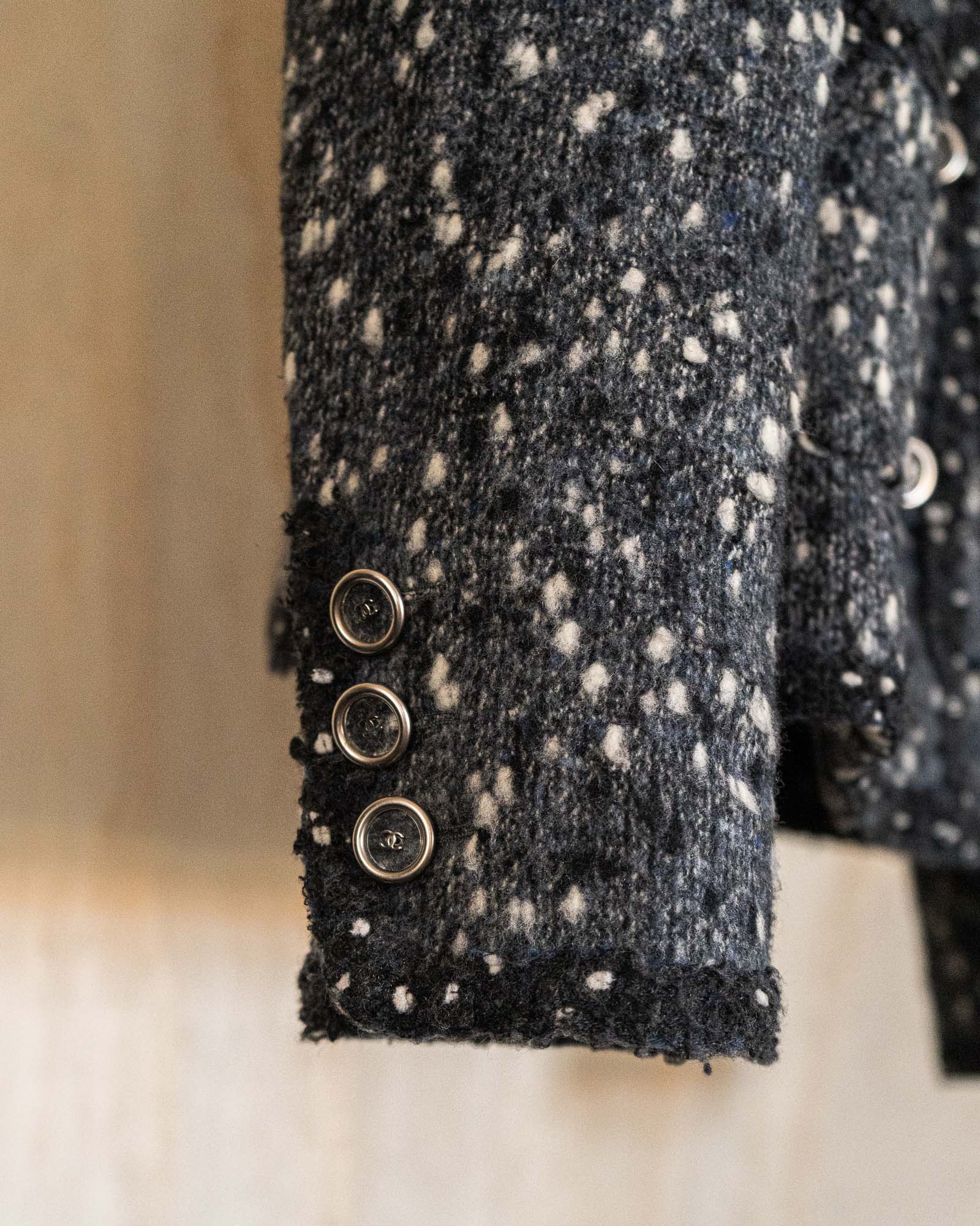 Fall 2001 Chanel jacket in a textured charcoal tweed with ivory and small blue inclusions that resemble a night snowfall. Designed with notched lapels, four front pockets, and a braided trim that outlines the shape. Finished with silver tone CC buttons and fully lined in camellia patterned silk. A distinctive tweed that adds depth and character to any look.