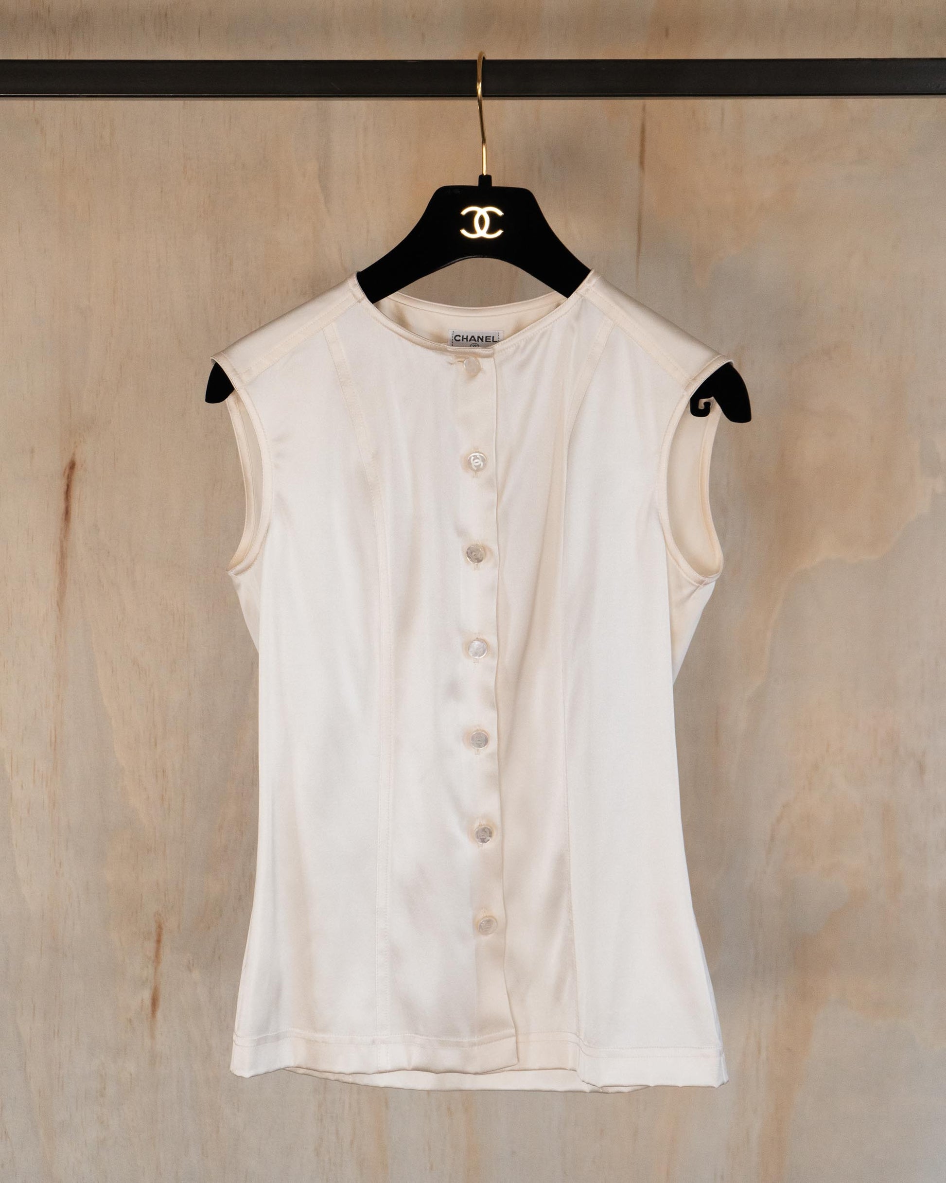 From the Cruise 1996 collection, this sleeveless Chanel top embodies understated 1990s elegance. Tailored in France from lustrous ivory silk with a hint of stretch, it’s designed to skim the body with a subtle hourglass shape.