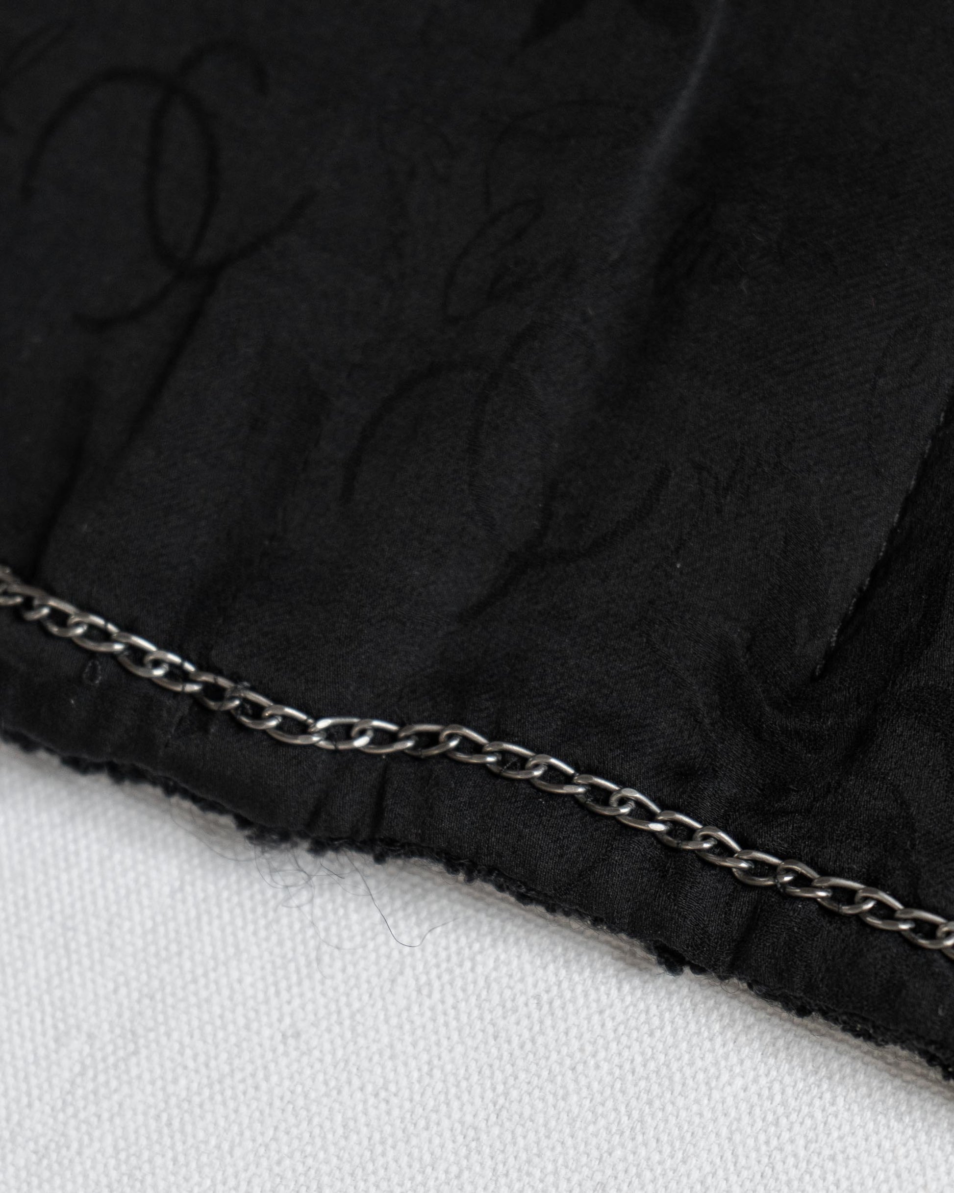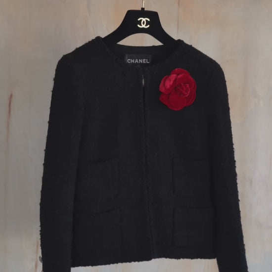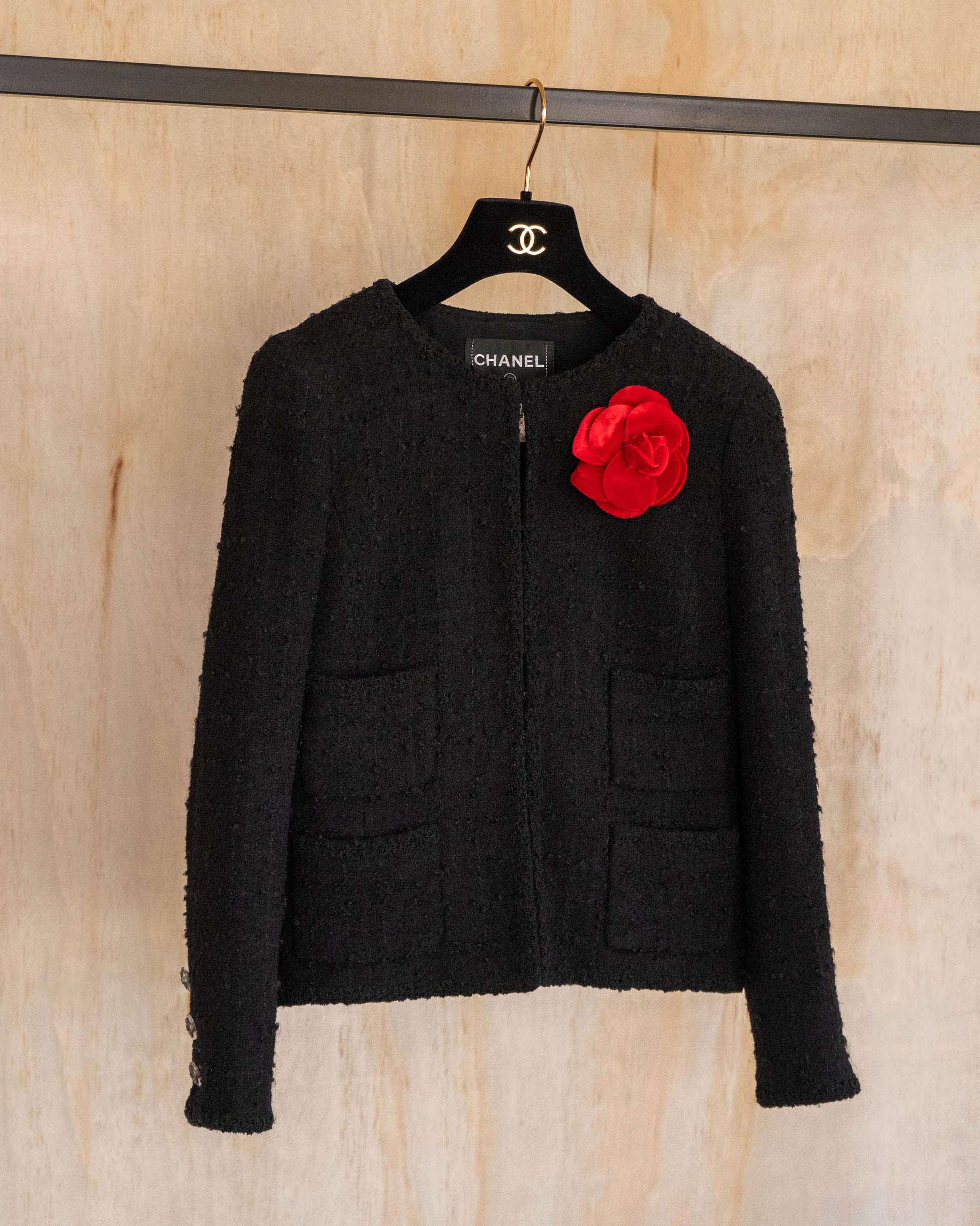 When we think of the quintessential Chanel jacket, this is the silhouette that comes to mind. From the Fall 2009 collection, it’s crafted in rich black tweed with a clean, collarless cut, four functional pockets, and interlocking CC logo buttons at the cuffs and front. Finished with a full silk lining and the signature chain at the hem, it reflects the refined structure and quiet confidence of late-2000s Chanel tailoring.