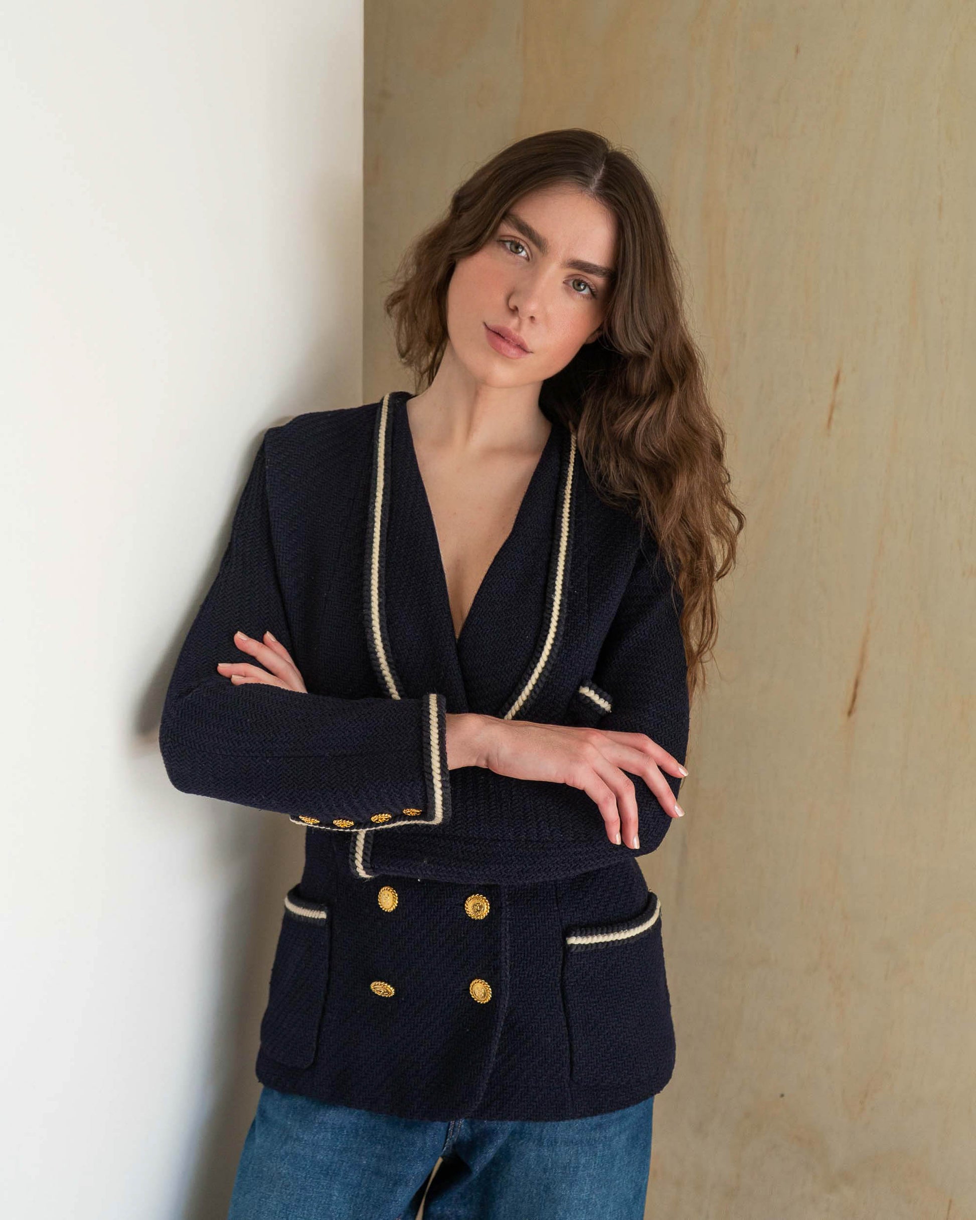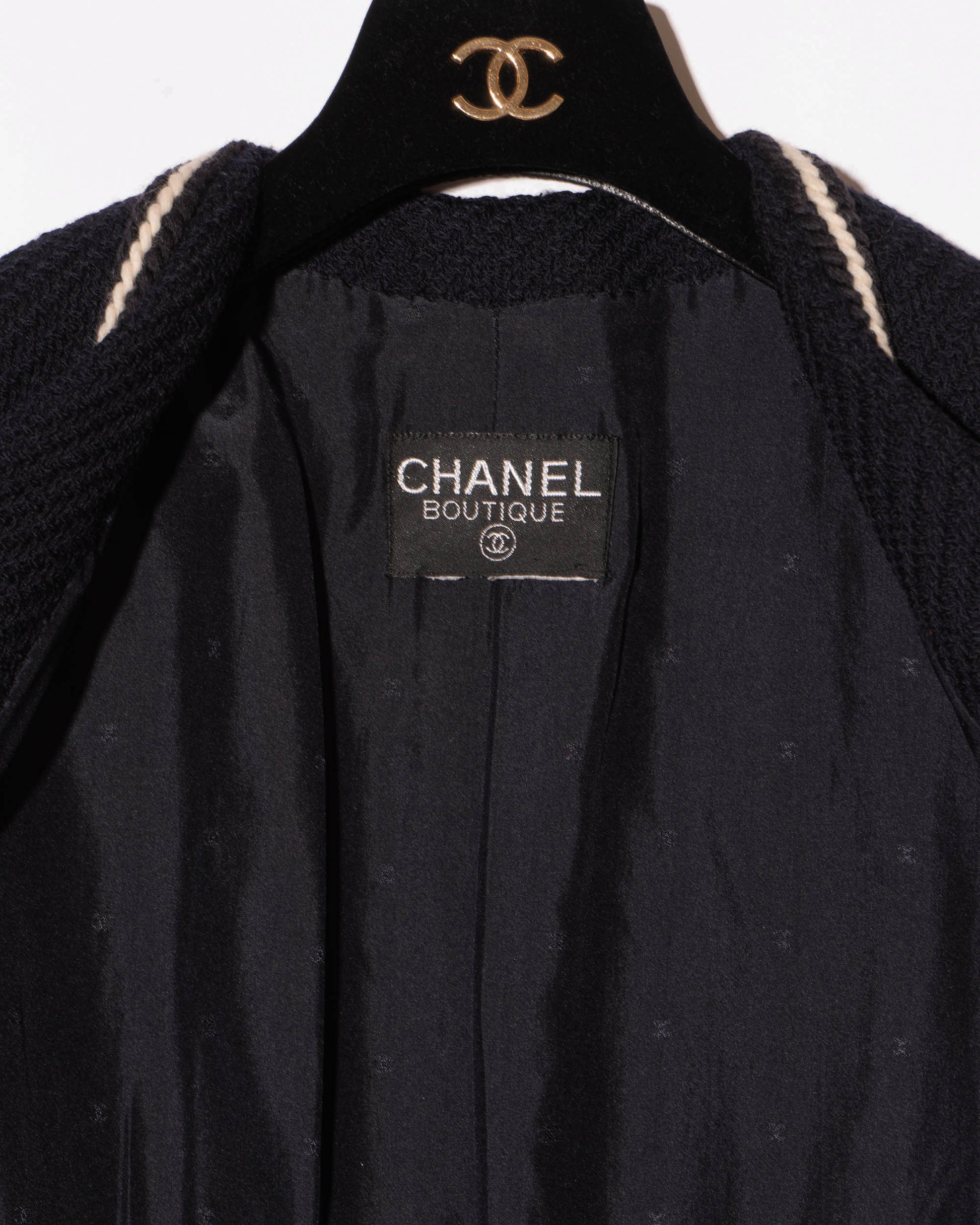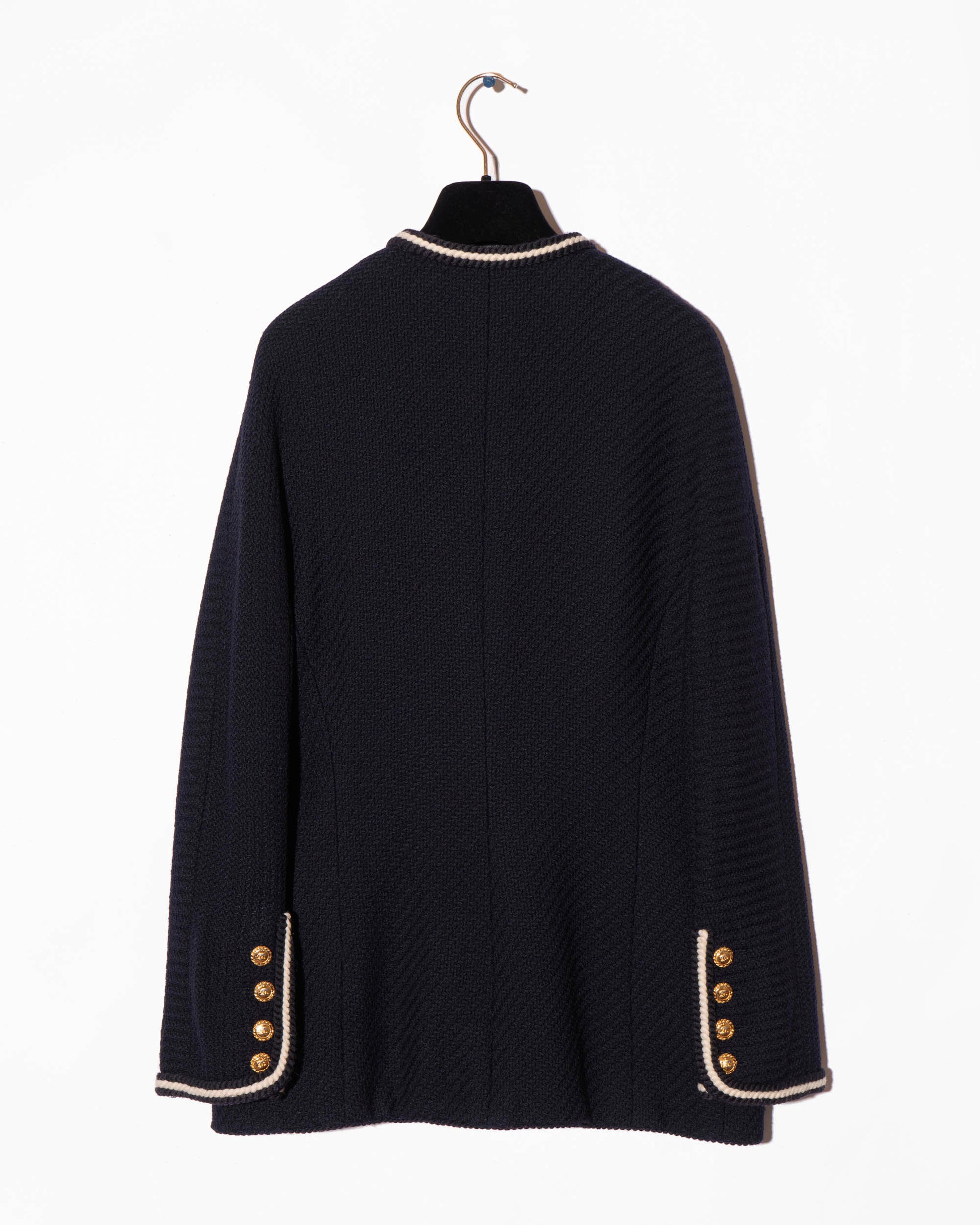 Crafted in dark navy wool tweed with a soft, cardigan-like drape, it’s framed with contrasting trim and finished with gold-plated CC logo buttons across a double-breasted front and at the cuffs. We especially love the cuff buttons — a chic and sophisticated detail that elevates the piece far beyond a simple knit cardigan.