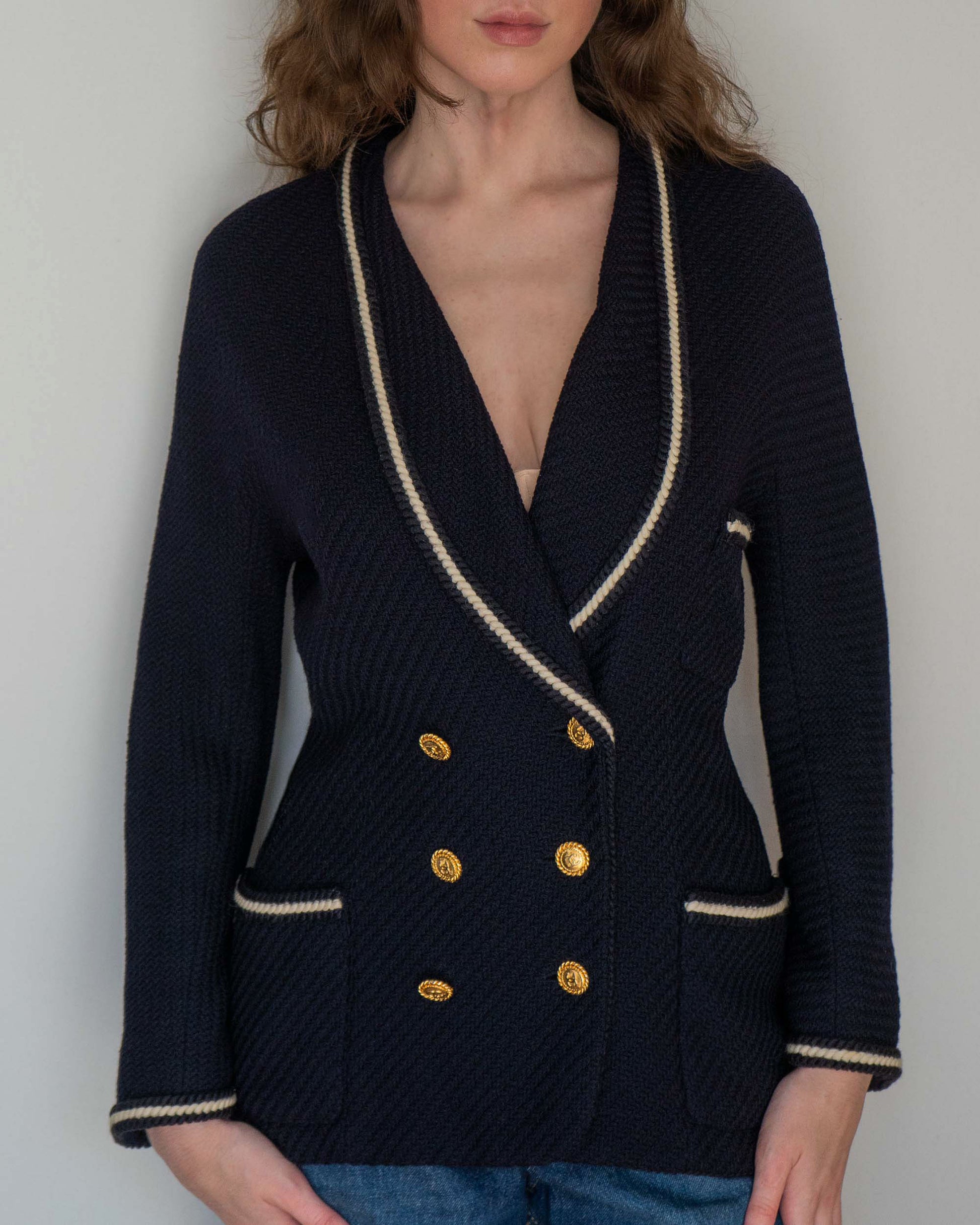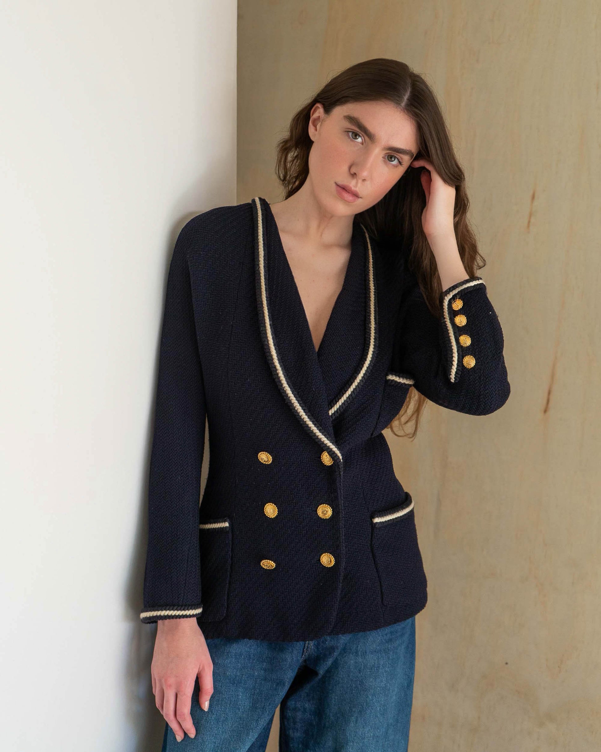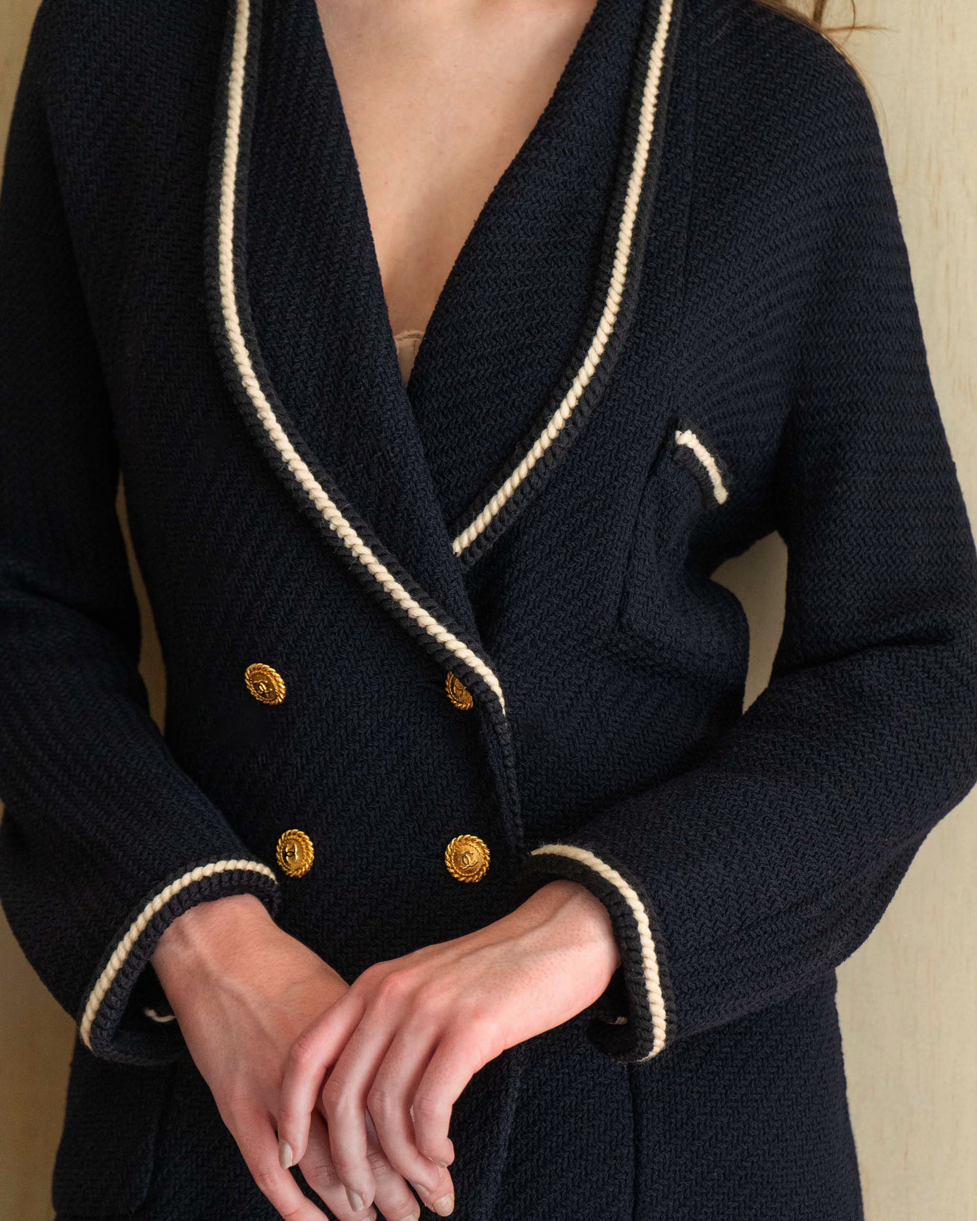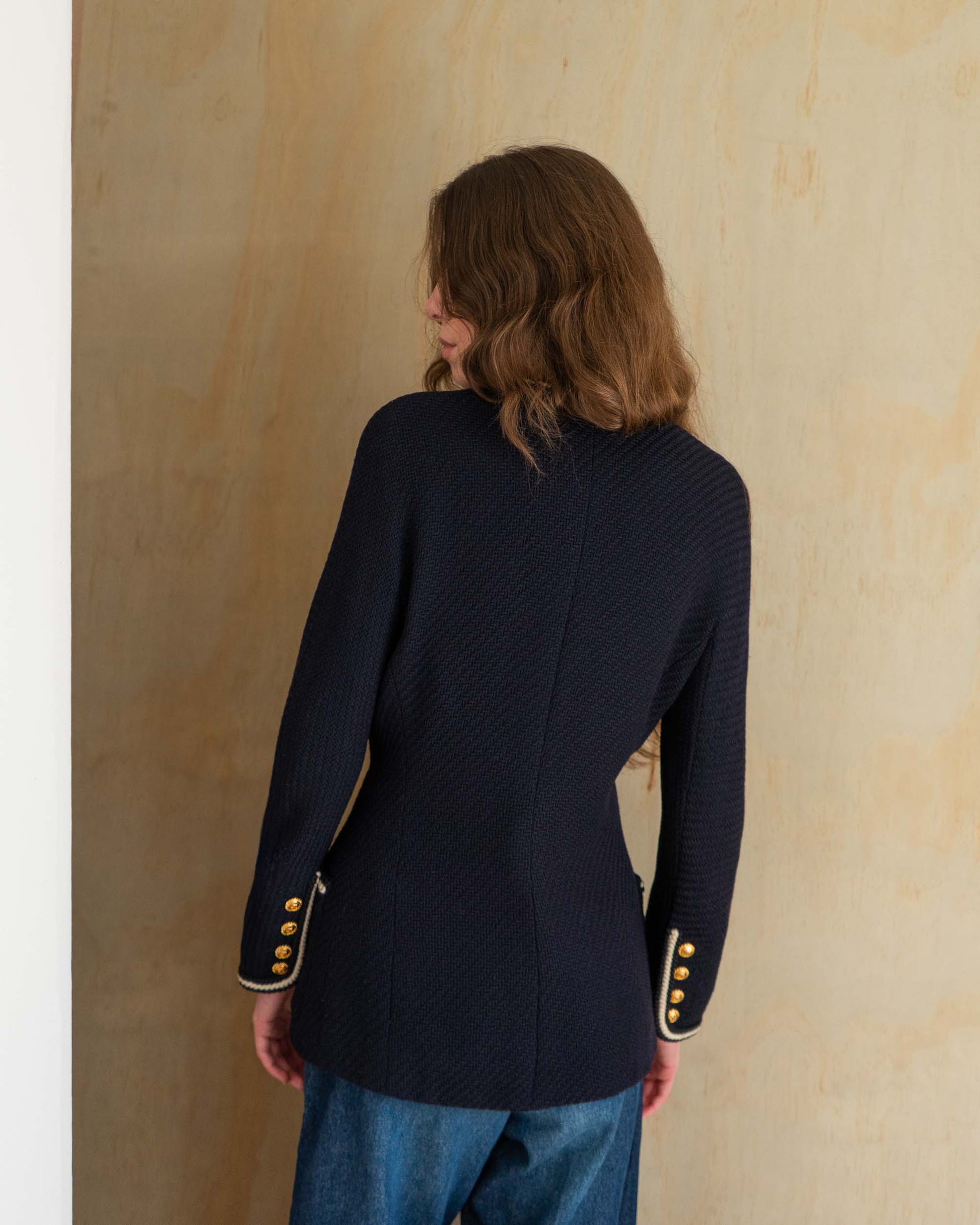 Crafted in dark navy wool tweed with a soft, cardigan-like drape, it’s framed with contrasting trim and finished with gold-plated CC logo buttons across a double-breasted front and at the cuffs. We especially love the cuff buttons — a chic and sophisticated detail that elevates the piece far beyond a simple knit cardigan.