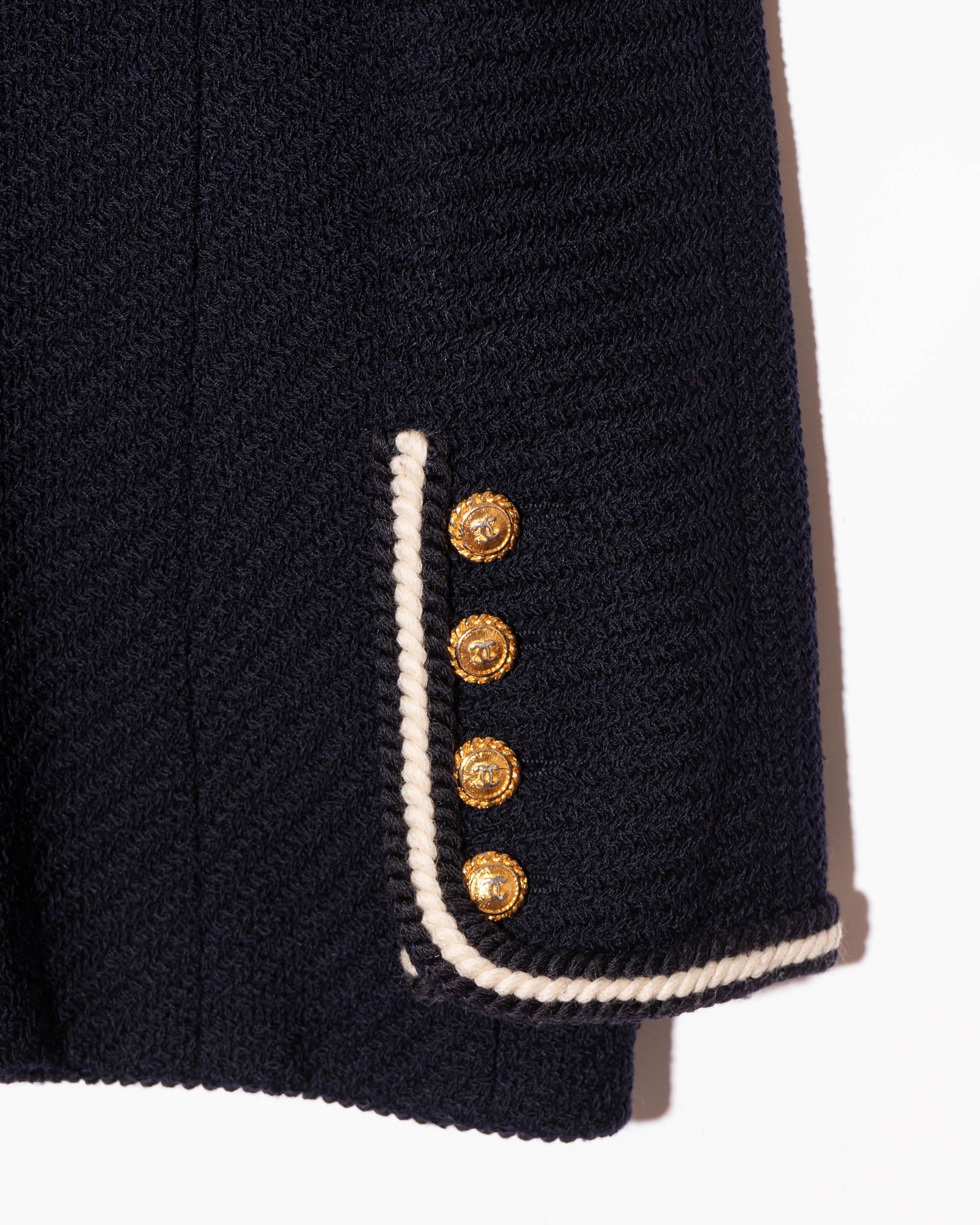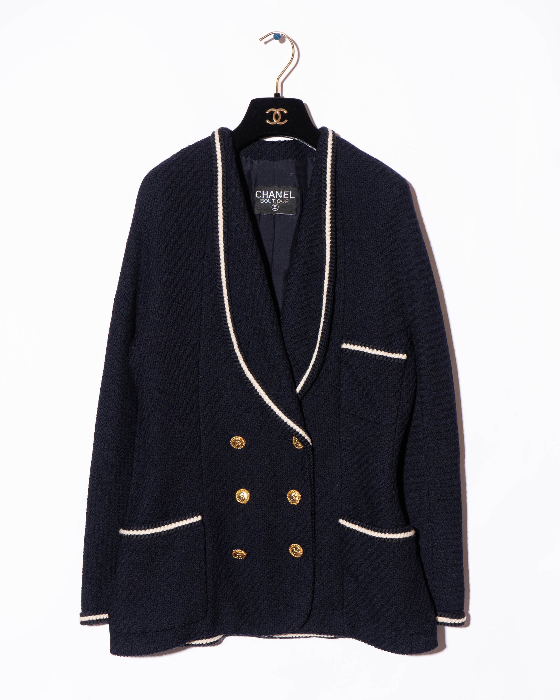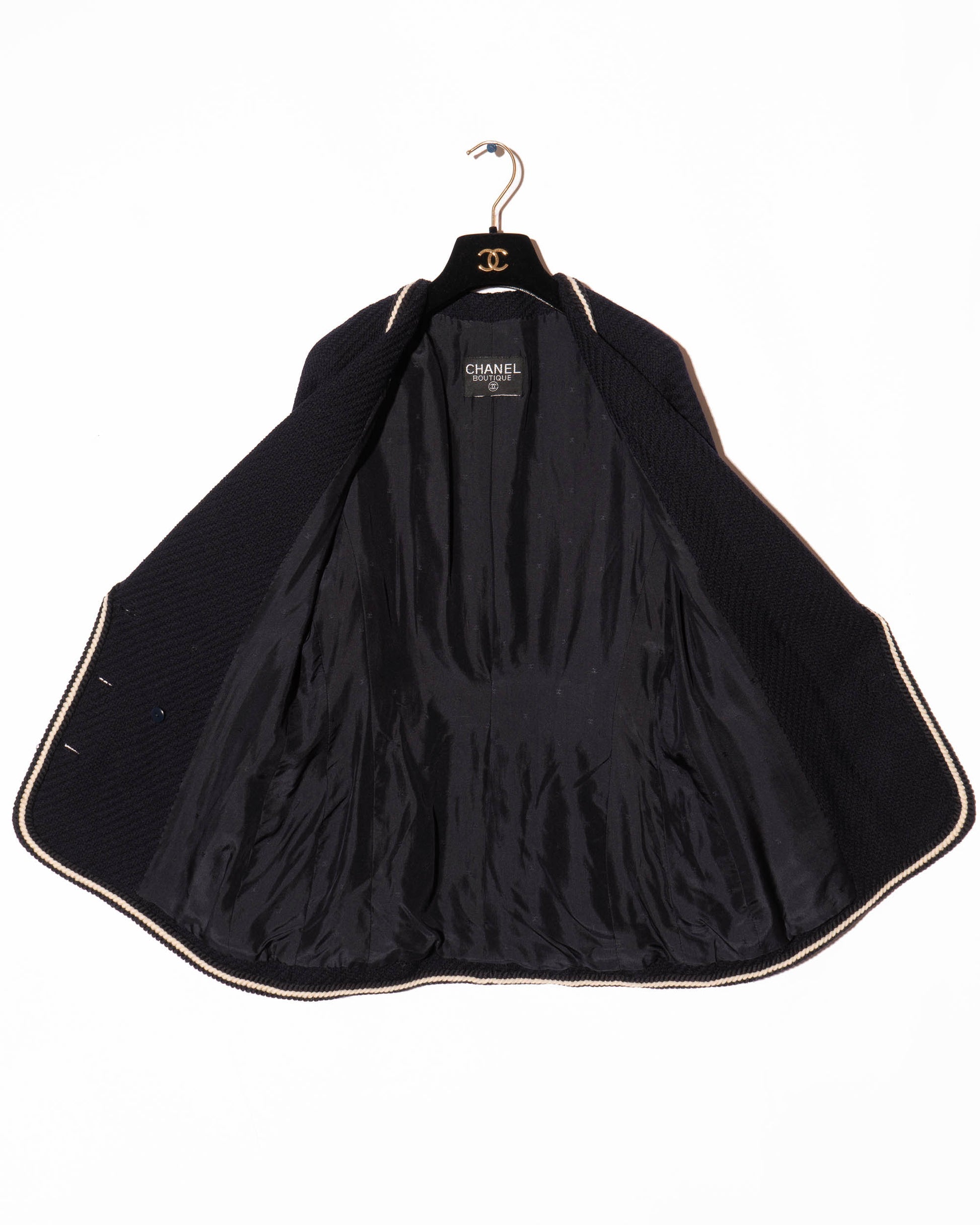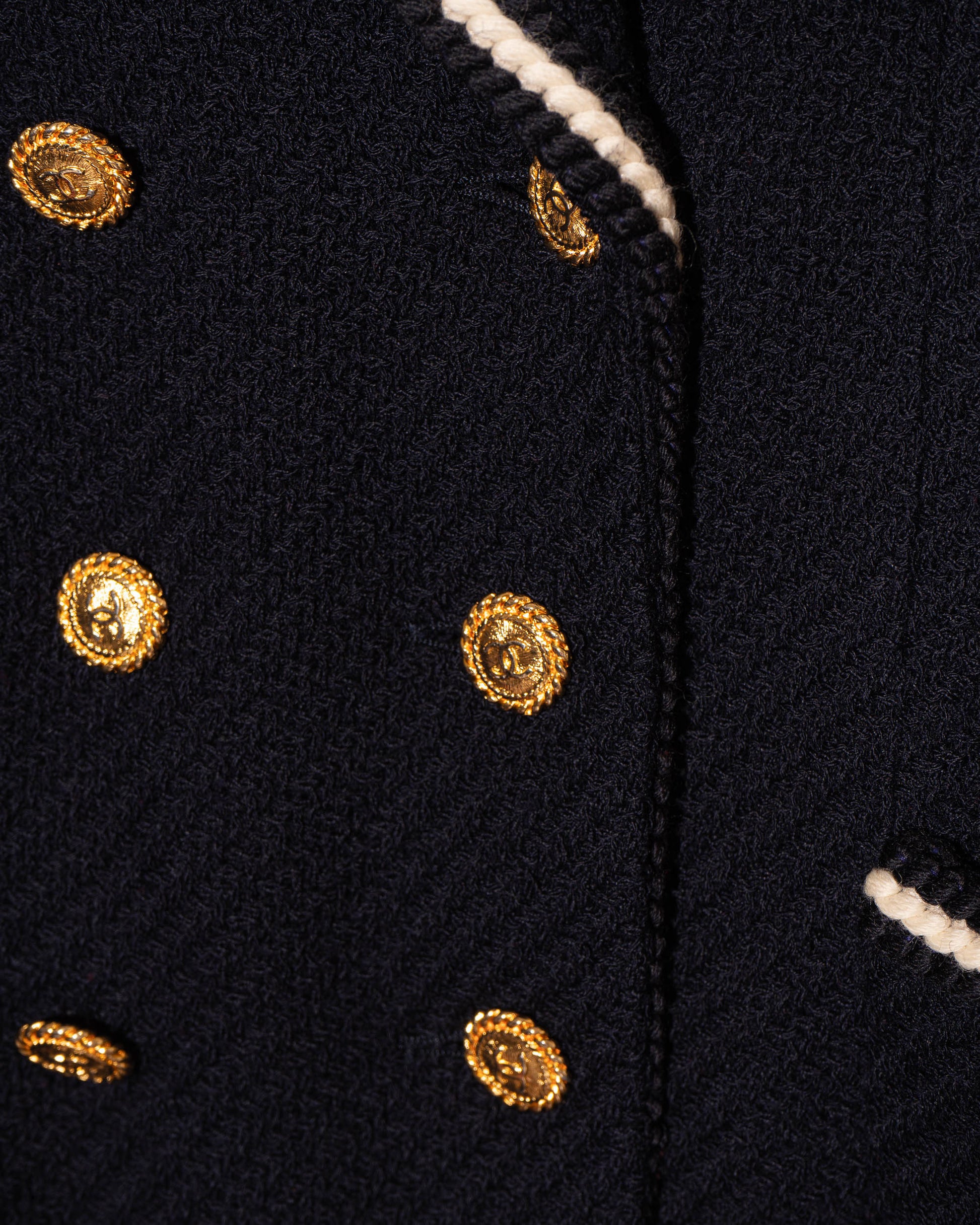 FR38-40 Chanel Fall 1988 Double Breasted Contrasting Trim Dark Navy Wool Tweed Jacket