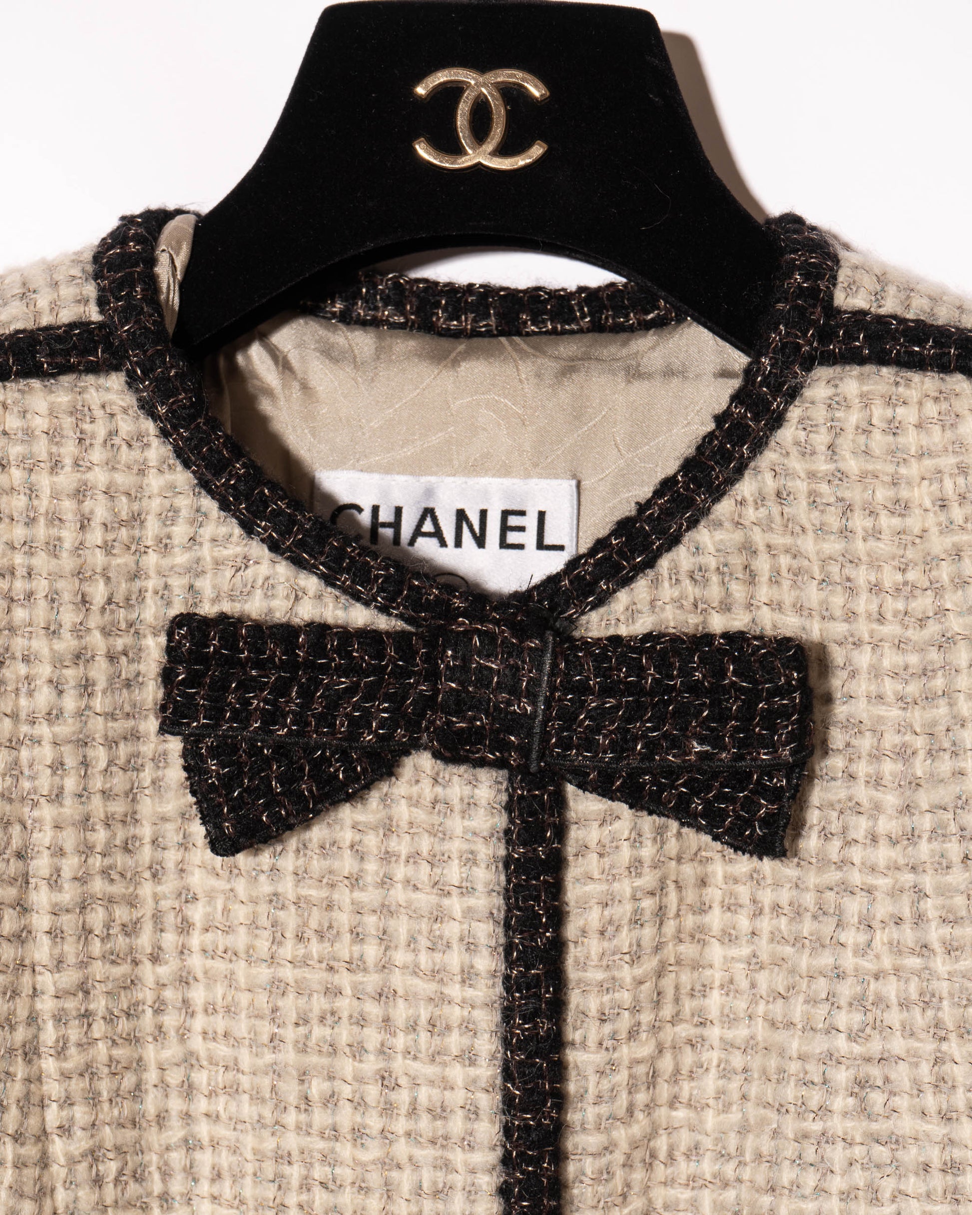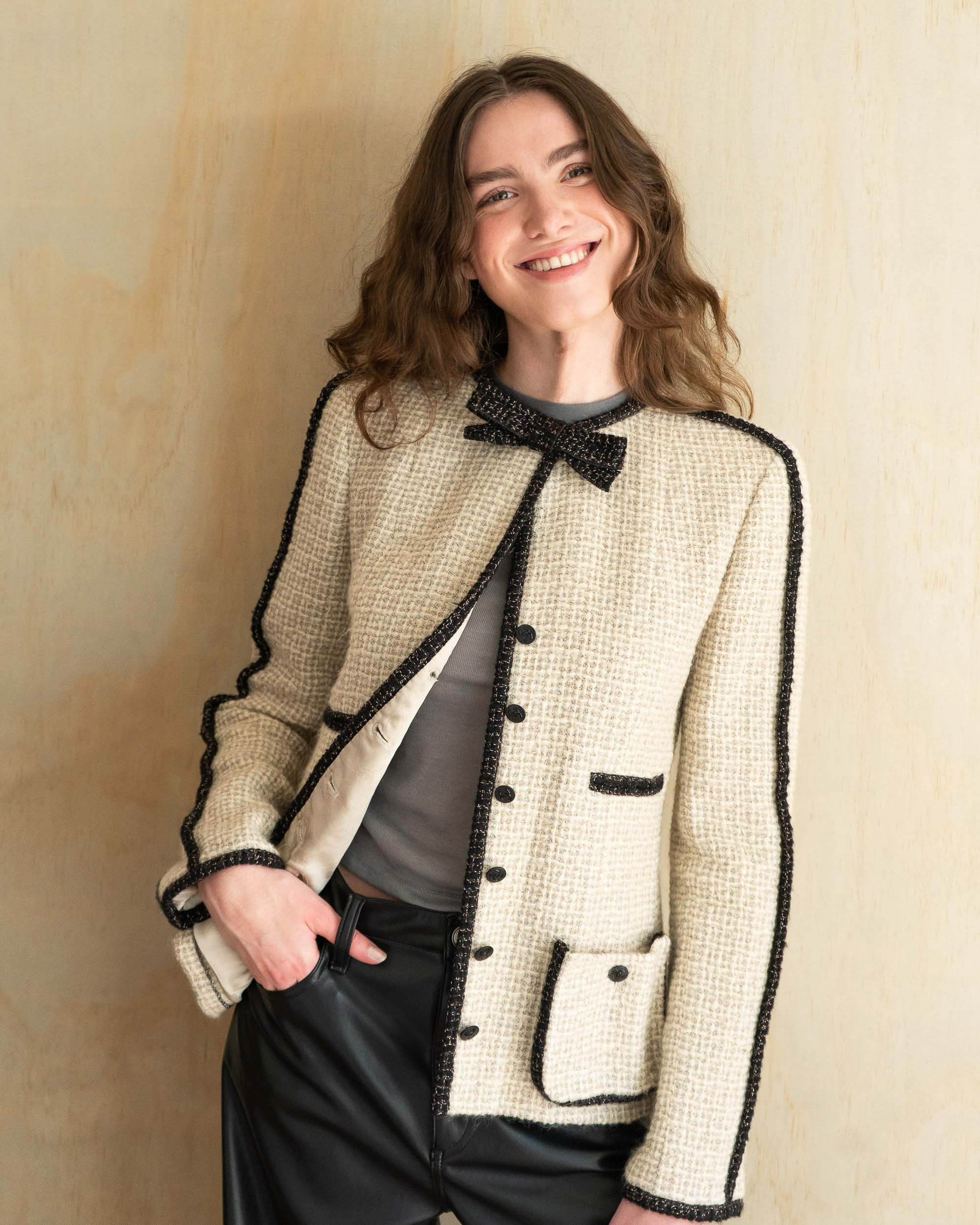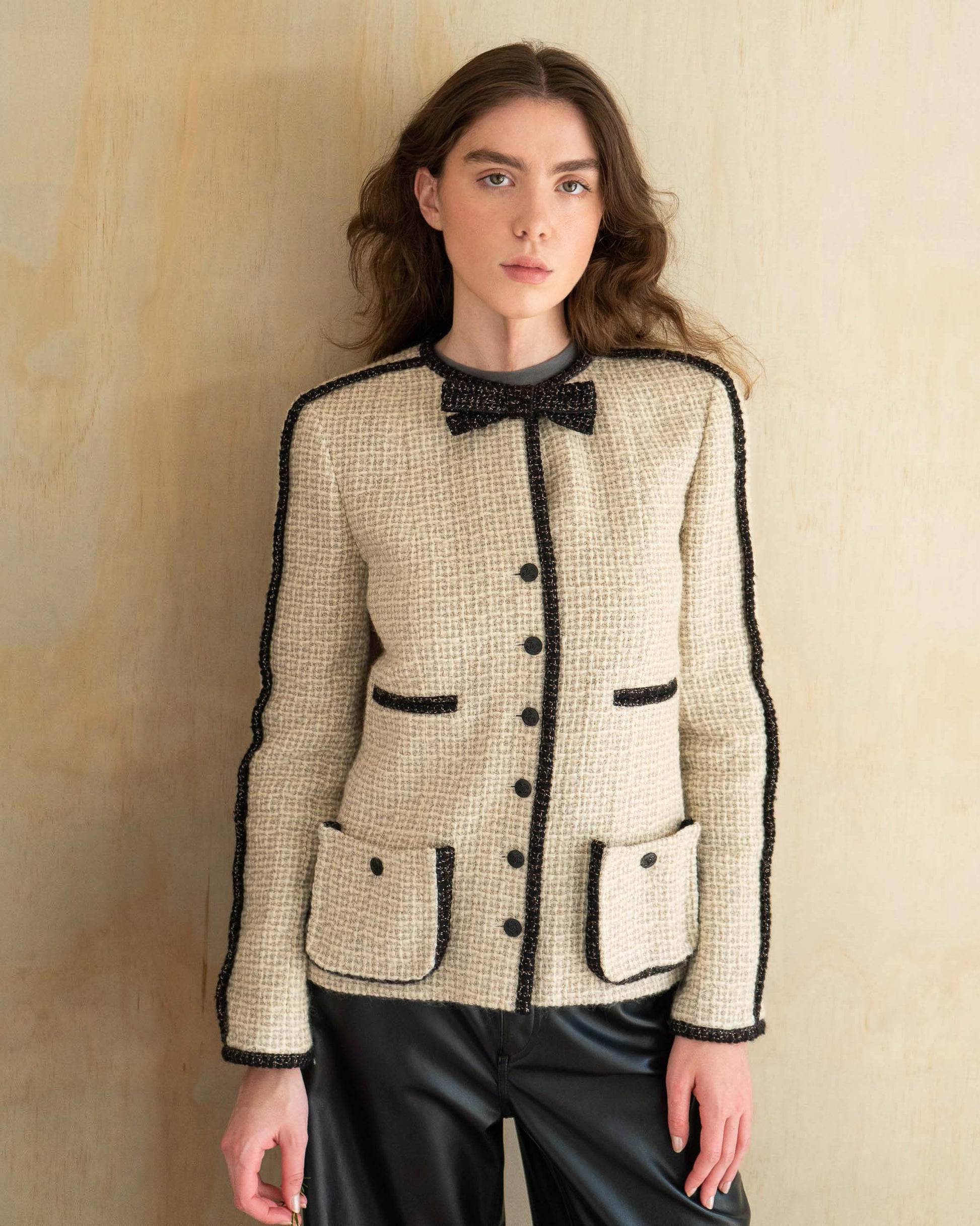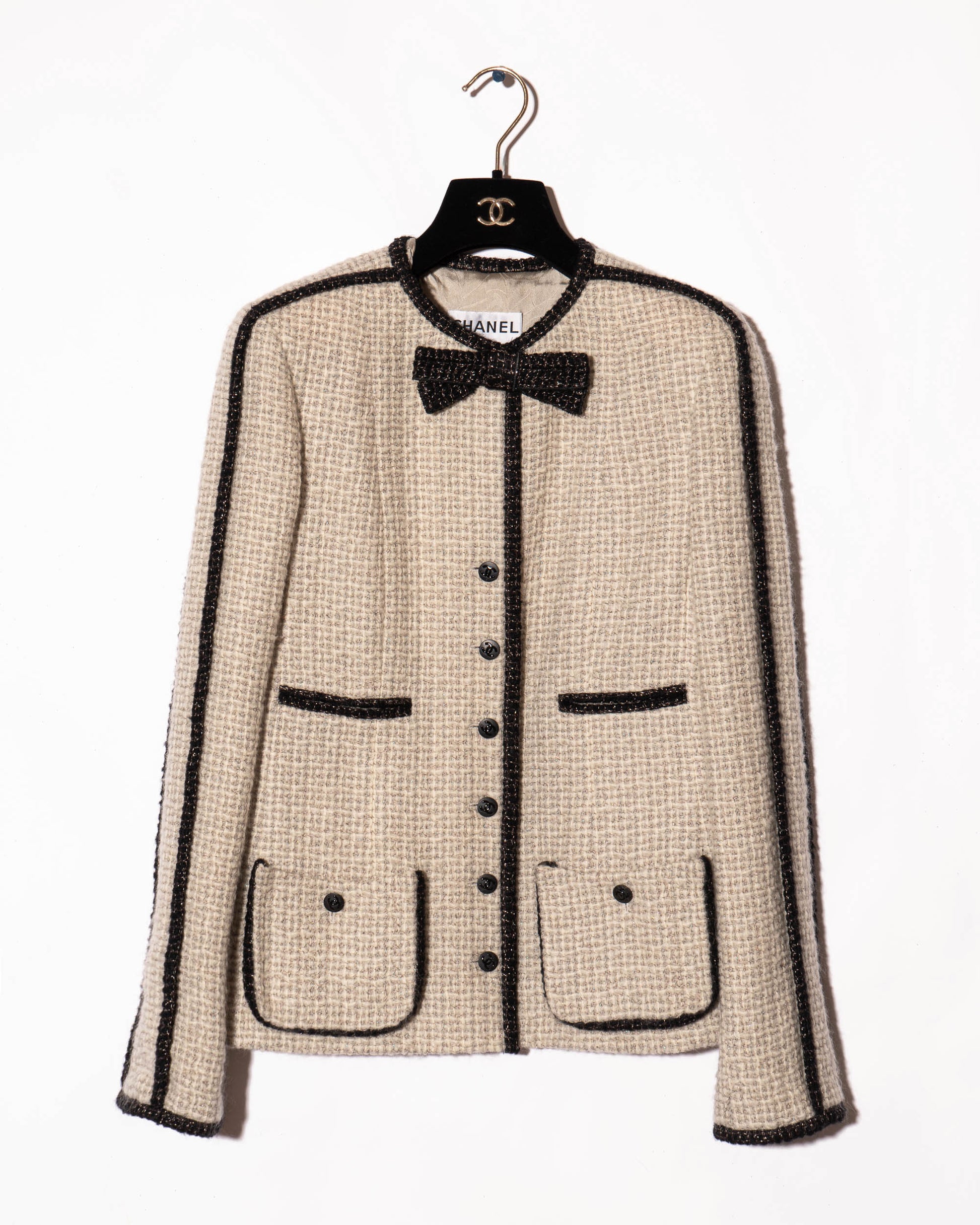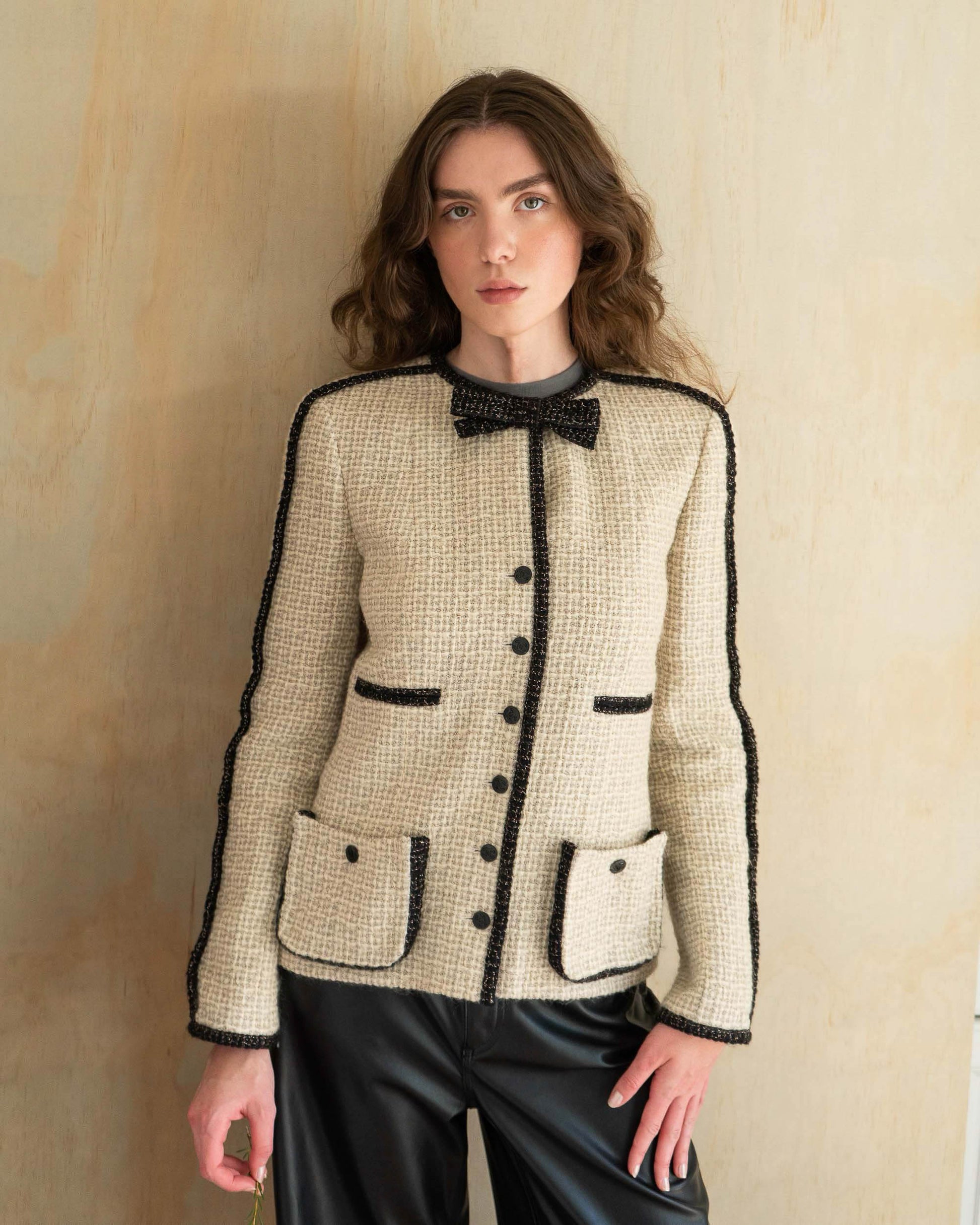 This Fall 2003 Chanel jacket feels like a sketch brought to life — clean lines framed by bold black trim, creating a graphic, almost hand-drawn effect. The bow at the collar adds a touch of playfulness, softening the structured silhouette.
