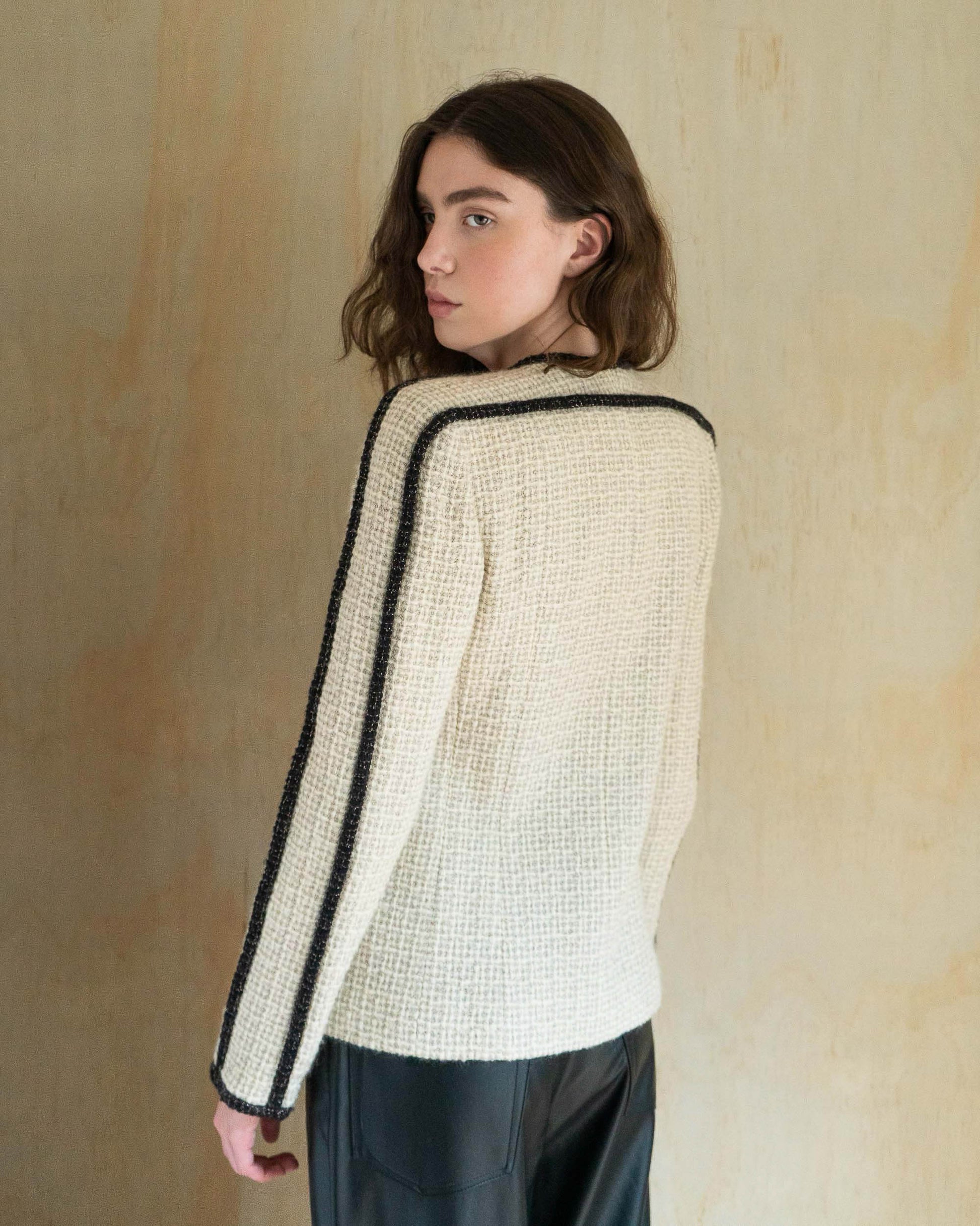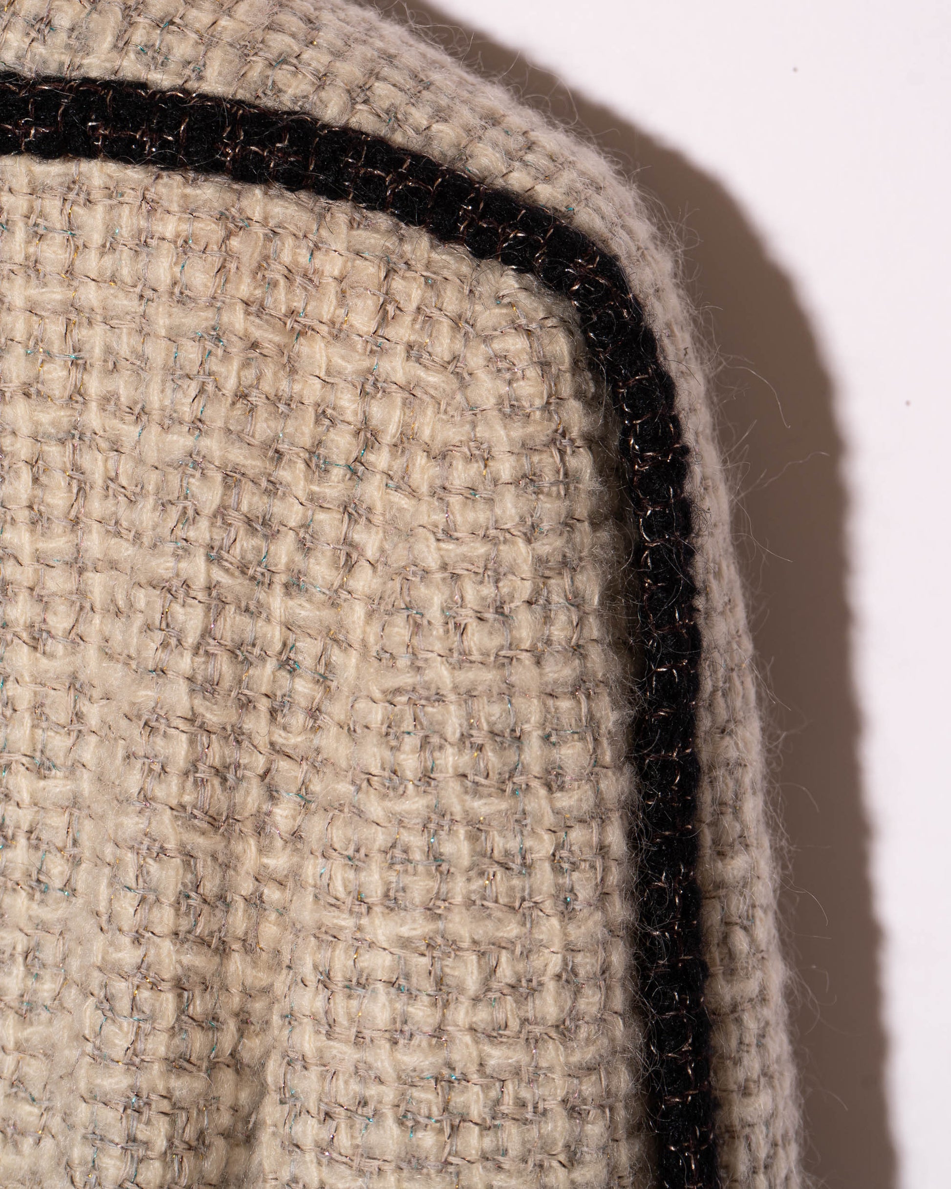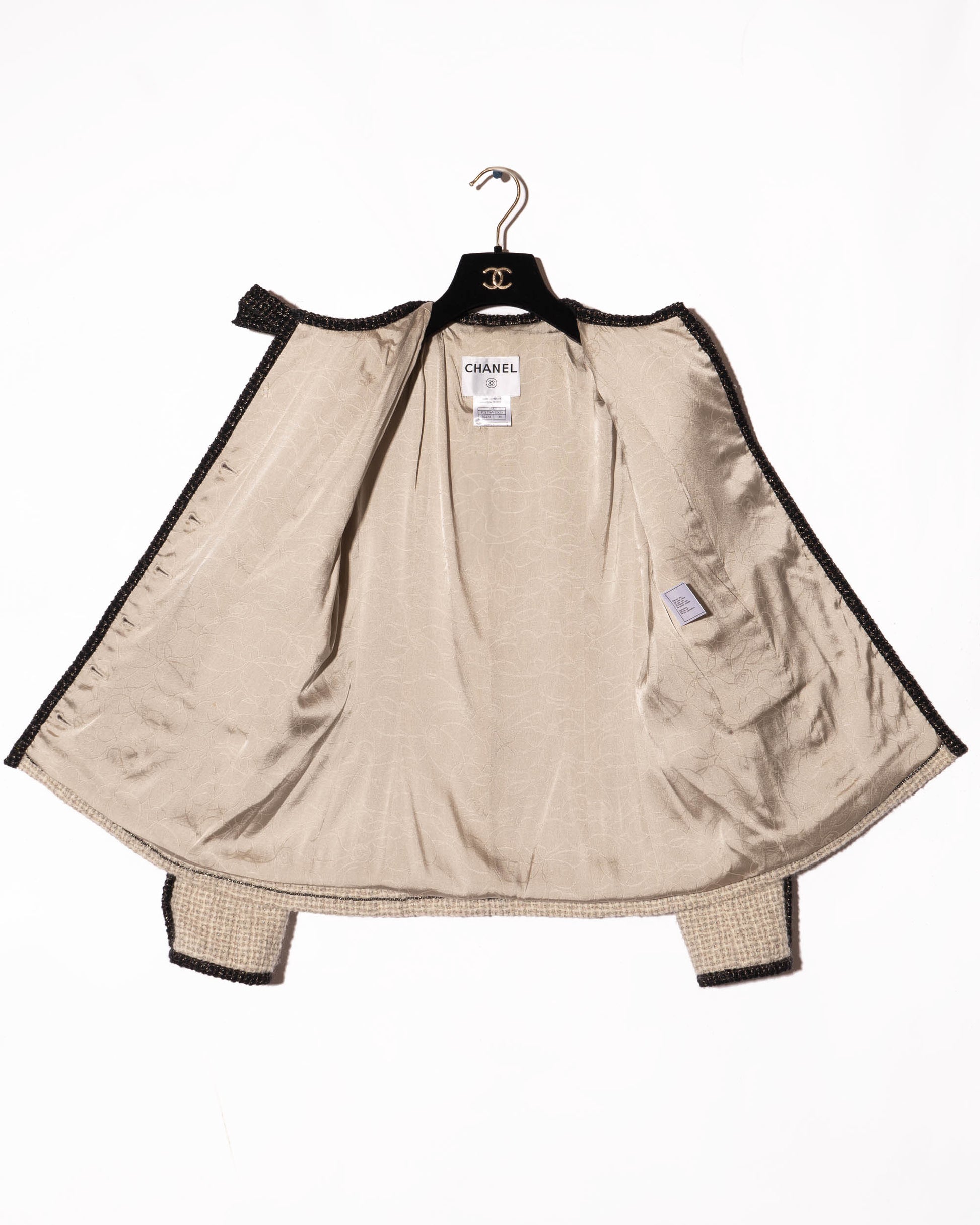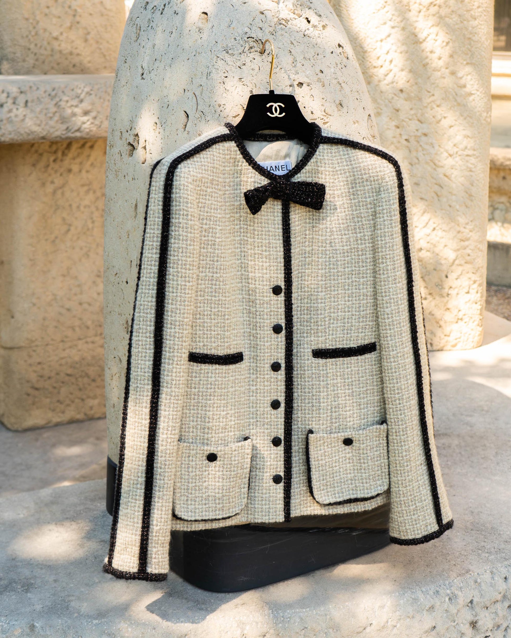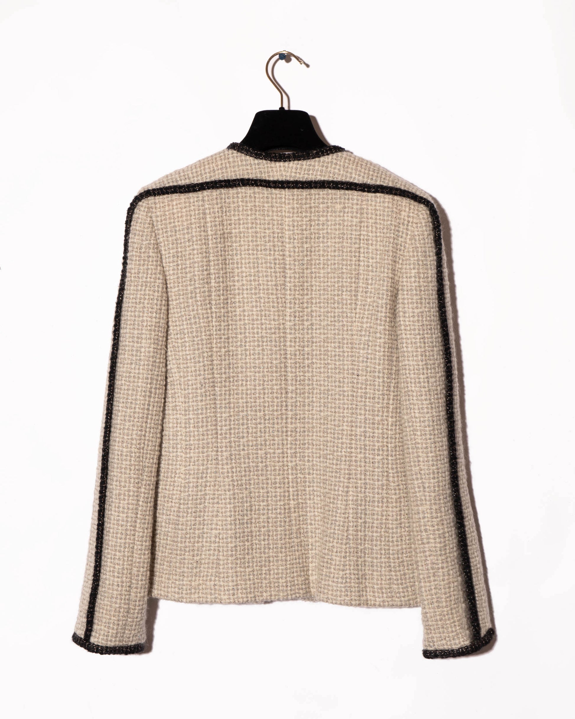 This Fall 2003 Chanel jacket feels like a sketch brought to life — clean lines framed by bold black trim, creating a graphic, almost hand-drawn effect. The bow at the collar adds a touch of playfulness, softening the structured silhouette.
