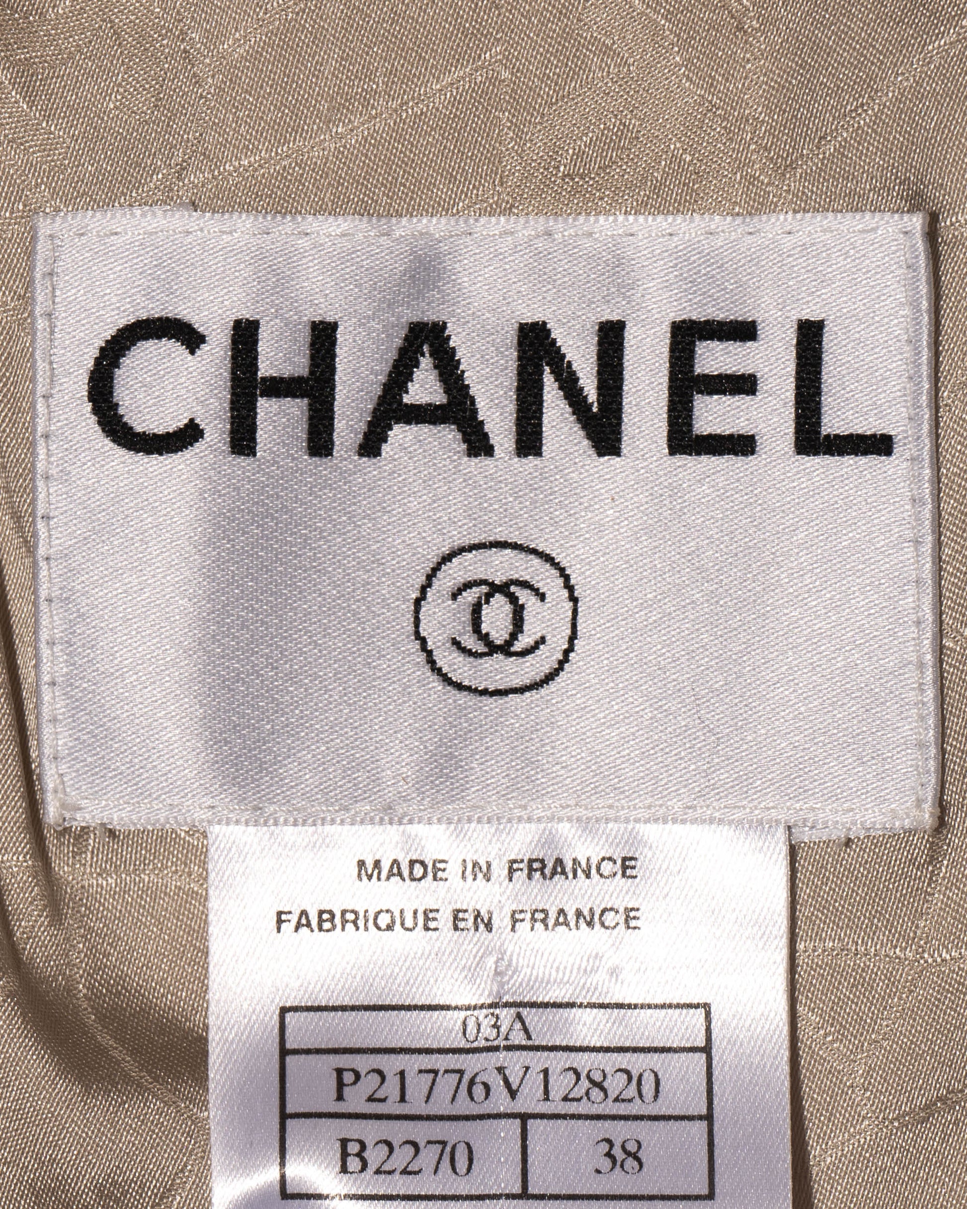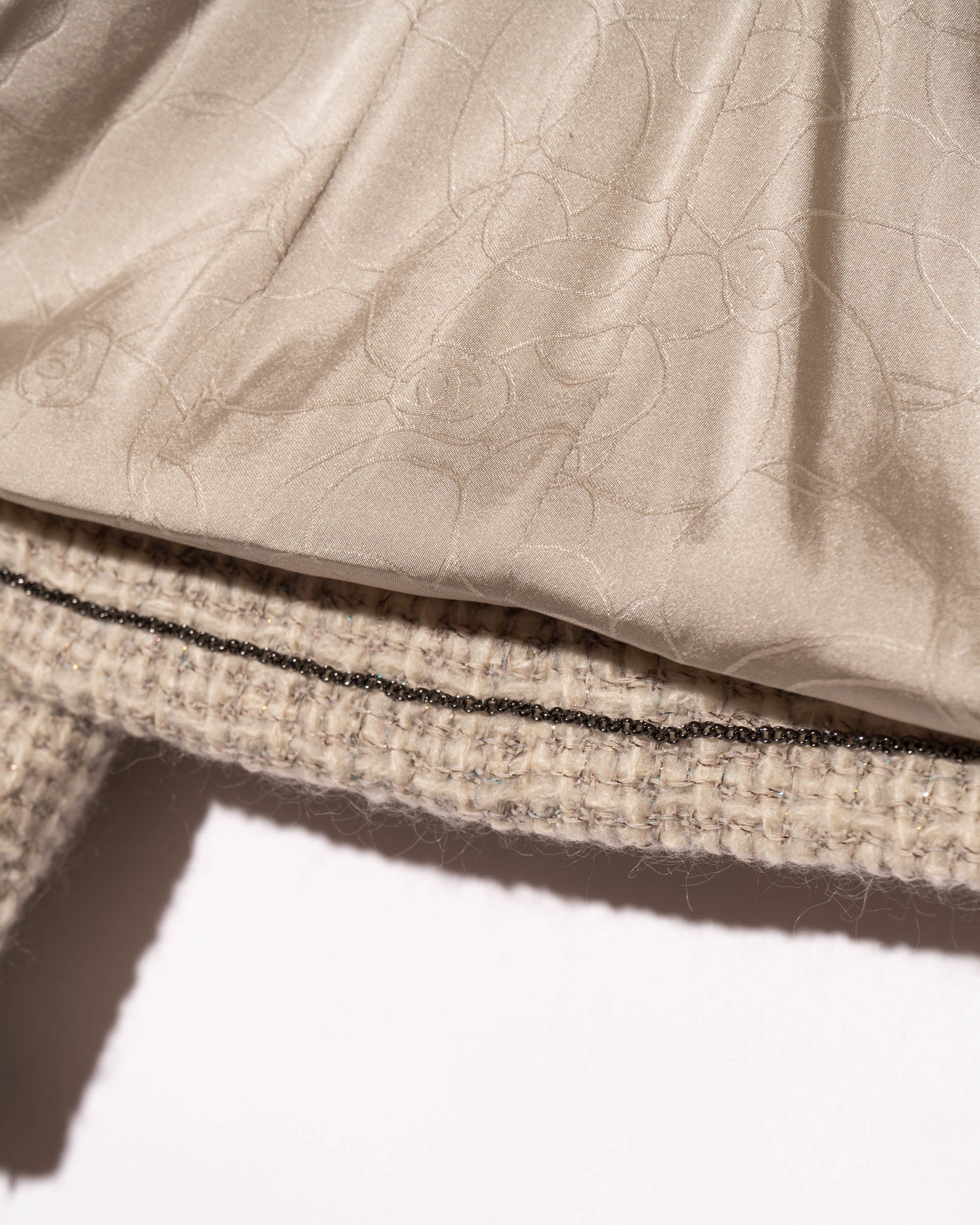 Cut in a neutral wool tweed woven with shimmering metallic thread, it balances timeless Chanel codes with subtle sparkle. Two functional pockets, silk lining, and the signature chain at the hem complete the piece.