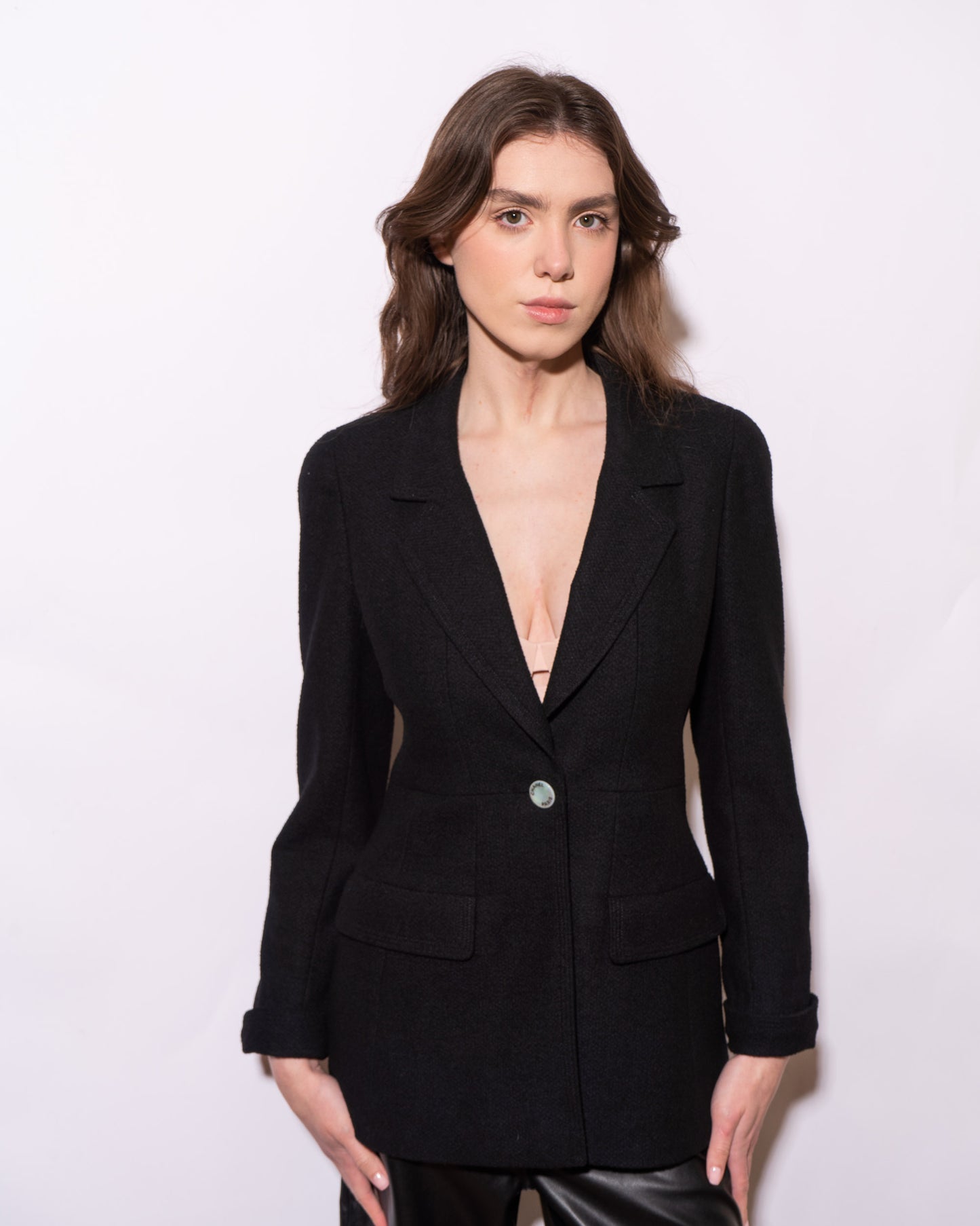 From Chanel's Spring 1997 collection comes this exquisite black tweed jacket. A classic design by Karl Lagerfeld, it features two front pockets for a blend of elegance and practicality. The standout mother of pearl buttons, etched with 'Chanel Paris,' add a touch of refined detail. The jacket's structure offers a timeless silhouette, while the luxurious silk lining provides an indulgent touch, ensuring the garment drapes beautifully, thanks to the weighted chain at the hem. It's a testament to Chanel's enduring legacy of combining classic style with meticulous craftsmanship.
