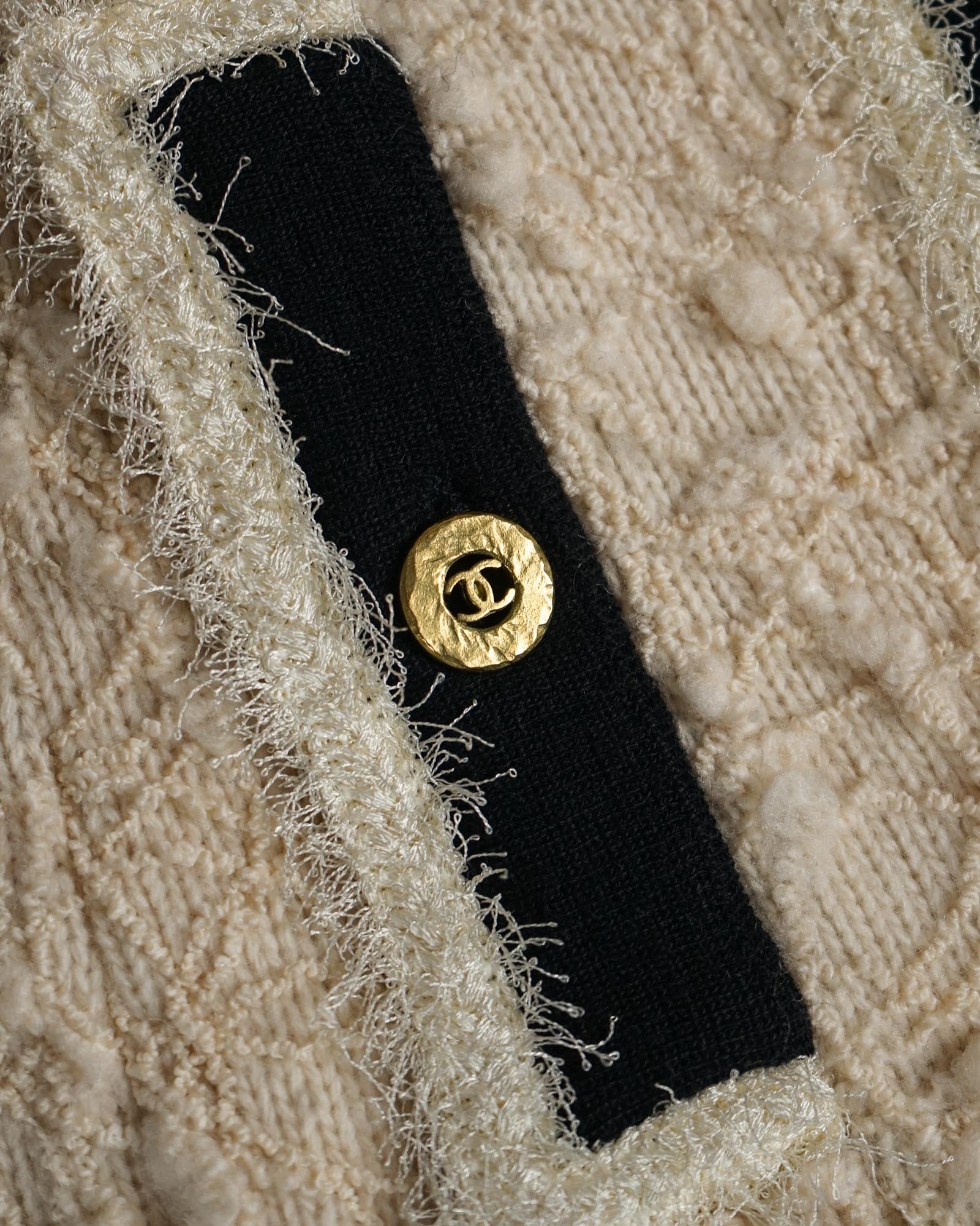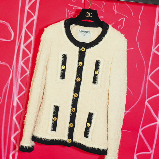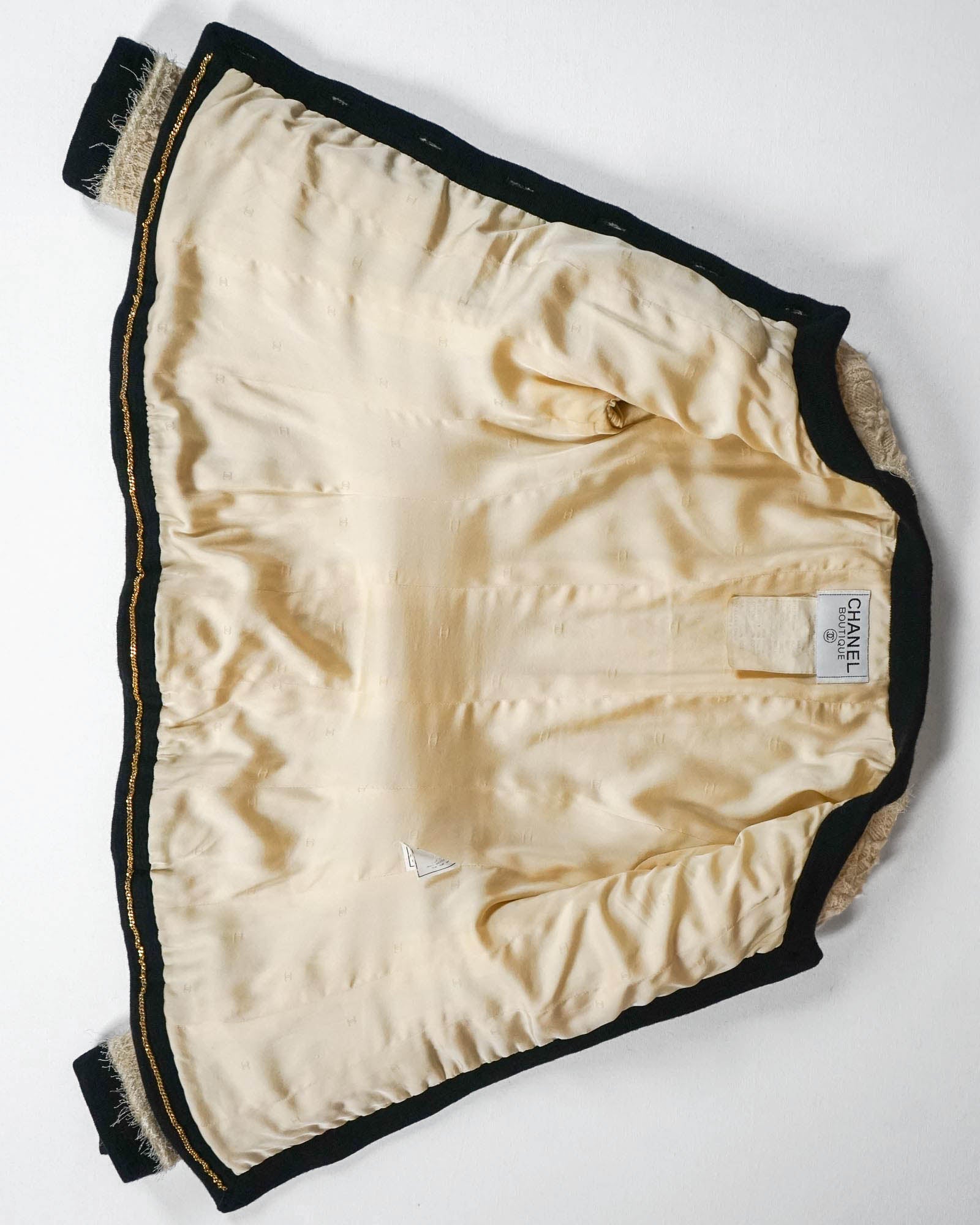 From Chanel’s Fall 1994 collection, this cream and black jacket is one of the defining looks of the season, worn on the runway by Claudia Schiffer. The tweed is richly textured with raised abstract motifs and soft fringe that catches the light. Black knit trim anchors the shape, framing the front and pockets with bold contrast. Finished with a full row of gold CC buttons, including at the cuffs.