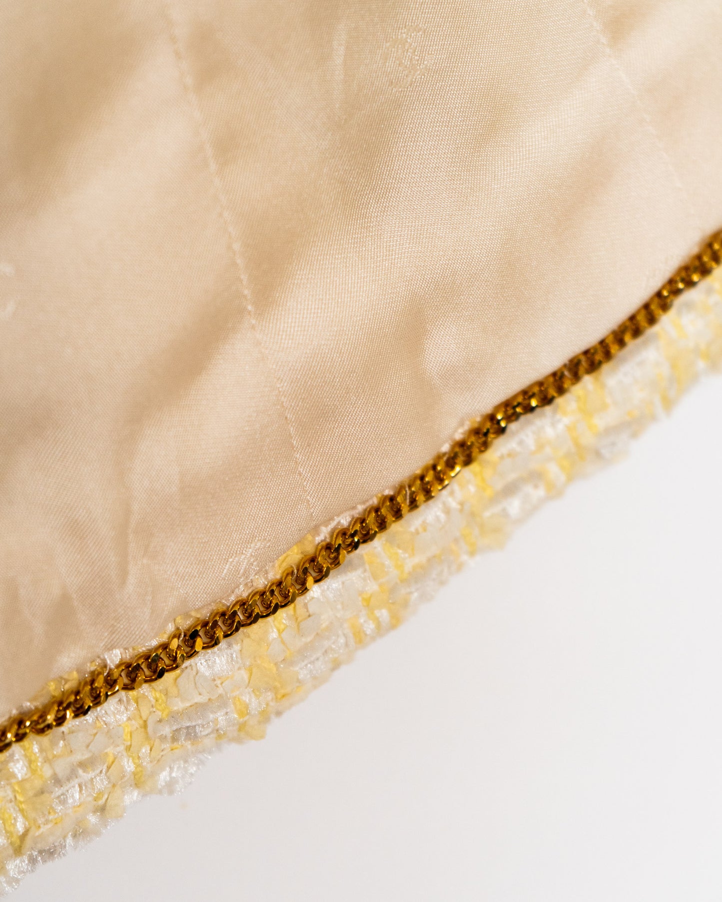 From the Cruise 1996 collection, this exceptionally rare piece, designed by Karl Lagerfeld for Chanel, stands as a testament to exquisite design. The double-breasted fantasy tweed jacket, weaving together white and yellow yarns, presents a soft pastel yellow tone.