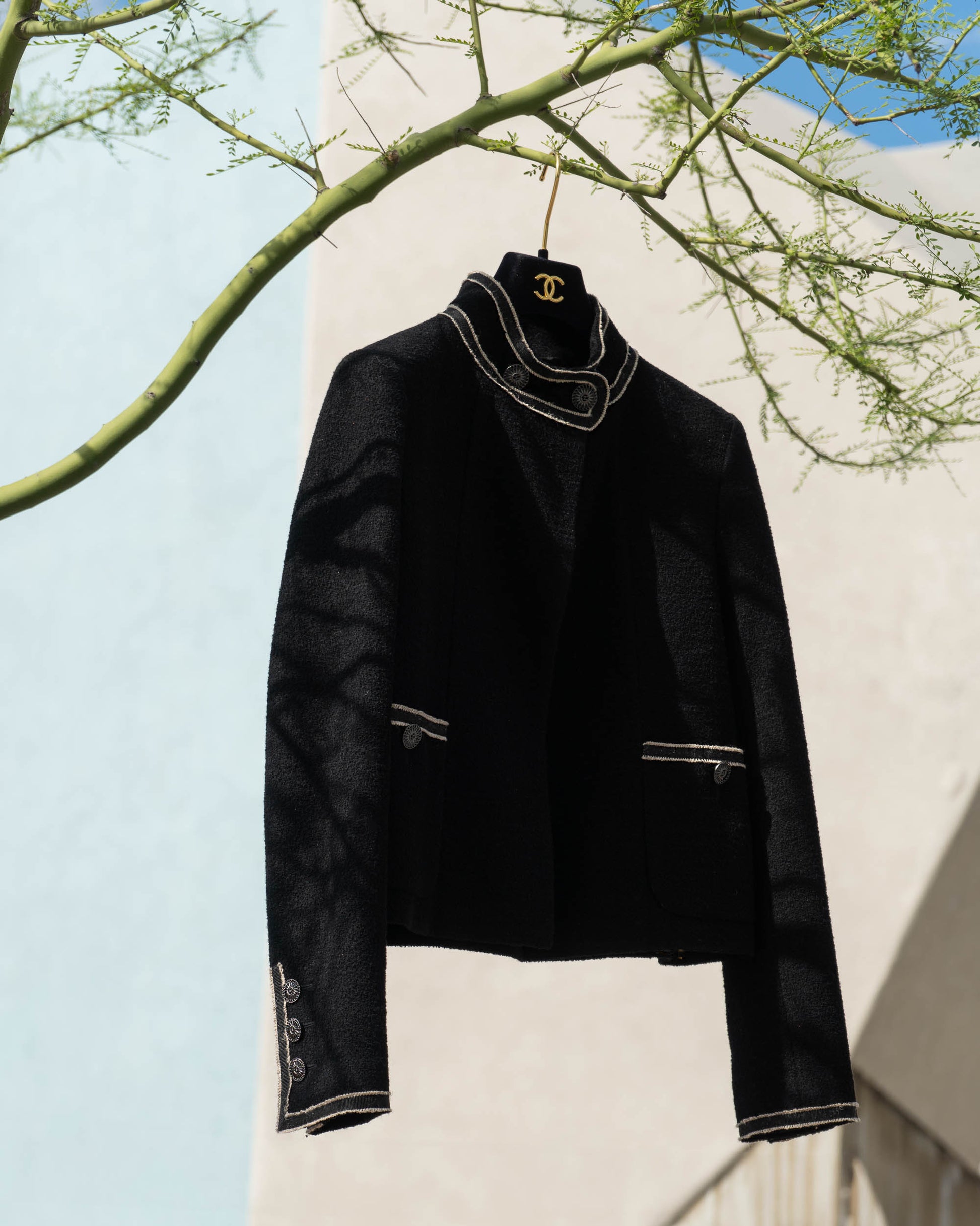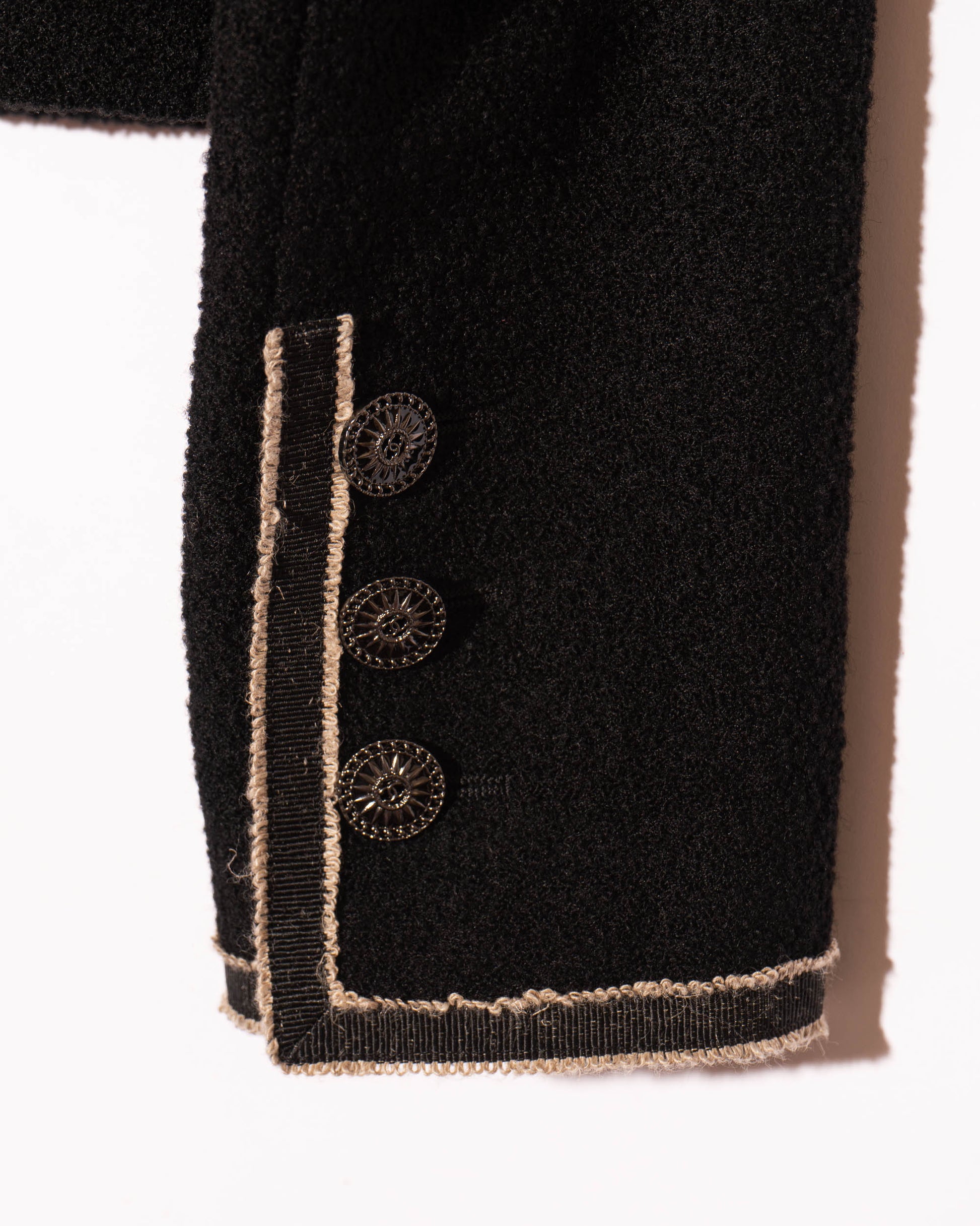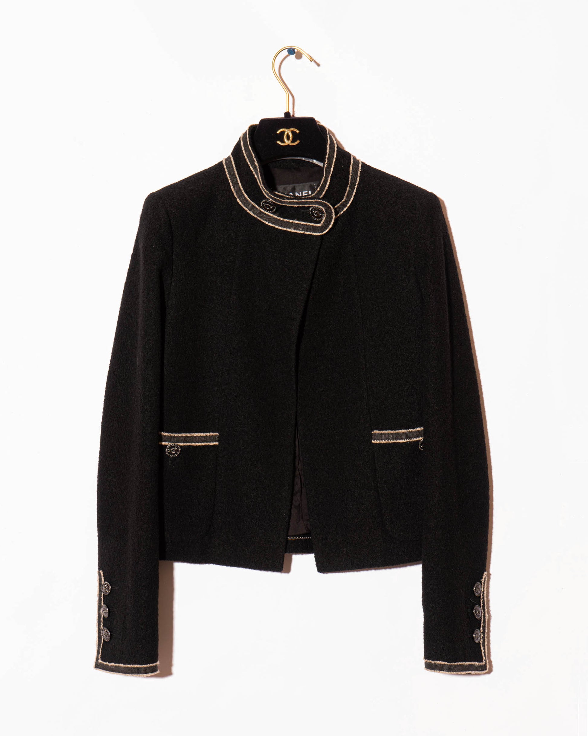 This rare Chanel jacket comes from the 2014 Paris–Singapore Métiers d’Art collection designed by Karl Lagerfeld. The silhouette is sharp and modern, with military-inspired detailing at the collar and cuffs. Woven black wool bouclé is trimmed with intricate braiding, while the engraved gunmetal buttons offer a more contemporary contrast to traditional CC hardware. Fully lined in silk and finished with a weighted chain hem, this is an understated yet meticulously crafted piece that nods to Chanel’s codes through a fresh, structured lens.