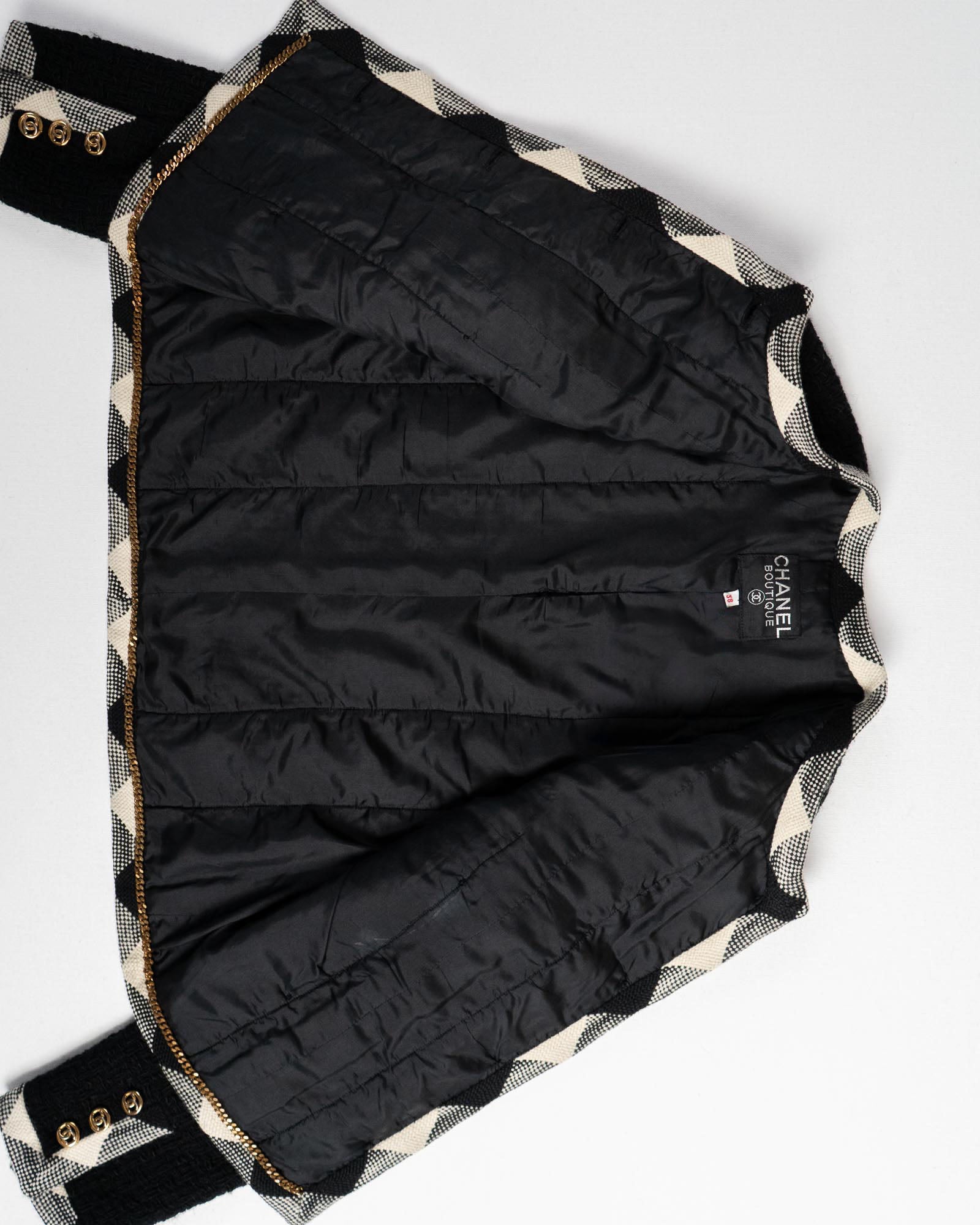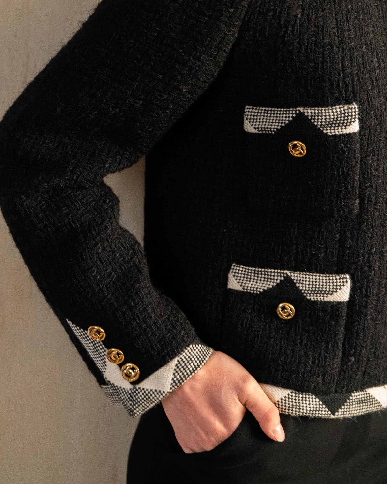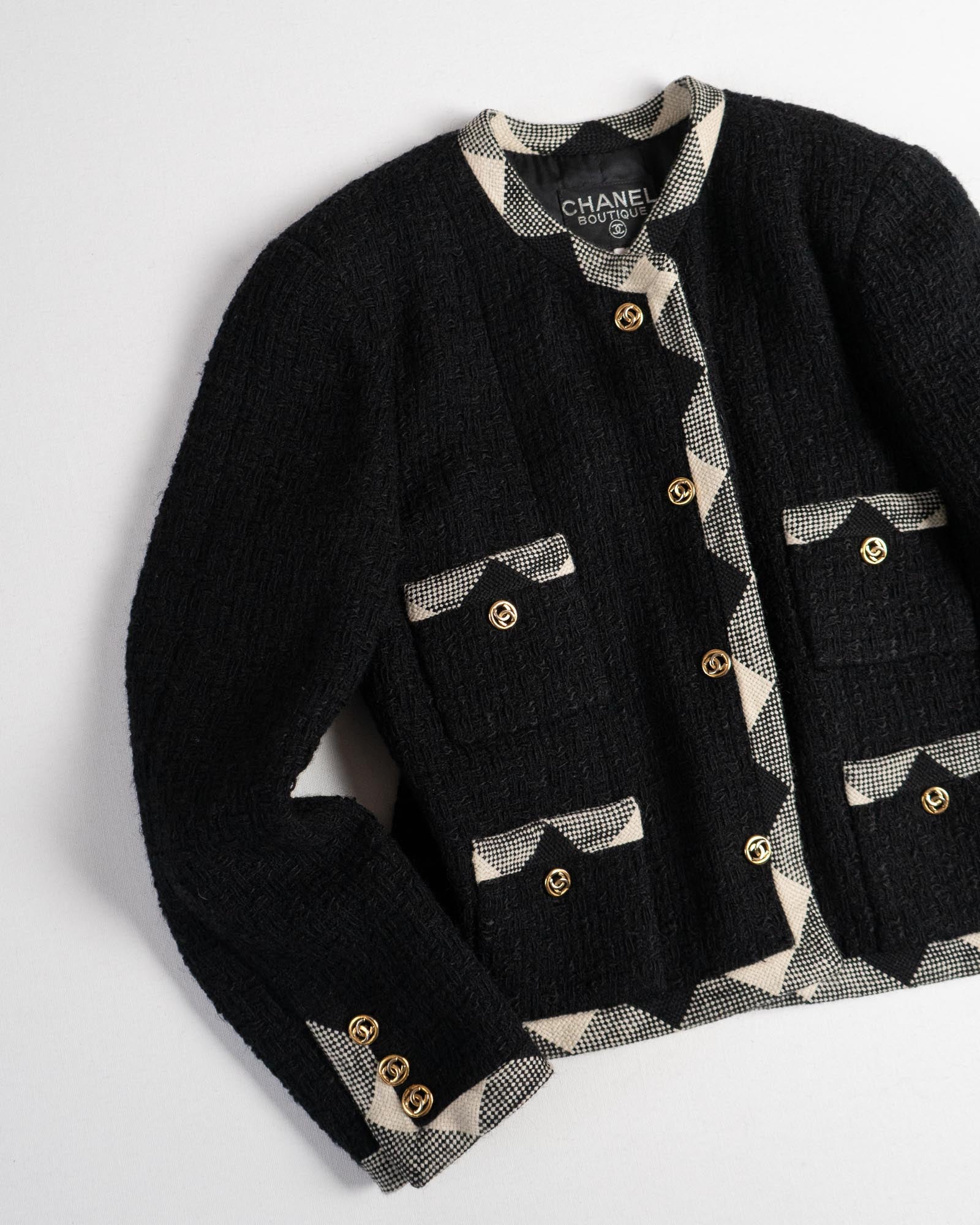 This Chanel jacket from the 1980s is a timeless example of the house’s mastery of texture, proportion, and everyday elegance. Crafted in black wool tweed, it features a classic structured silhouette with a rounded collar and classic patch pockets that give it a relaxed yet polished feel. note contracting ball and while trim that frames the piece.