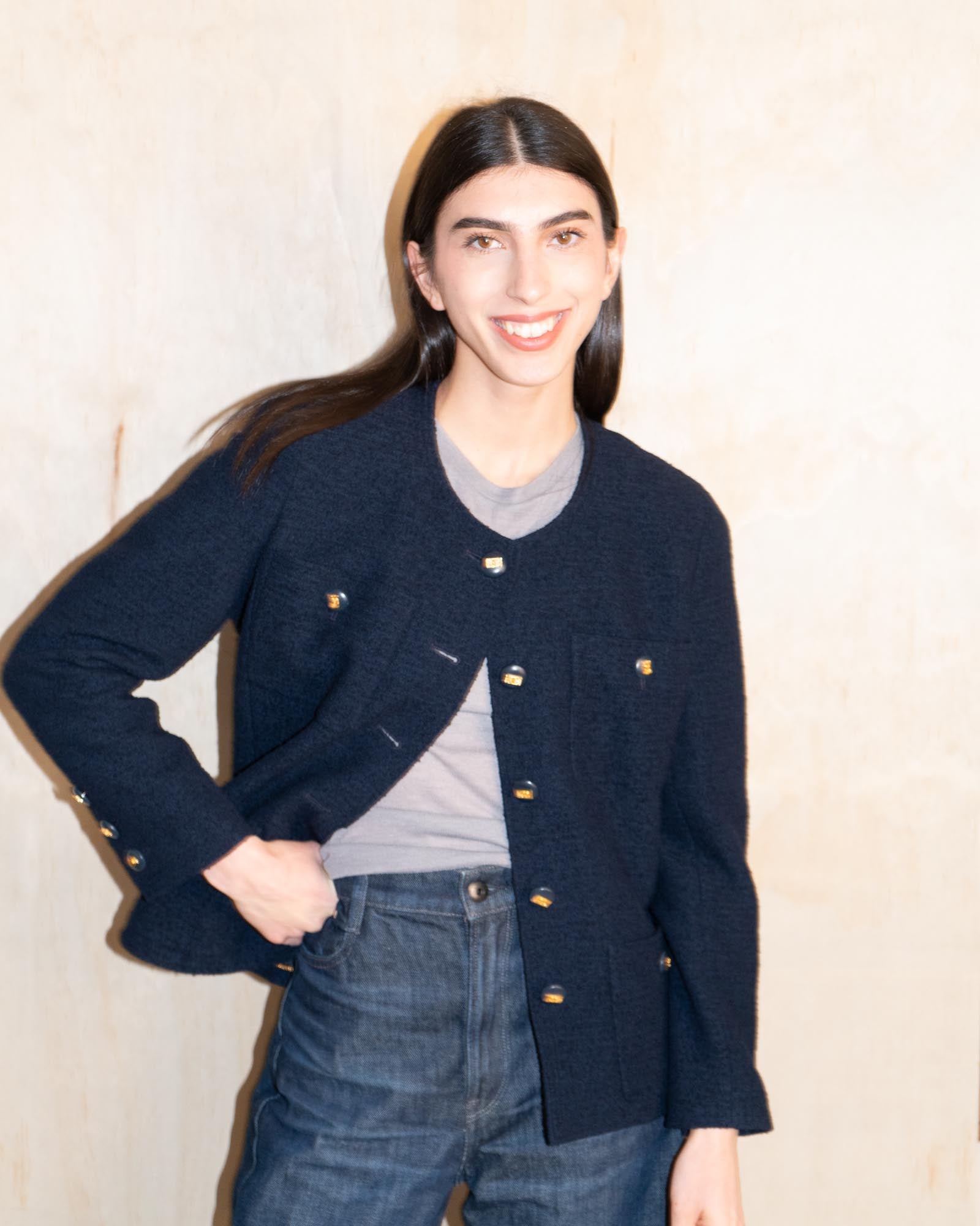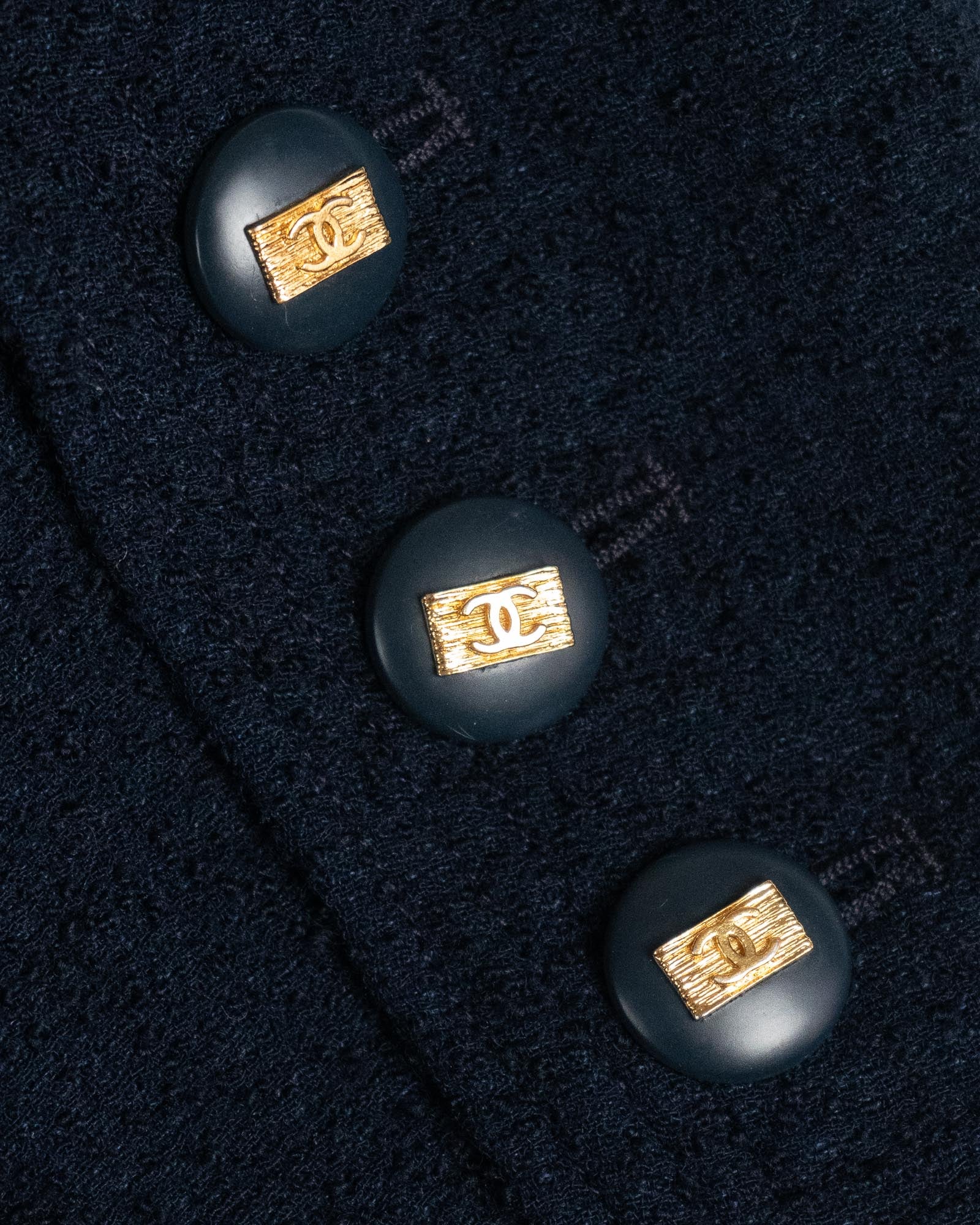 Finished with iconic gold-tone CC buttons at the front, pockets, and cuffs, the jacket balances quiet luxury with unmistakable Chanel codes.