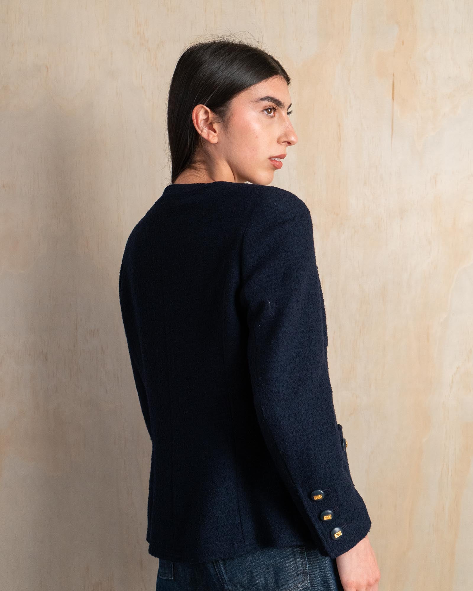 This Chanel jacket from the Cruise 1992 collection is a timeless example of the house’s mastery of texture, proportion, and everyday elegance. Crafted in deep navy tweed, it features a classic structured silhouette with a rounded collar and classic patch pockets that give it a relaxed yet polished feel.