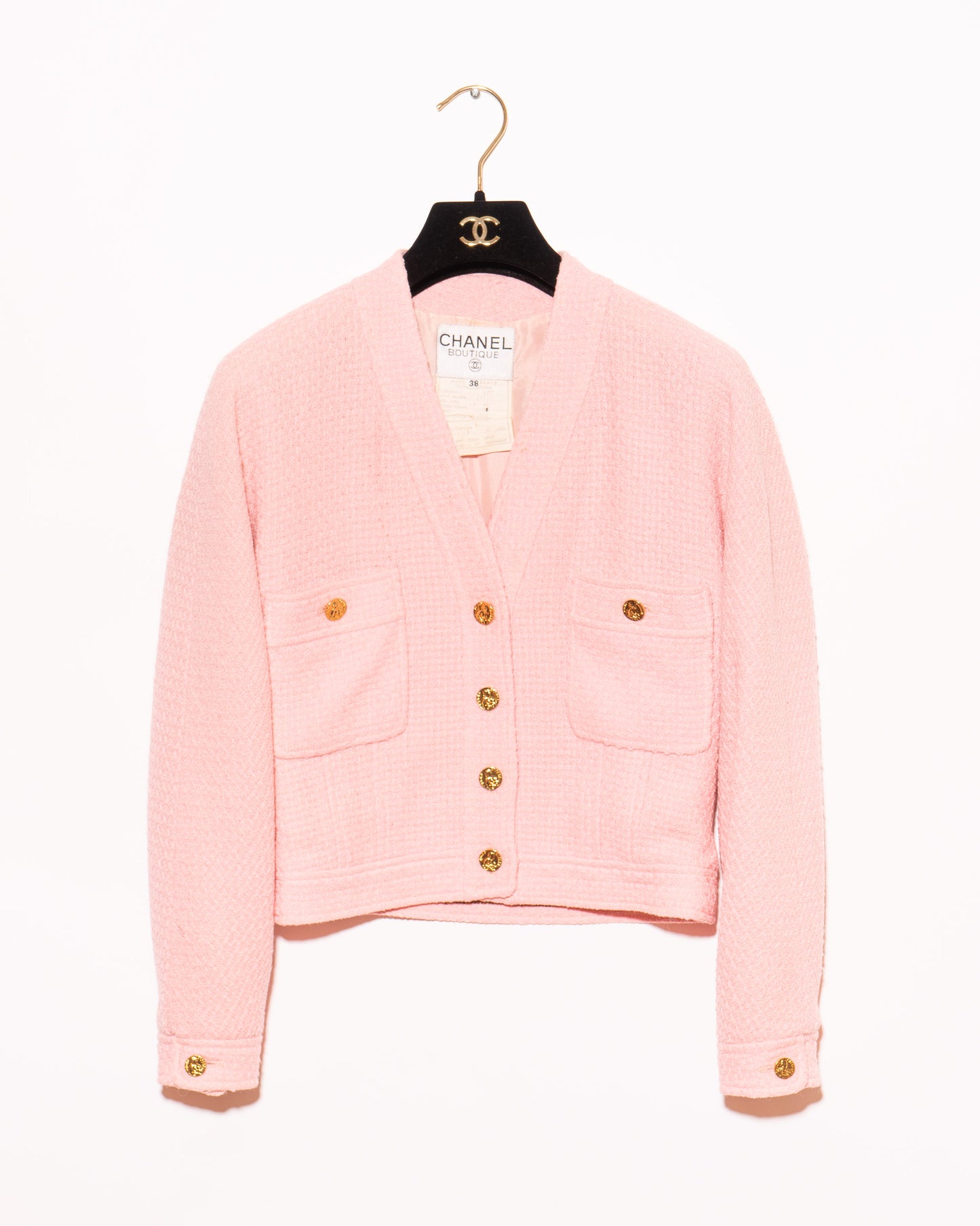 FR36-38 Rare Chanel Spring 1988 Collarless Two Pocket Pink Wool Tweed Jacket