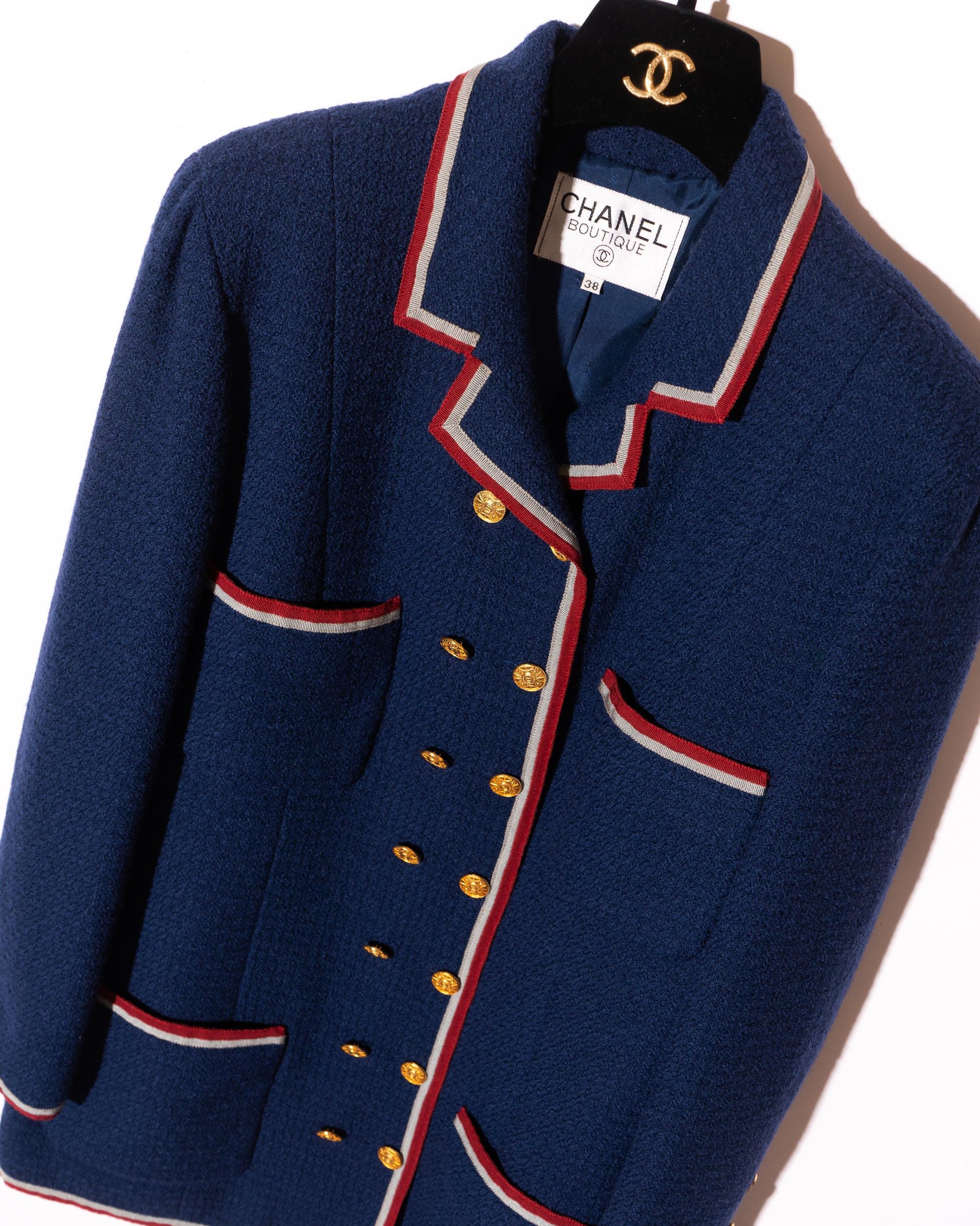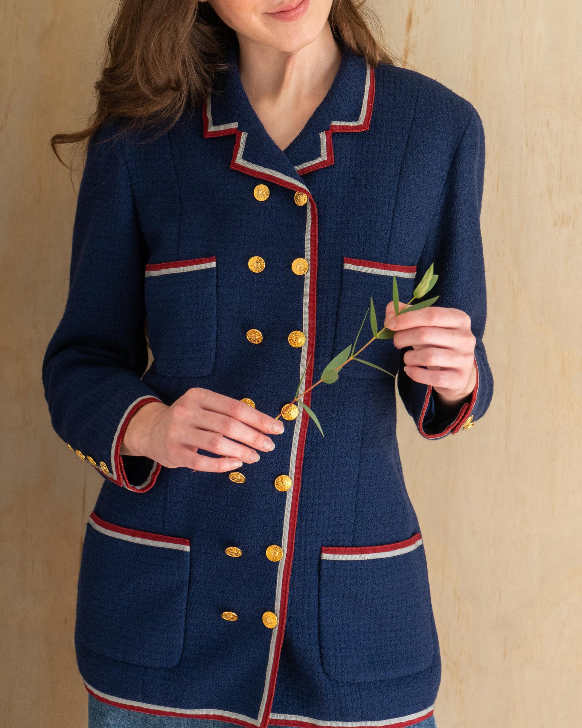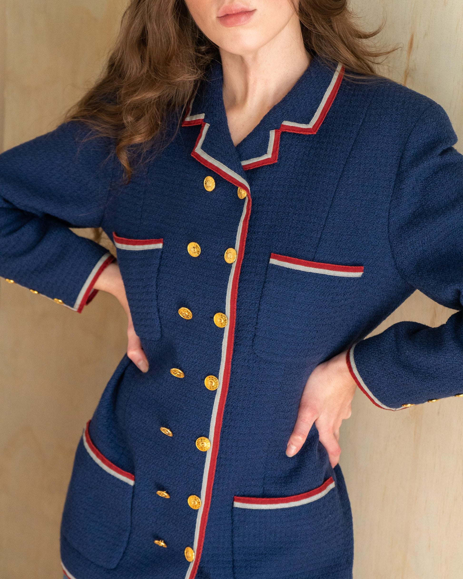 FR38-40 Chanel Fall 1989 Double Breasted Nautical Style Four Pocket Red and Grey Trim Wool Jacket