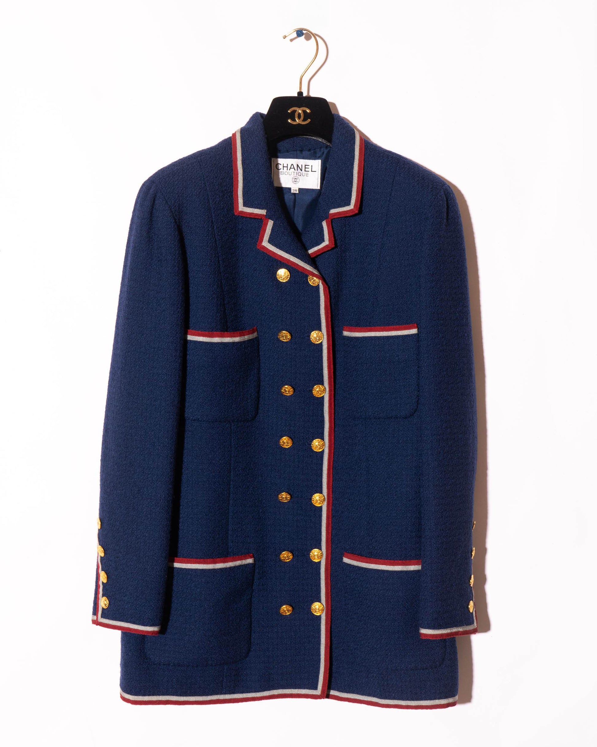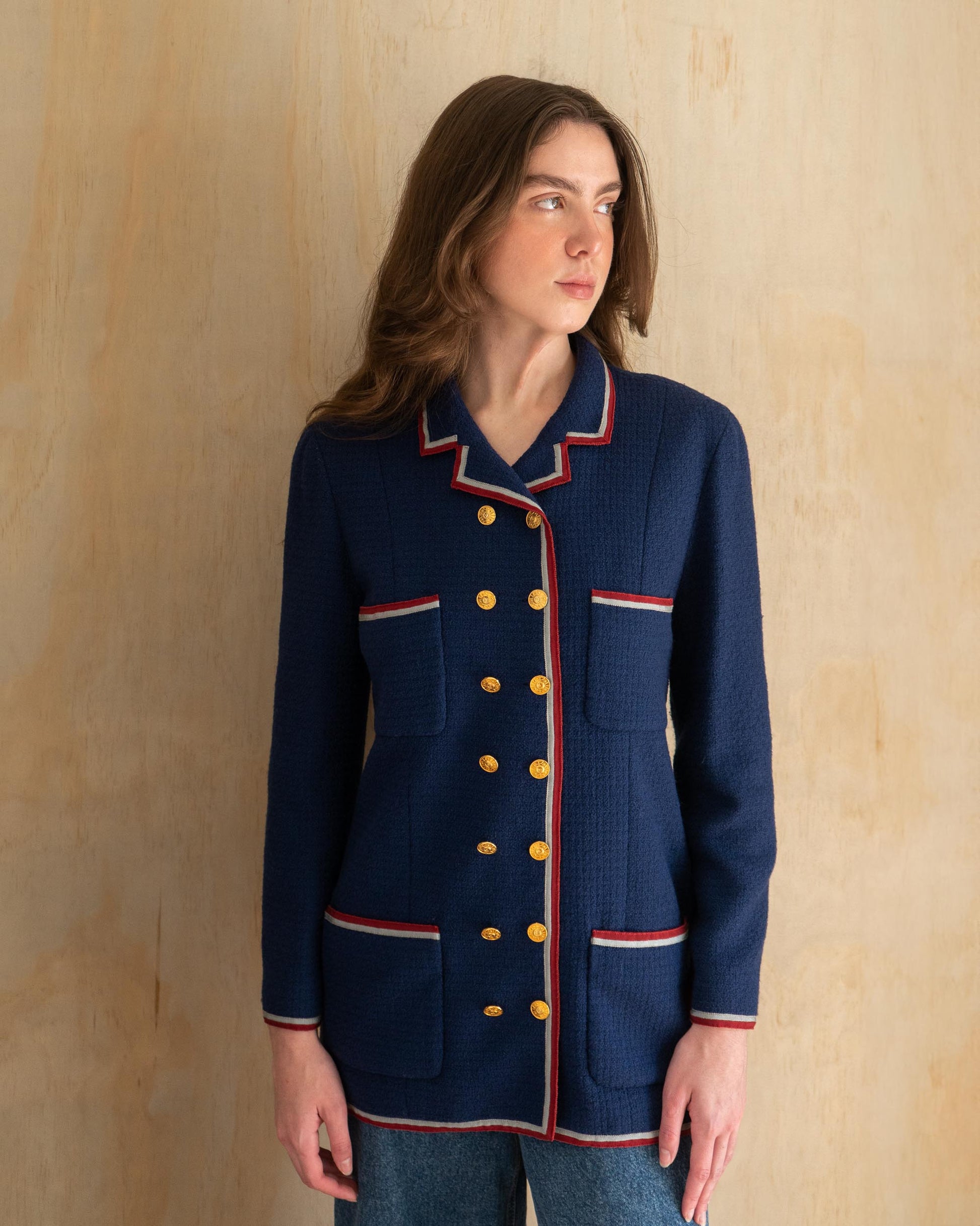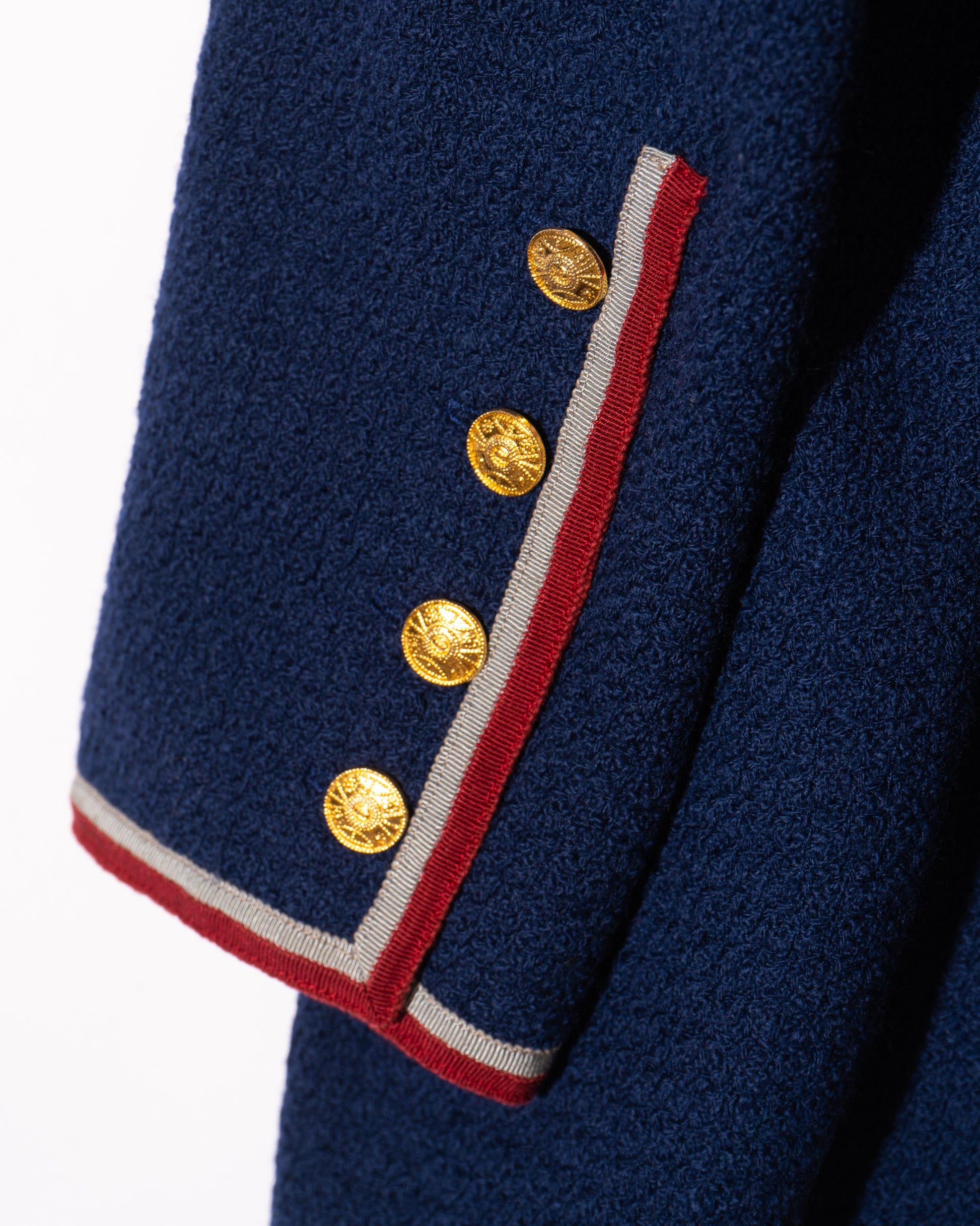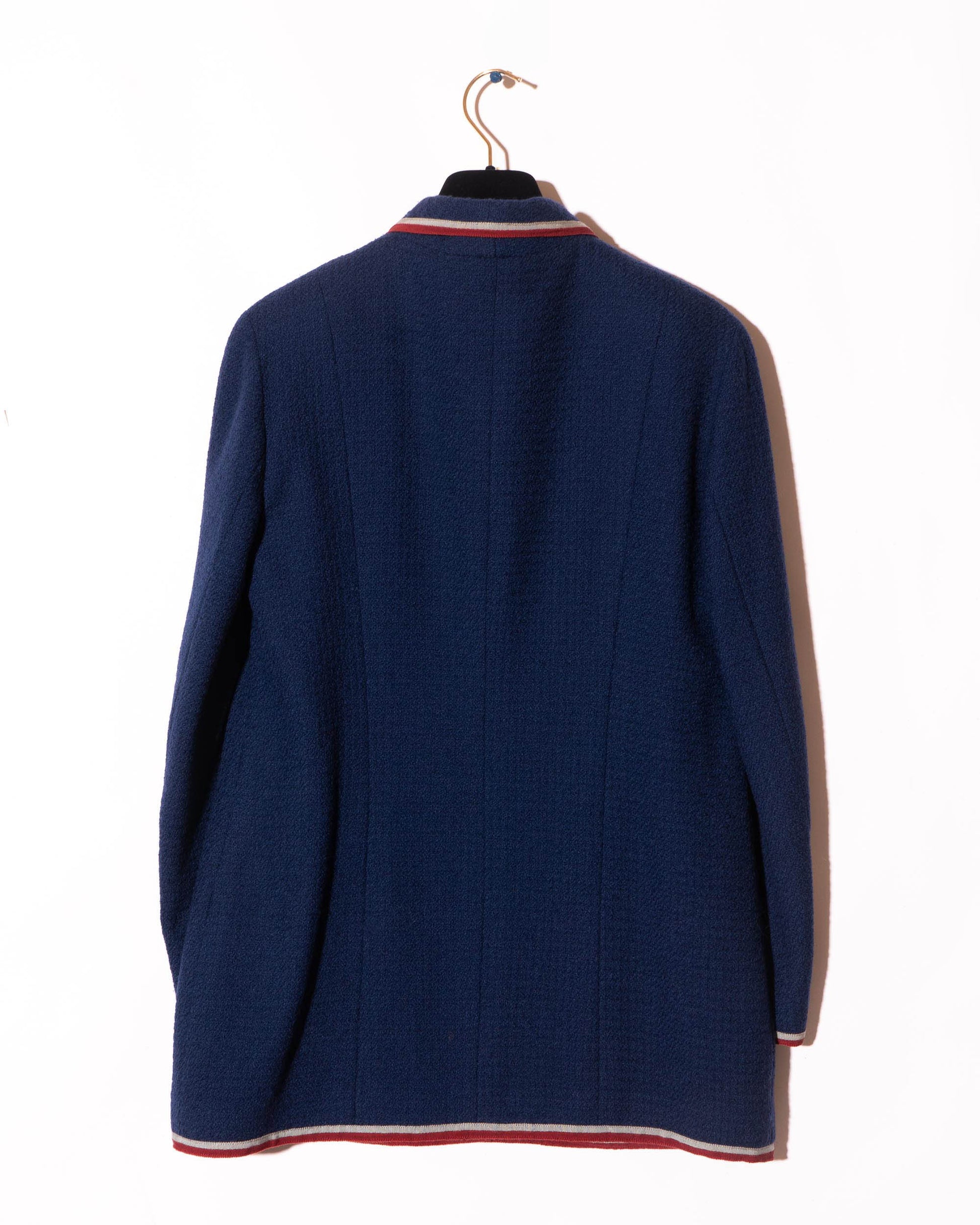 From the Fall 1989 collection, this jacket comes in navy wool with striking red and gray trim that recalls classic nautical colors. The elongated silhouette is tailored yet easy, finished with four patch pockets and a double-breasted front.
