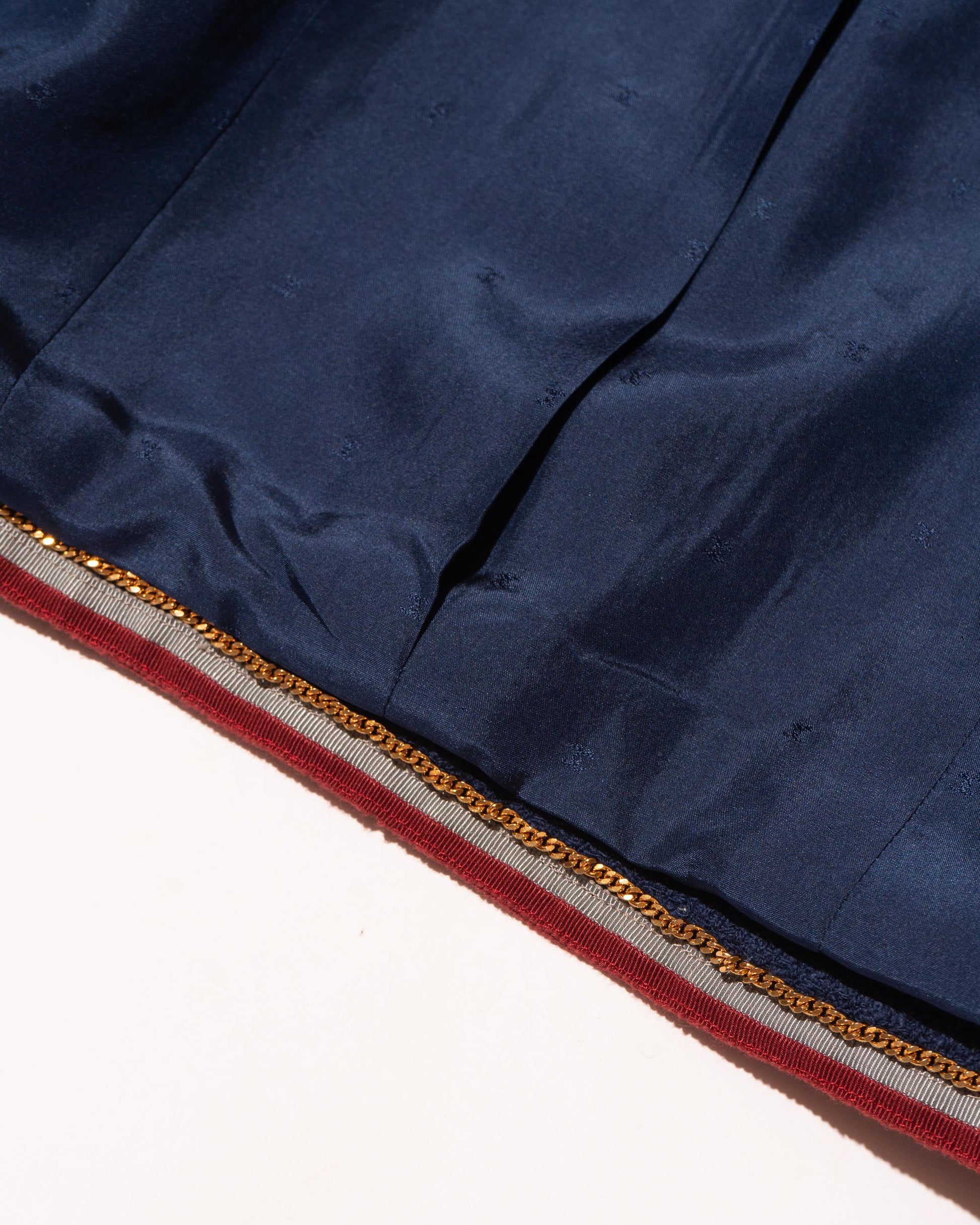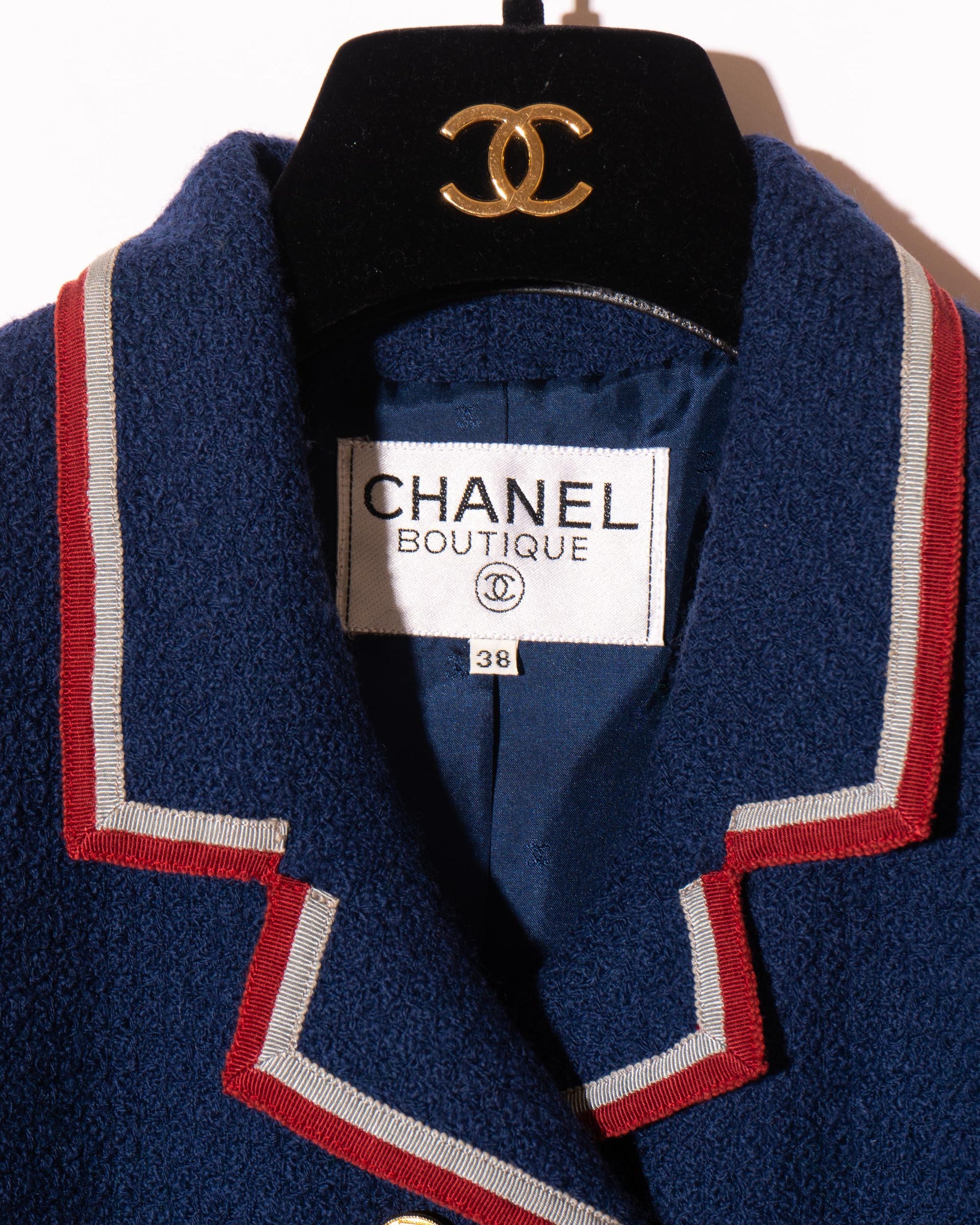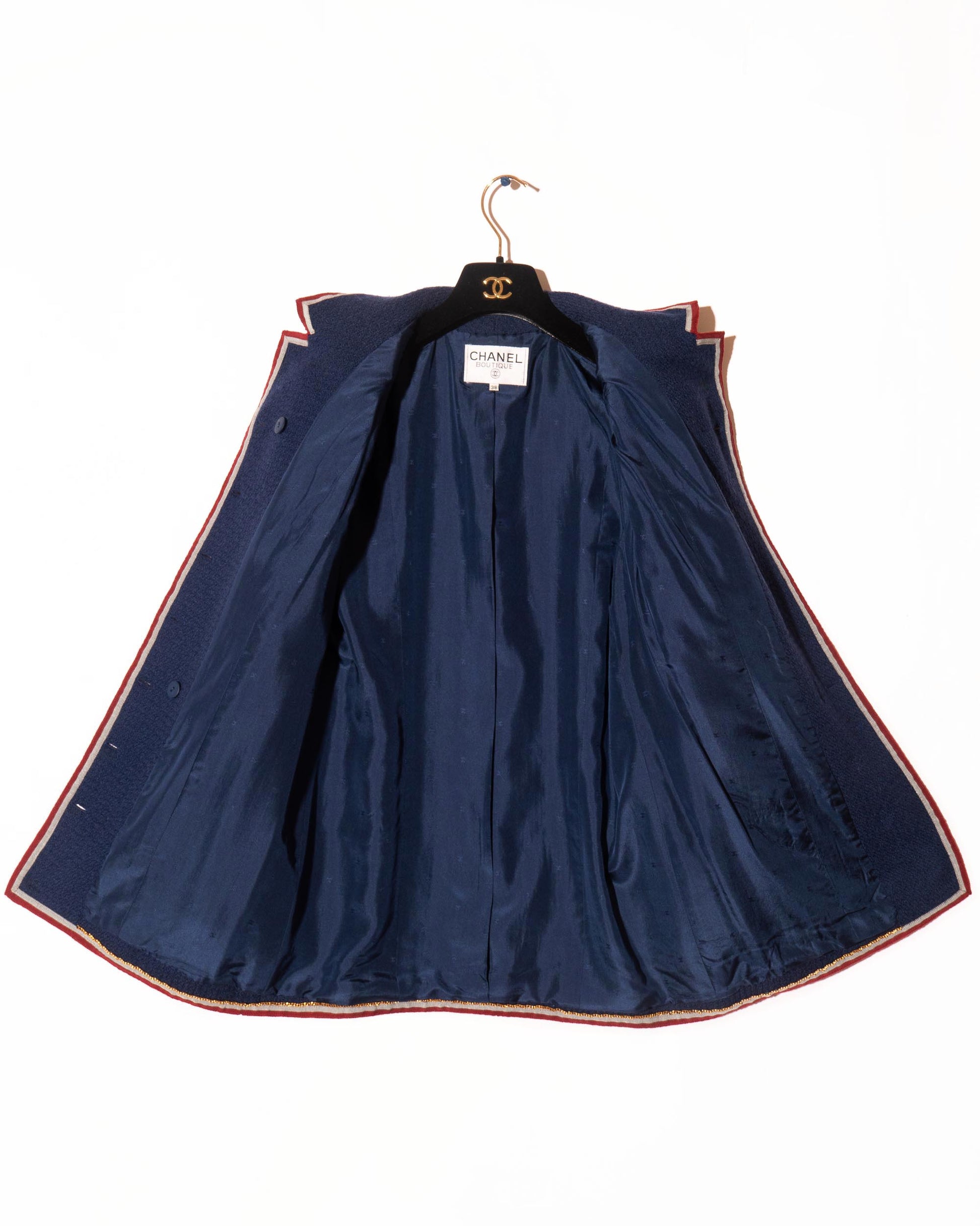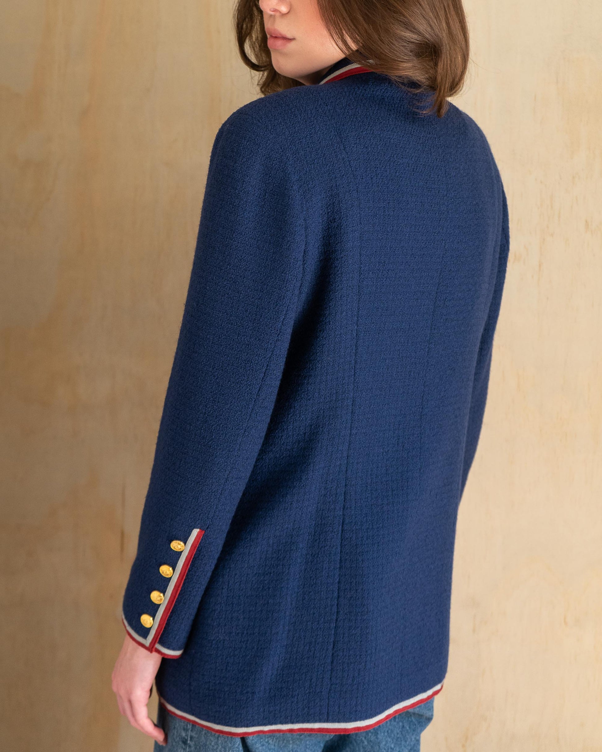From the Fall 1989 collection, this jacket comes in navy wool with striking red and gray trim that recalls classic nautical colors. The elongated silhouette is tailored yet easy, finished with four patch pockets and a double-breasted front.