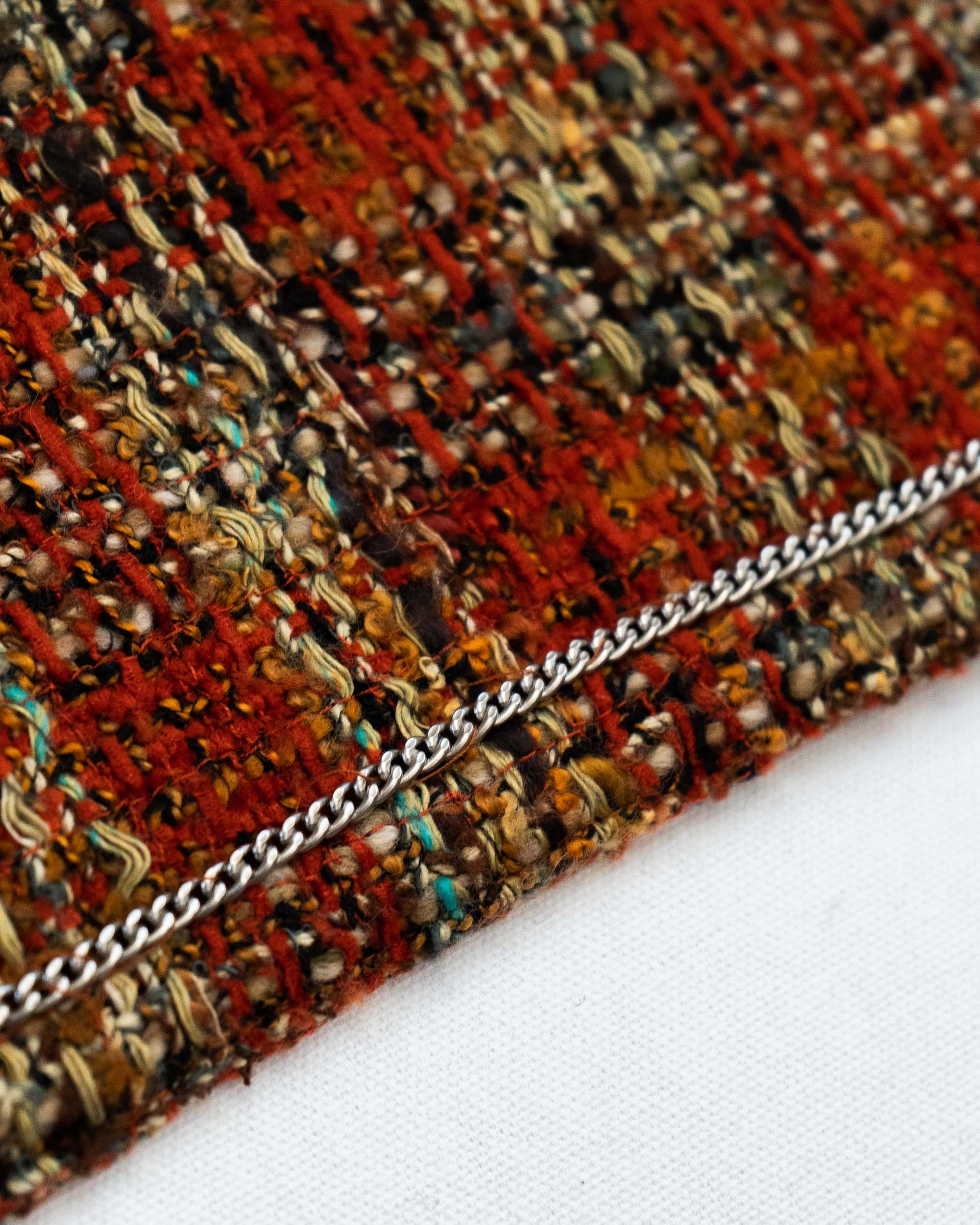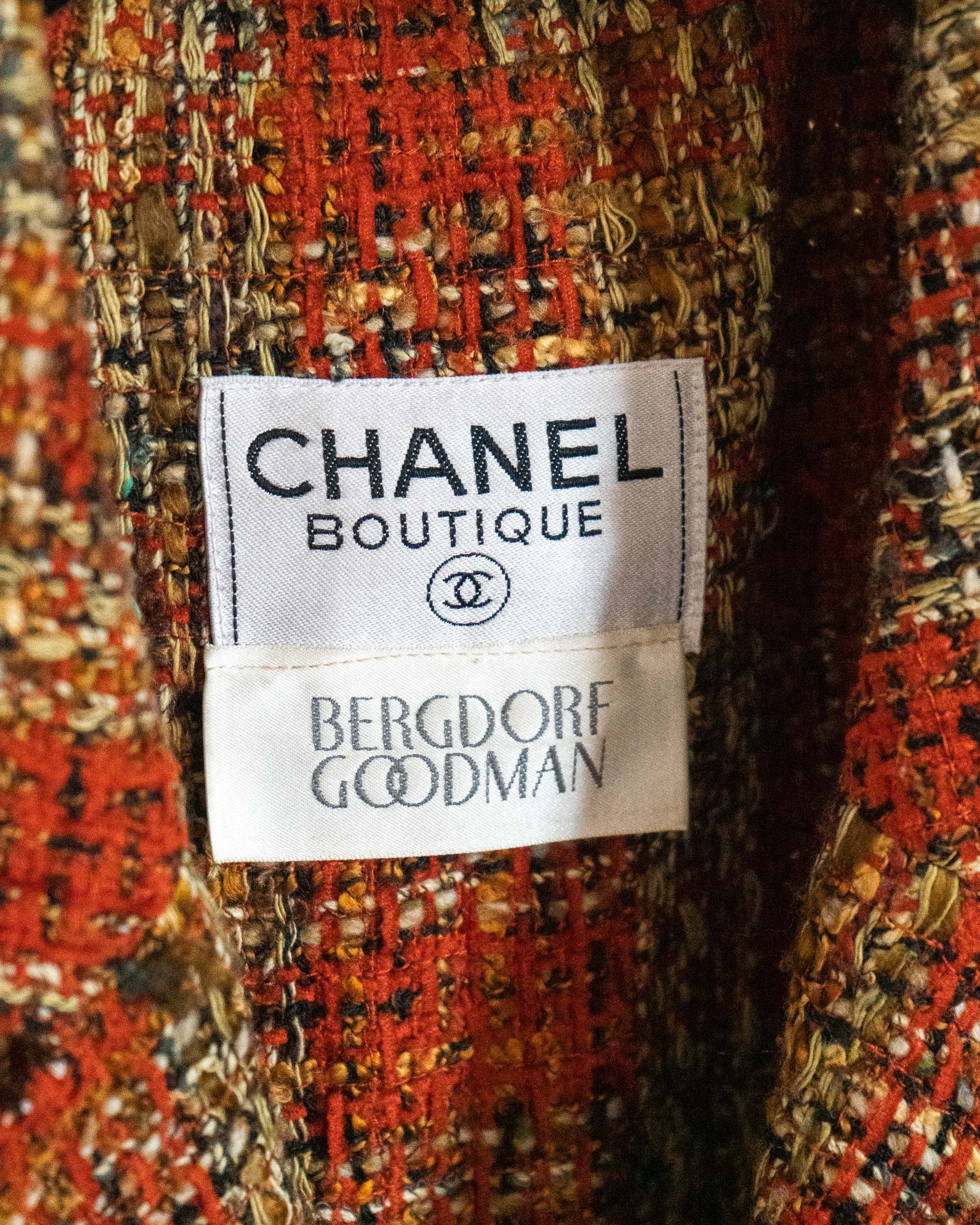 This Fall 1998 Chanel jacket reflects the richness and structure of late-90s tailoring. Crafted from a multi-tonal fantasy tweed in warm rust, gold, and olive tones, it balances texture with restraint. Four functional pockets and tortoiseshell-tone epoxy buttons — each embedding strands of tweed inside — nod to Chanel’s meticulous detailing.