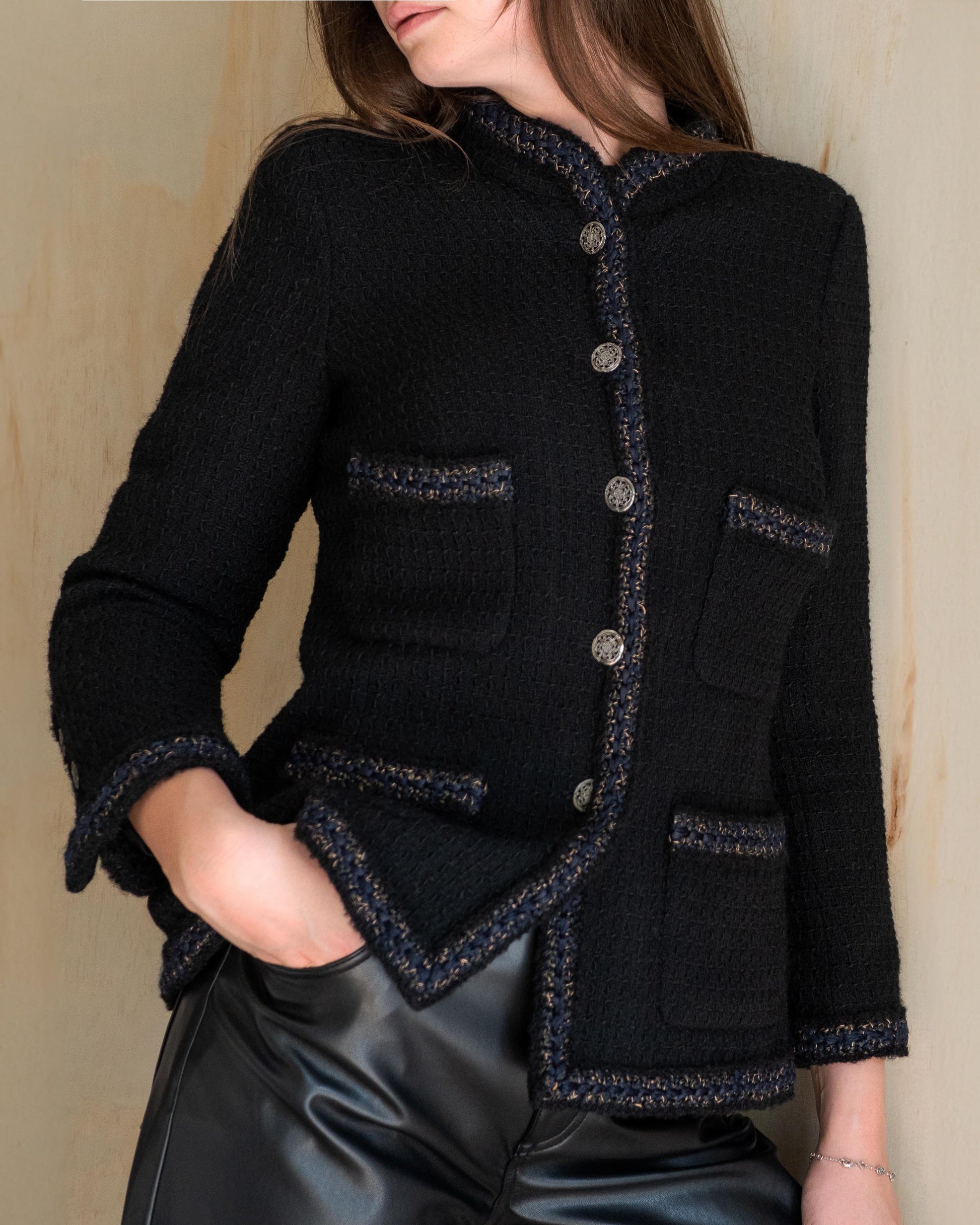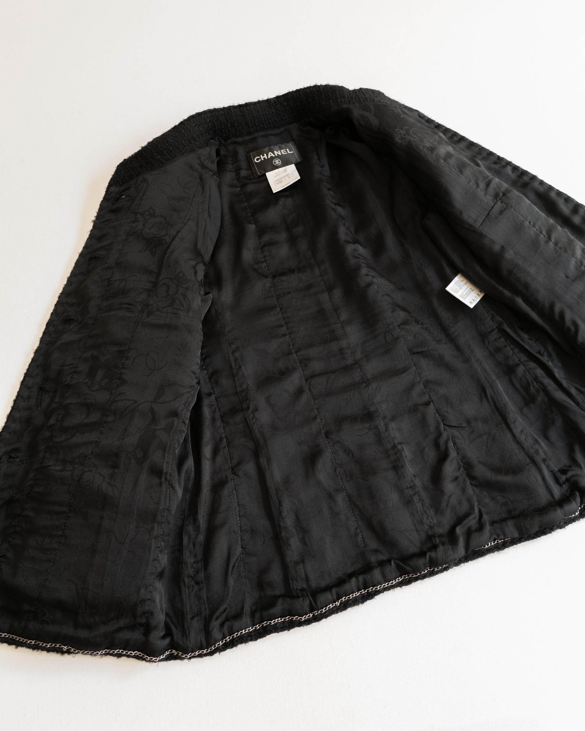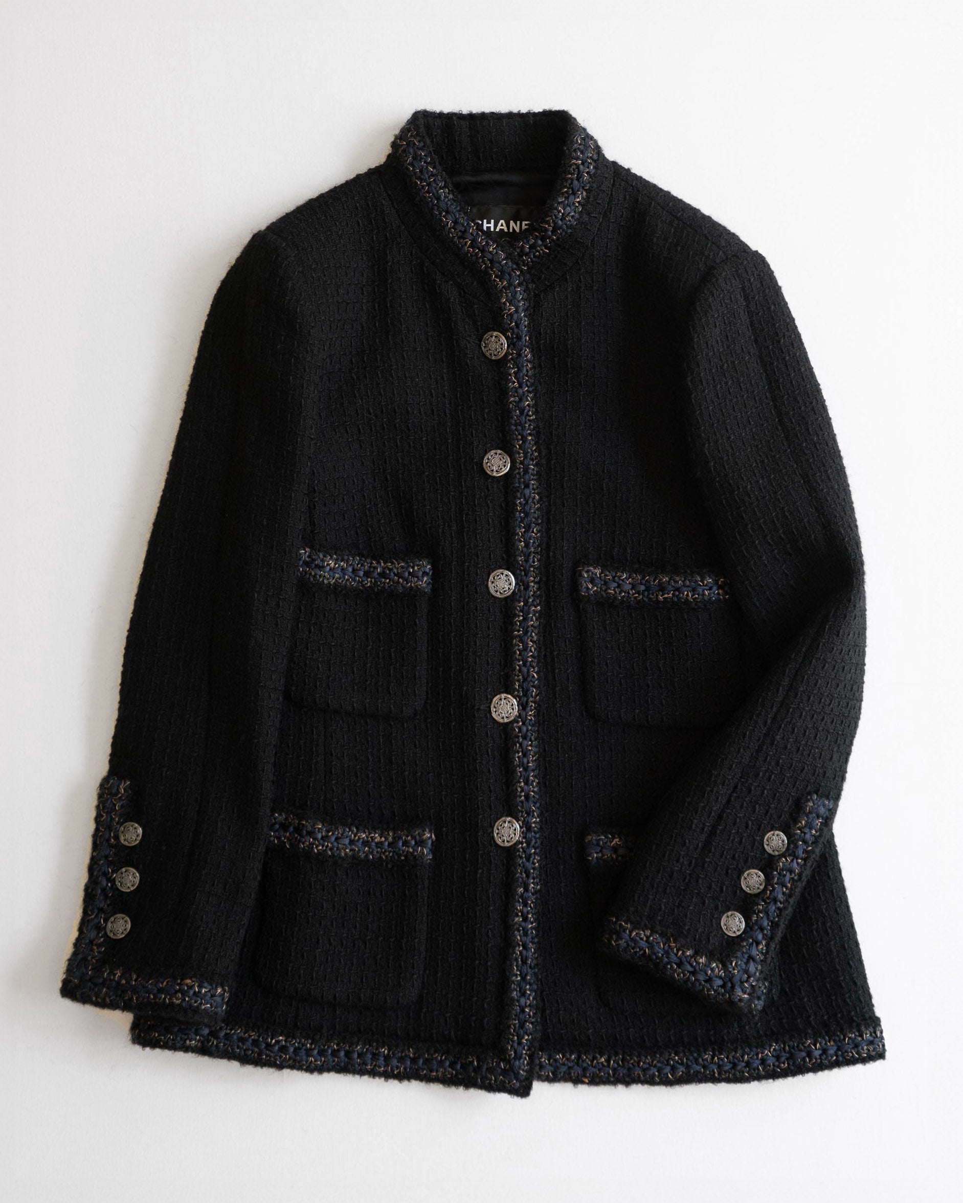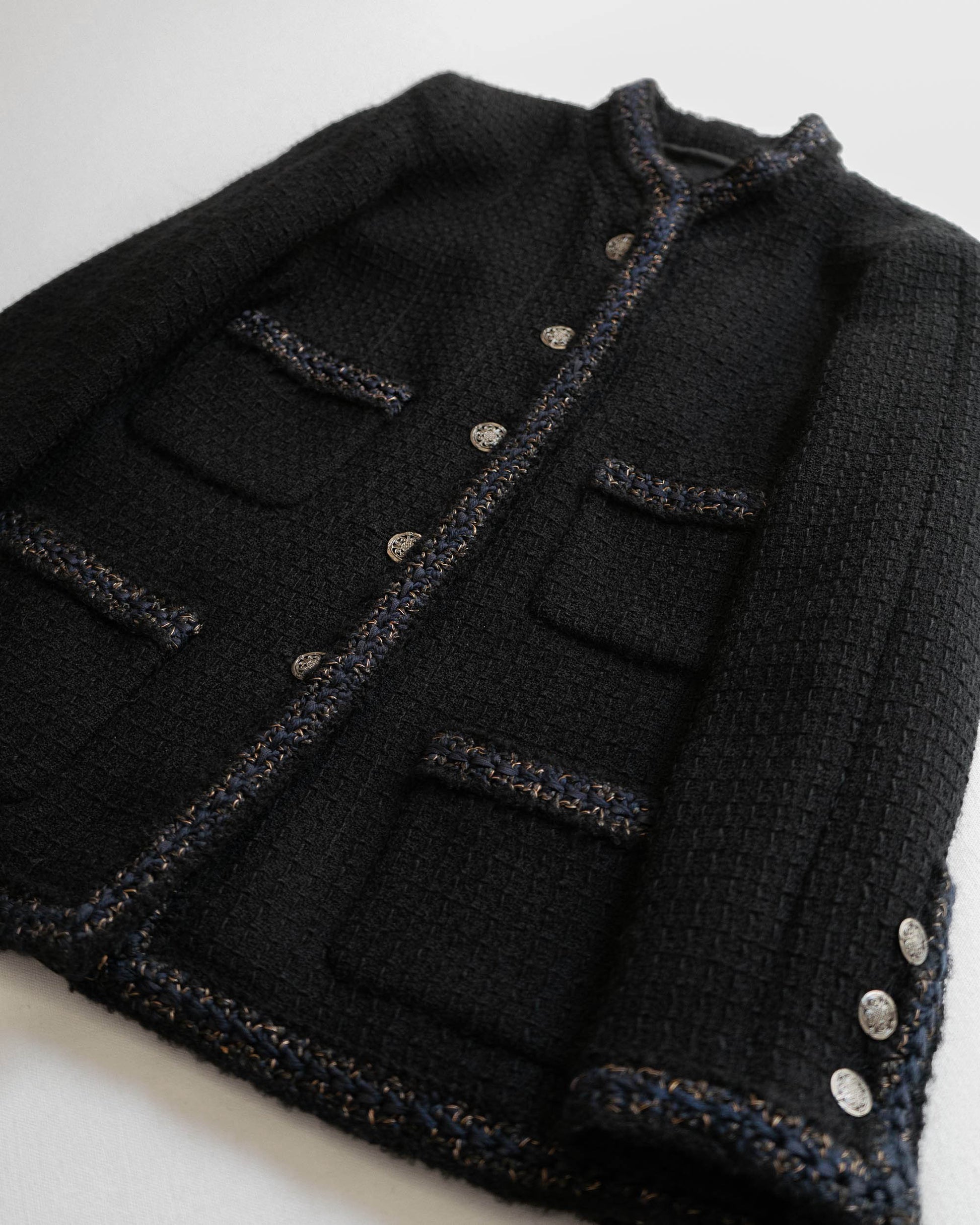 This jacket comes from Karl Lagerfeld’s Métiers d’Art Paris–Shanghai collection, a line inspired by the meeting of French couture tradition and Chinese cultural references. Cut in a rich black wool tweed, the silhouette is sharp yet understated, detailed with tonal four-pocket tailoring and finished with intricate trim.
