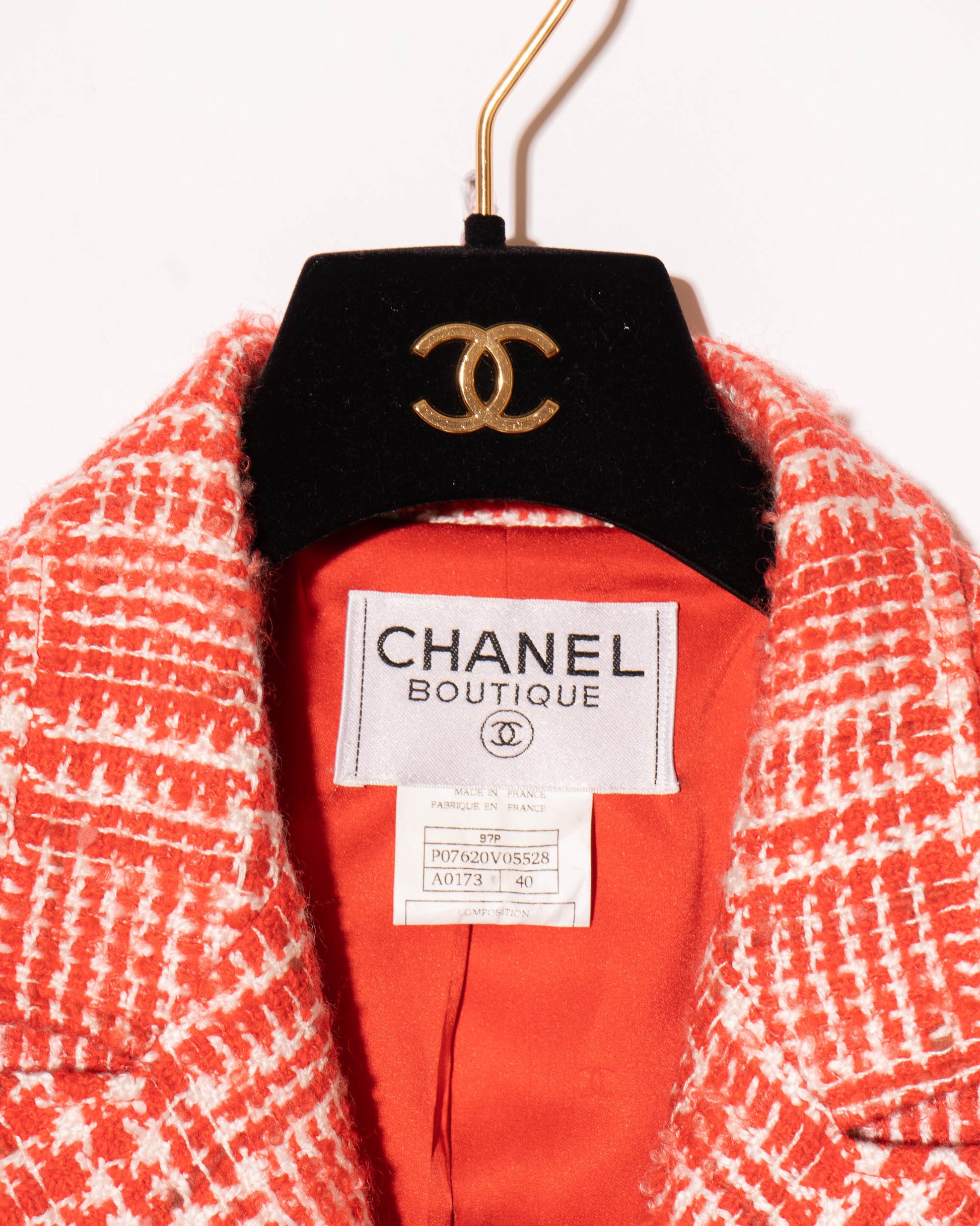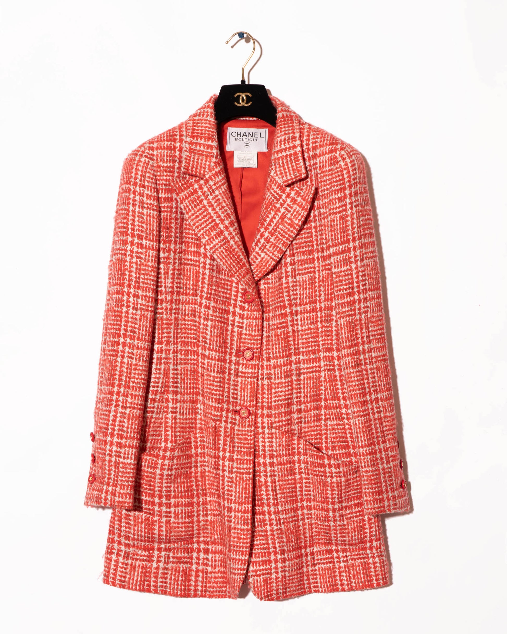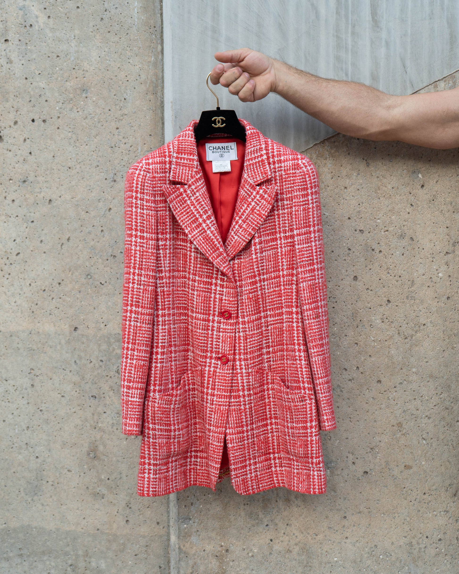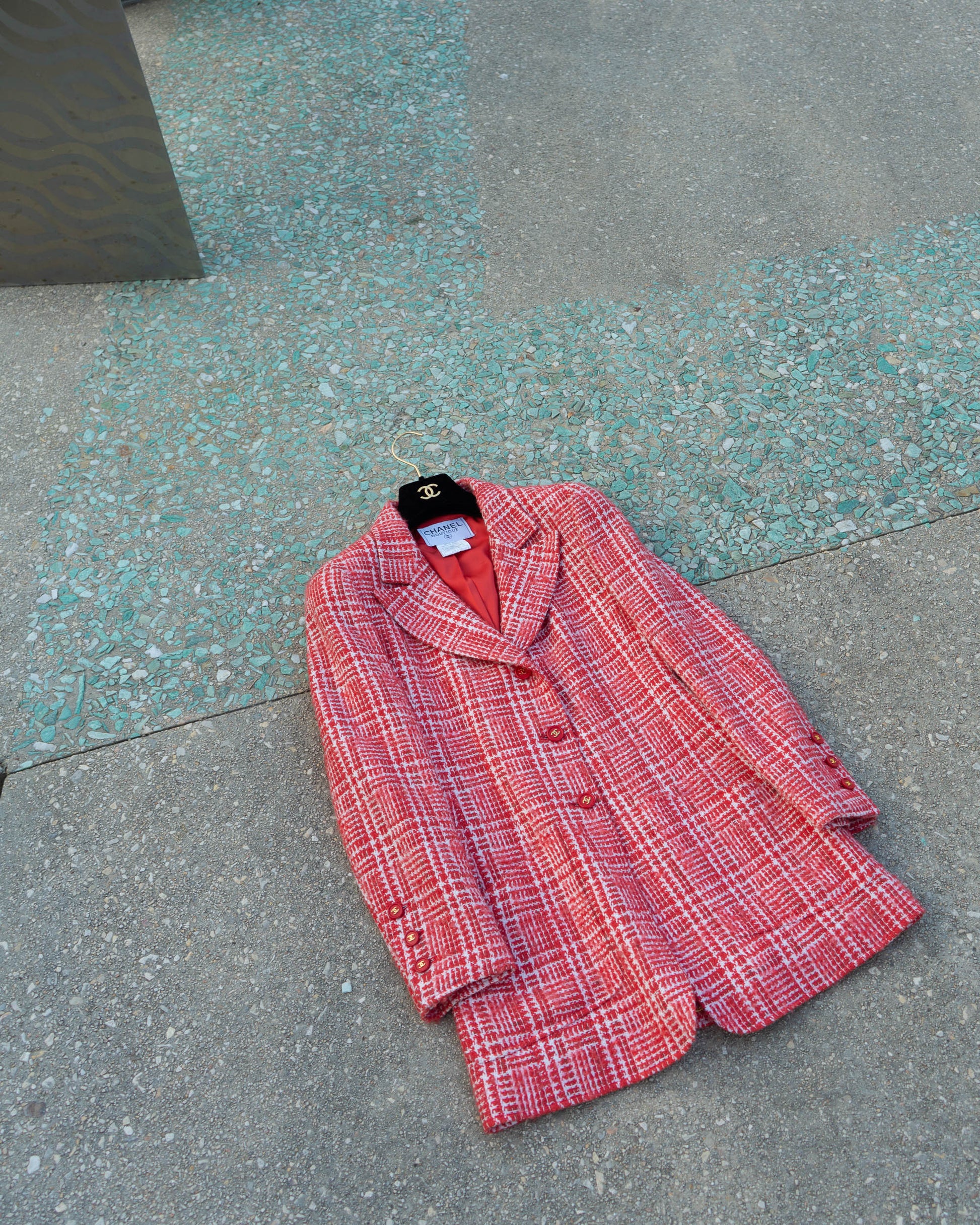 FR38-40 Chanel Spring 1997 Red and White Wool Tweed Longline Blazer with Patch Pockets and Structured Cut