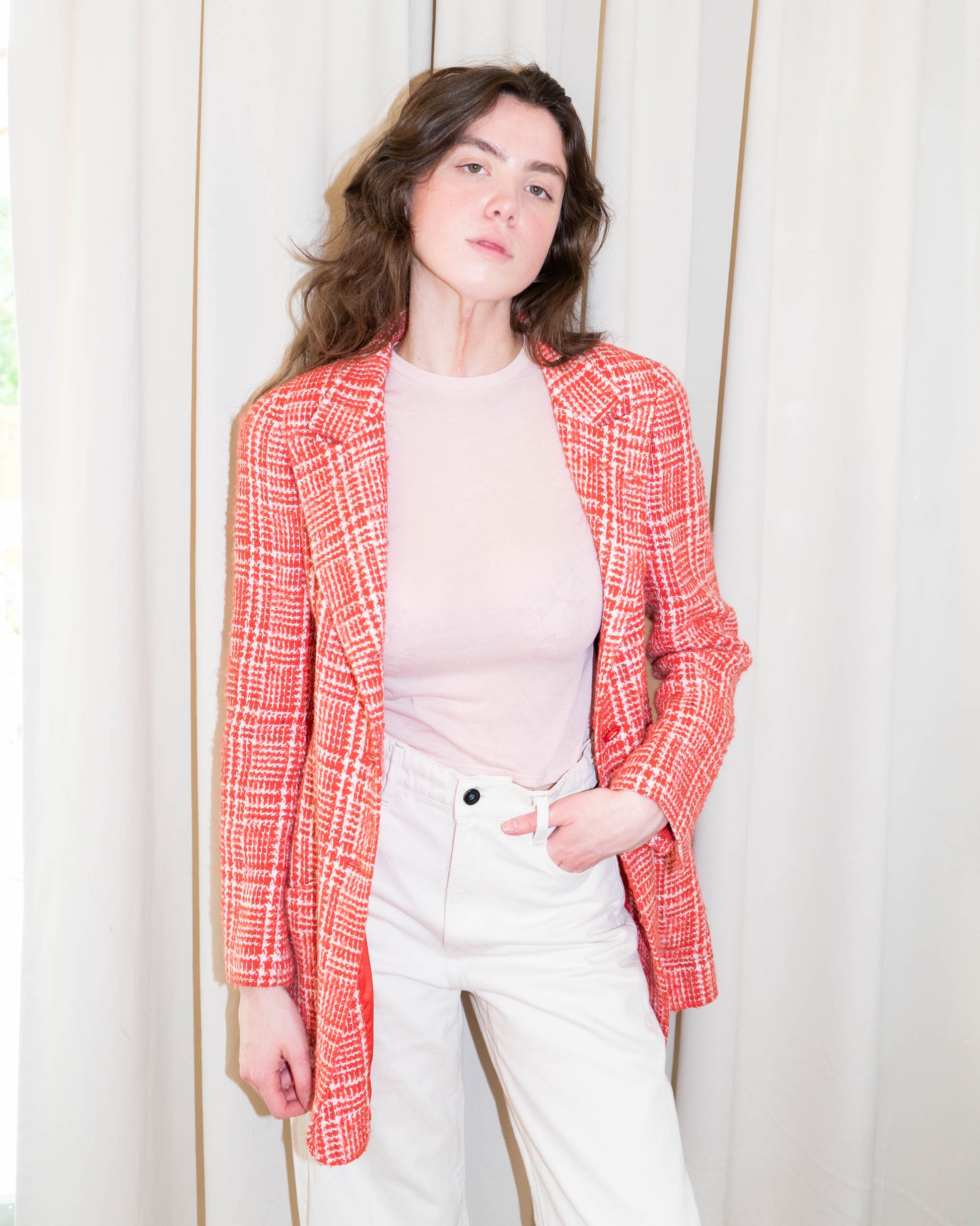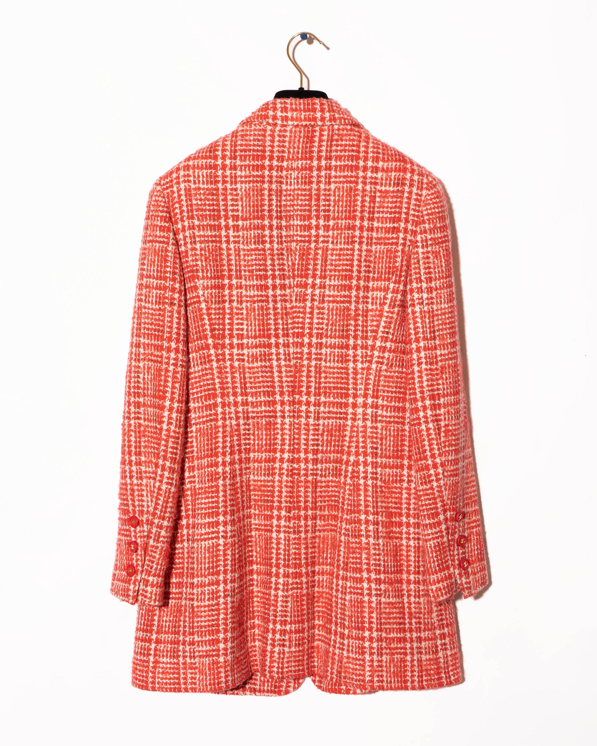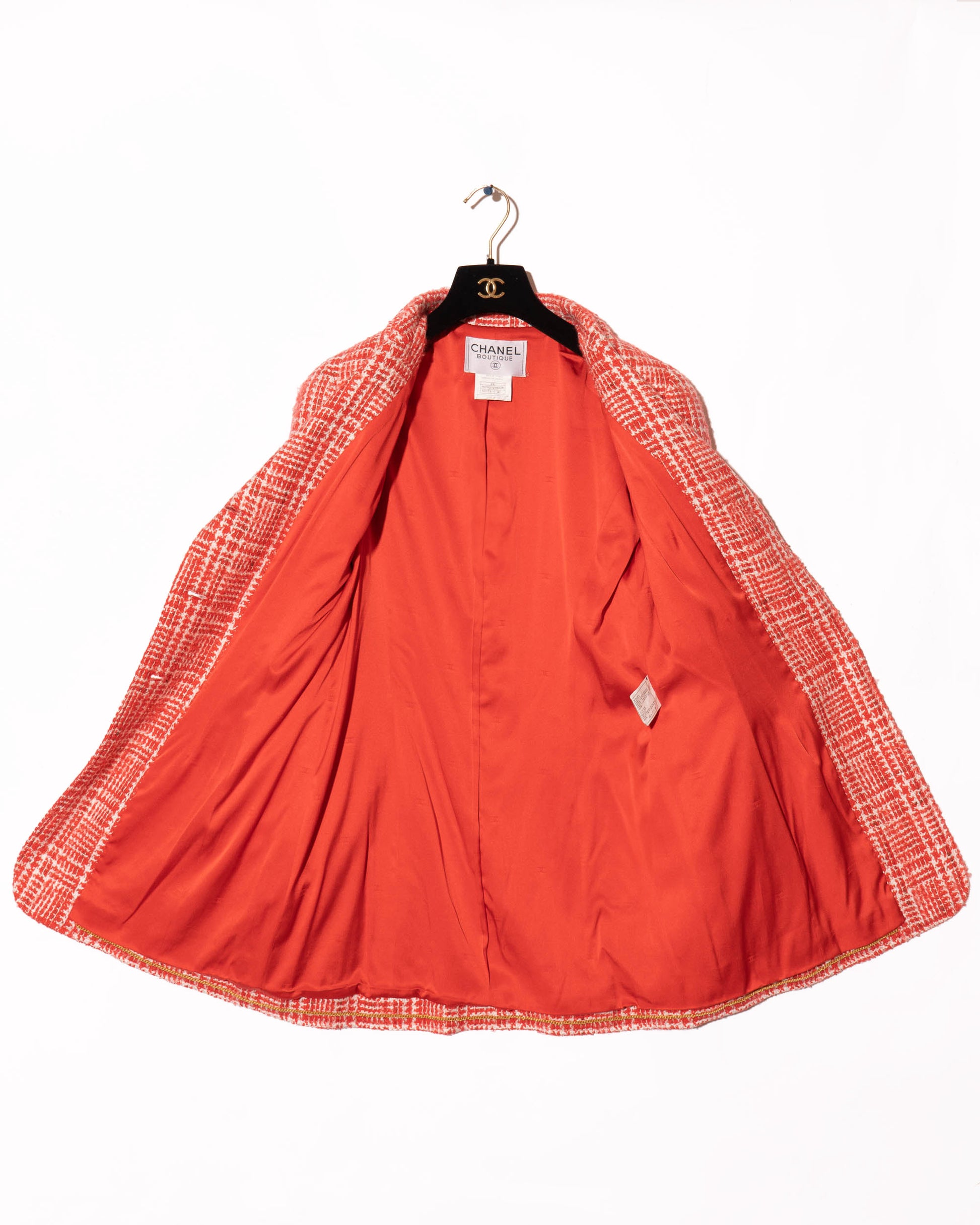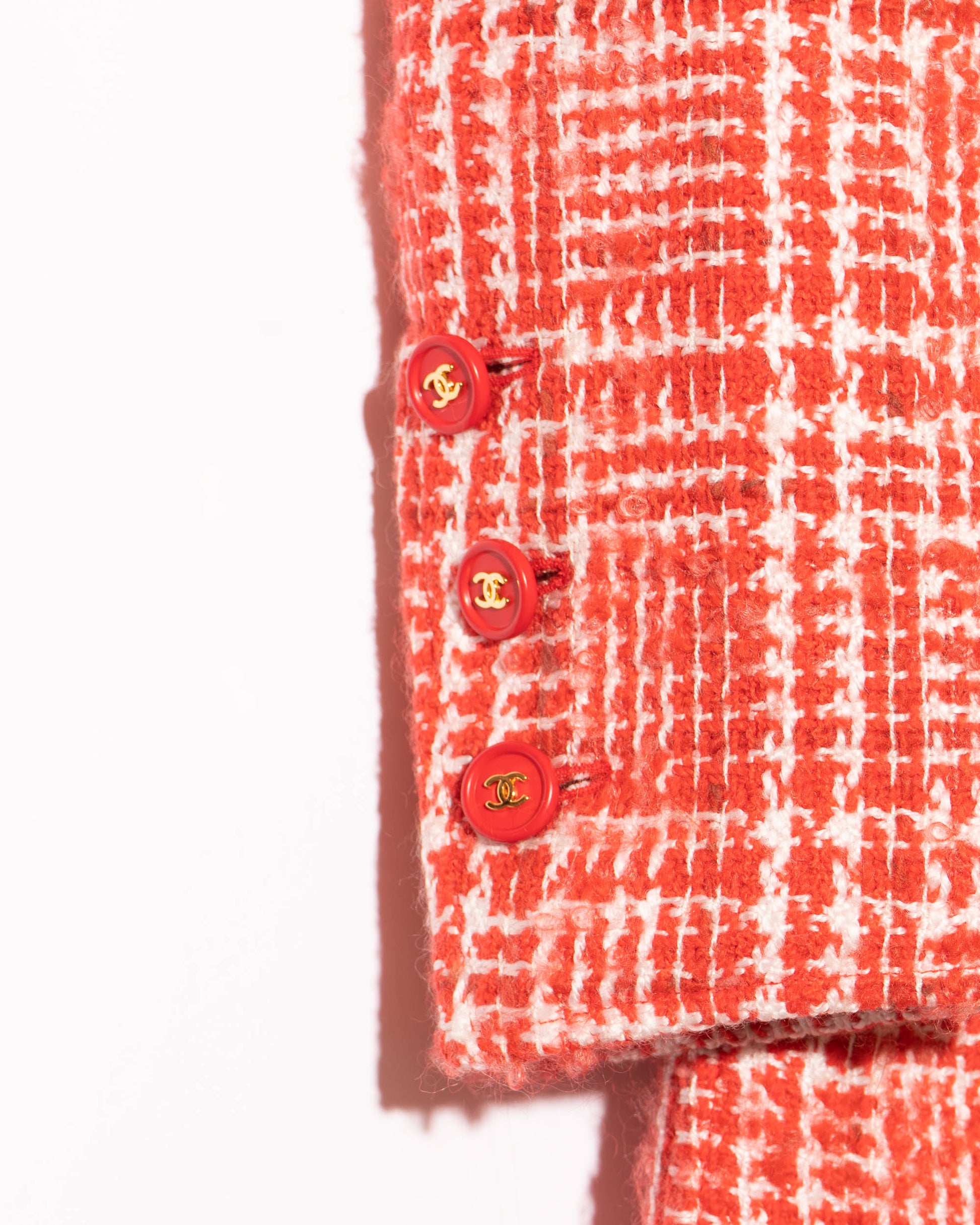 FR38-40 Chanel Spring 1997 Red and White Wool Tweed Longline Blazer with Patch Pockets and Structured Cut