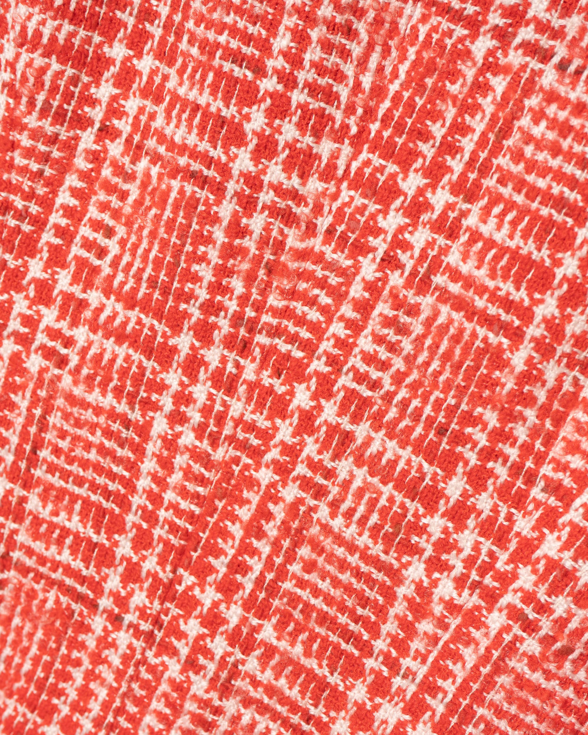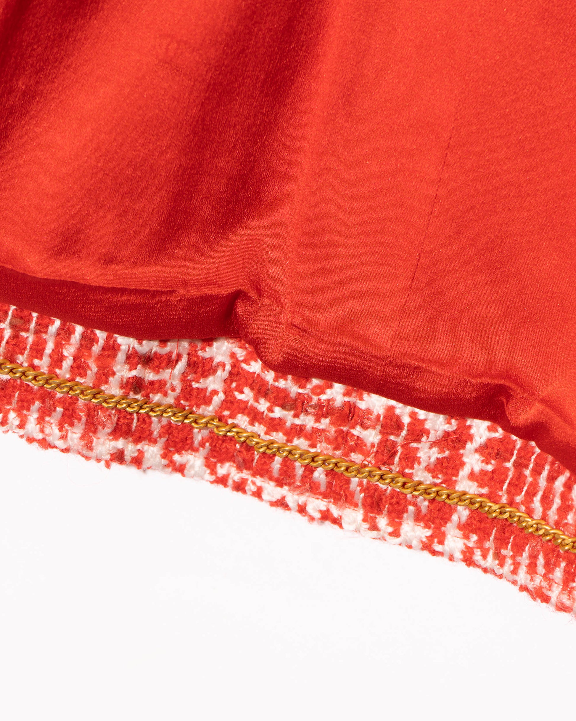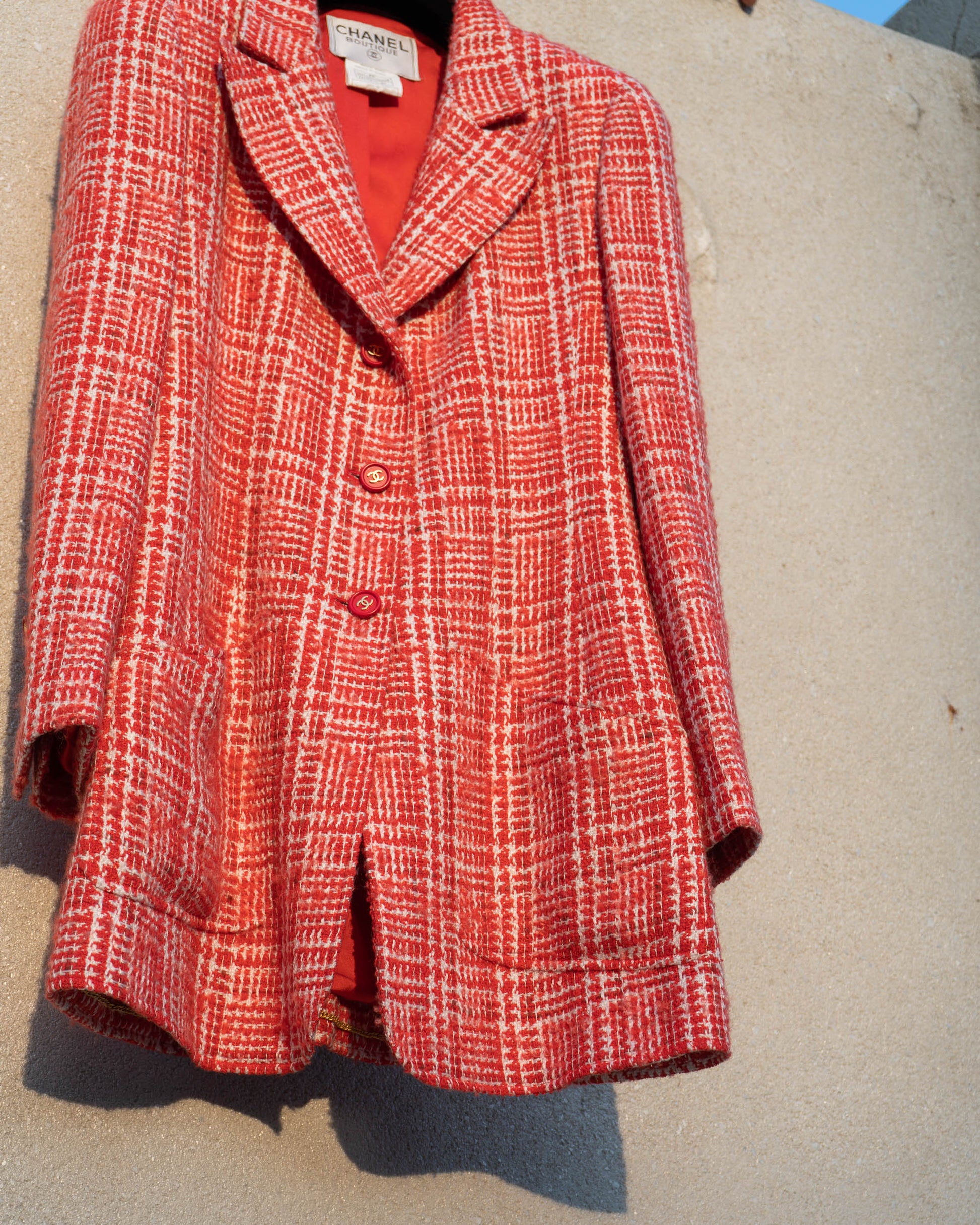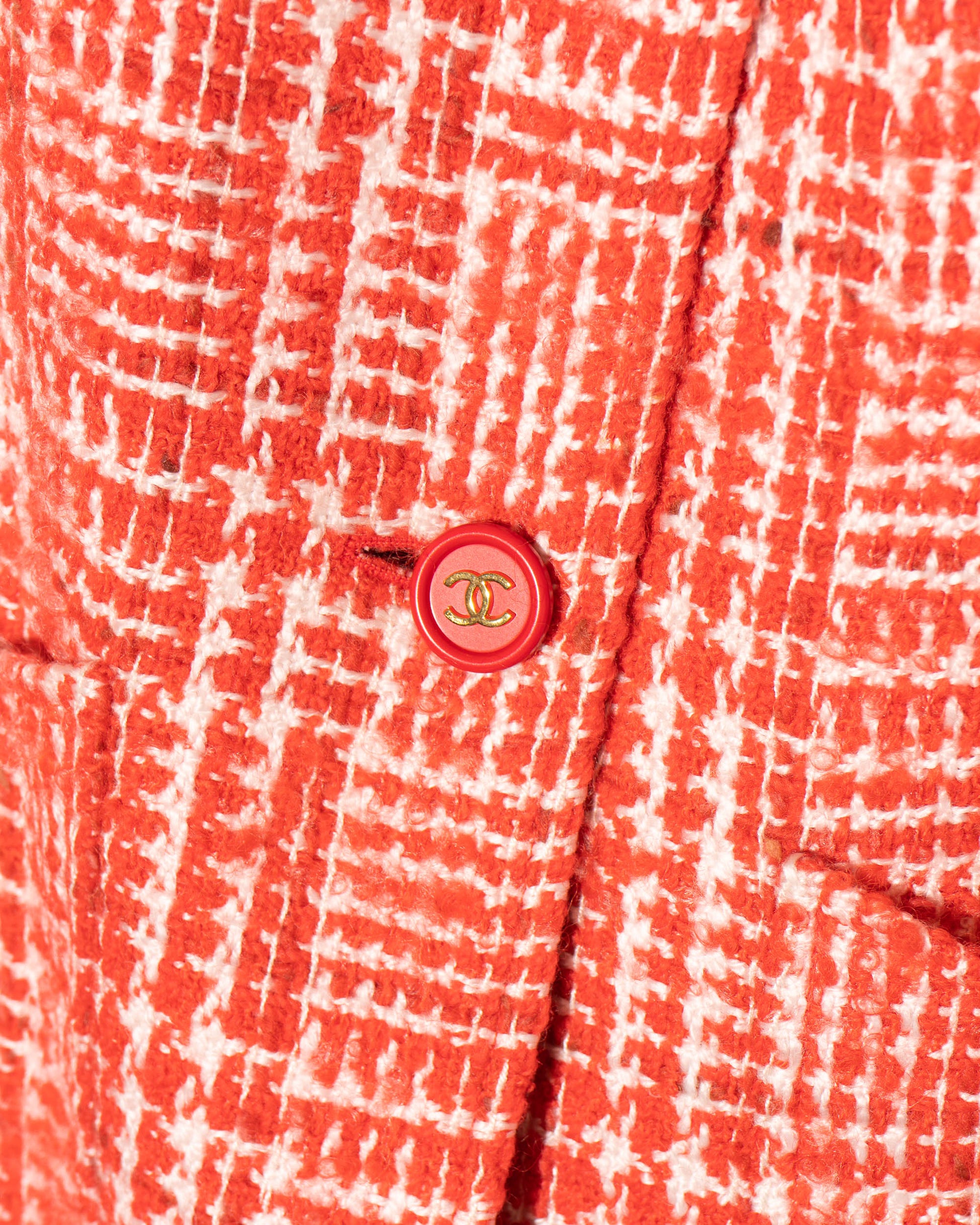 When Karl Lagerfeld stepped in as creative director of Chanel in 1983, he reimagined the house’s heritage with a sharp, modern edge—reviving the tweed jacket and infusing it with a new attitude. This piece from the Spring 1997 collection reflects that legacy: bold in palette, sharply cut, and anchored by the signature details that defined Lagerfeld’s Chanel—structured shoulders, patch pockets, red enamel CC buttons, and silk-lined interiors. It’s a masterclass in timeless tailoring through a 90s lens.