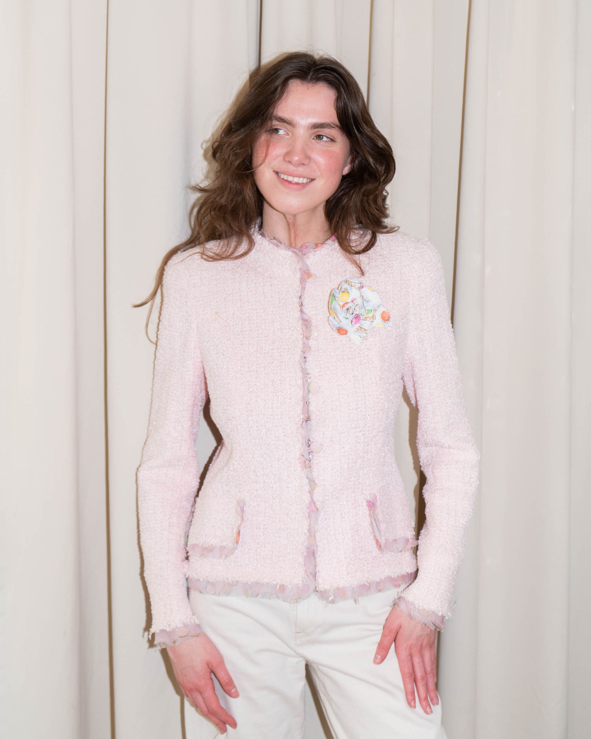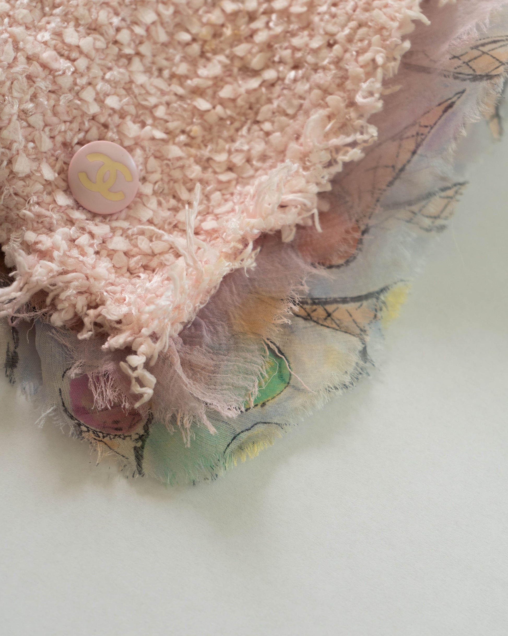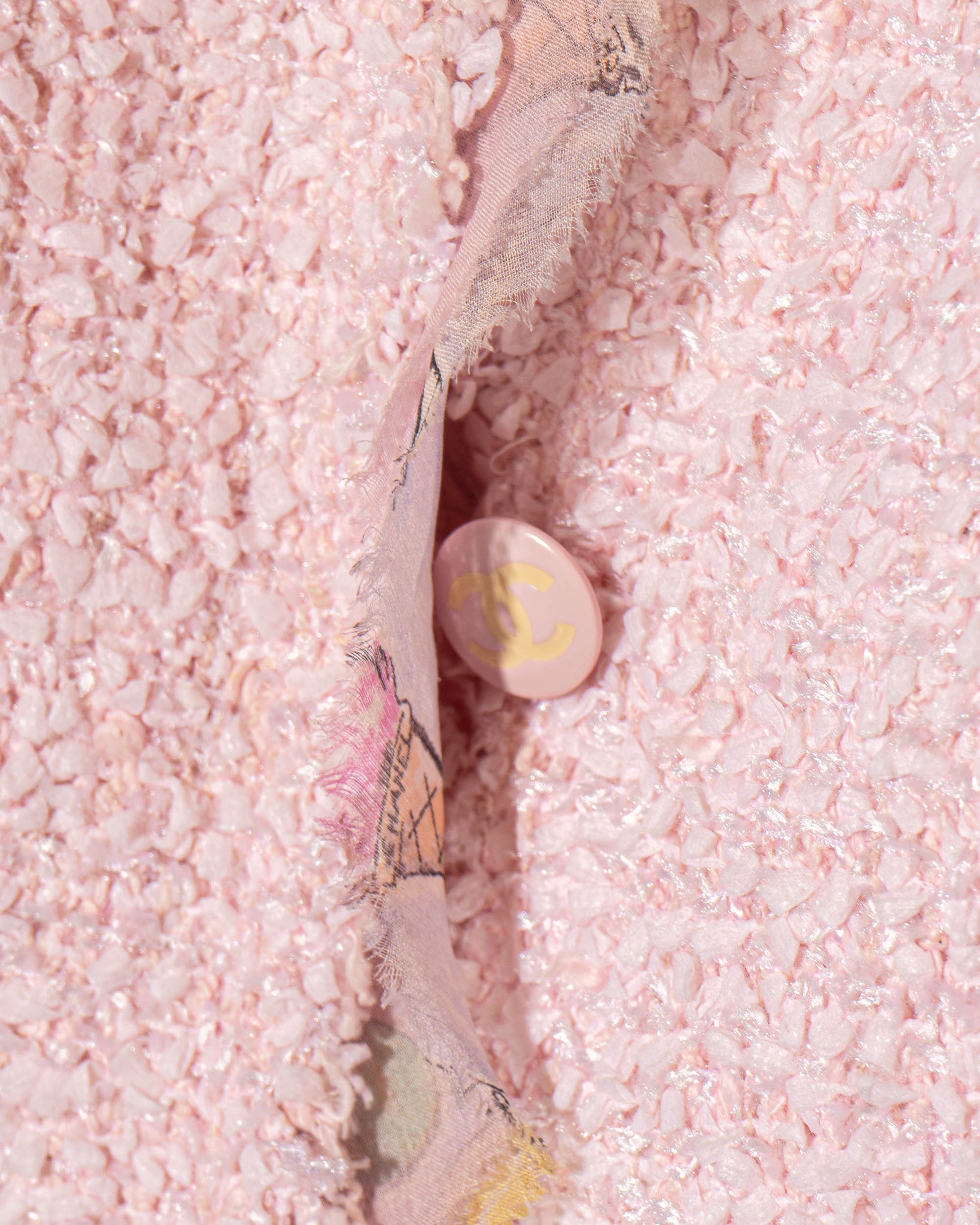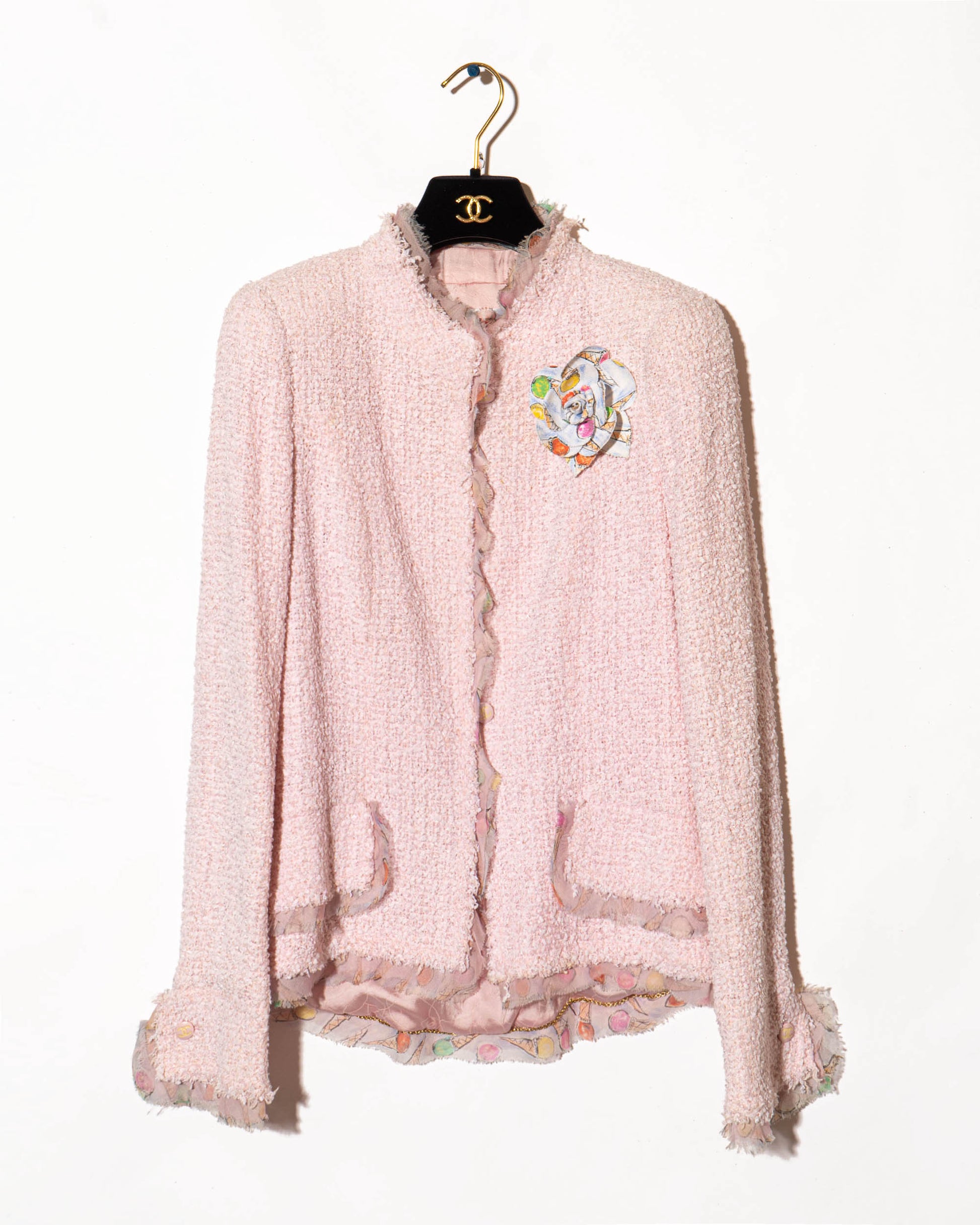 A pastel daydream from the early 2000s. This pink fantasy tweed jacket was designed under Karl Lagerfeld’s direction for Chanel’s Cruise 2004 collection. It features whimsical silk trim and a matching camellia brooch, both printed with a hand-drawn ice cream motif—rare details that make this piece truly collectible. Finished with tonal pastel CC-logo buttons, two slit pockets, and delicate fringe at the cuffs and hem. Lightweight and fully silk-lined, with a signature chain sewn at the hem for that classic drape.