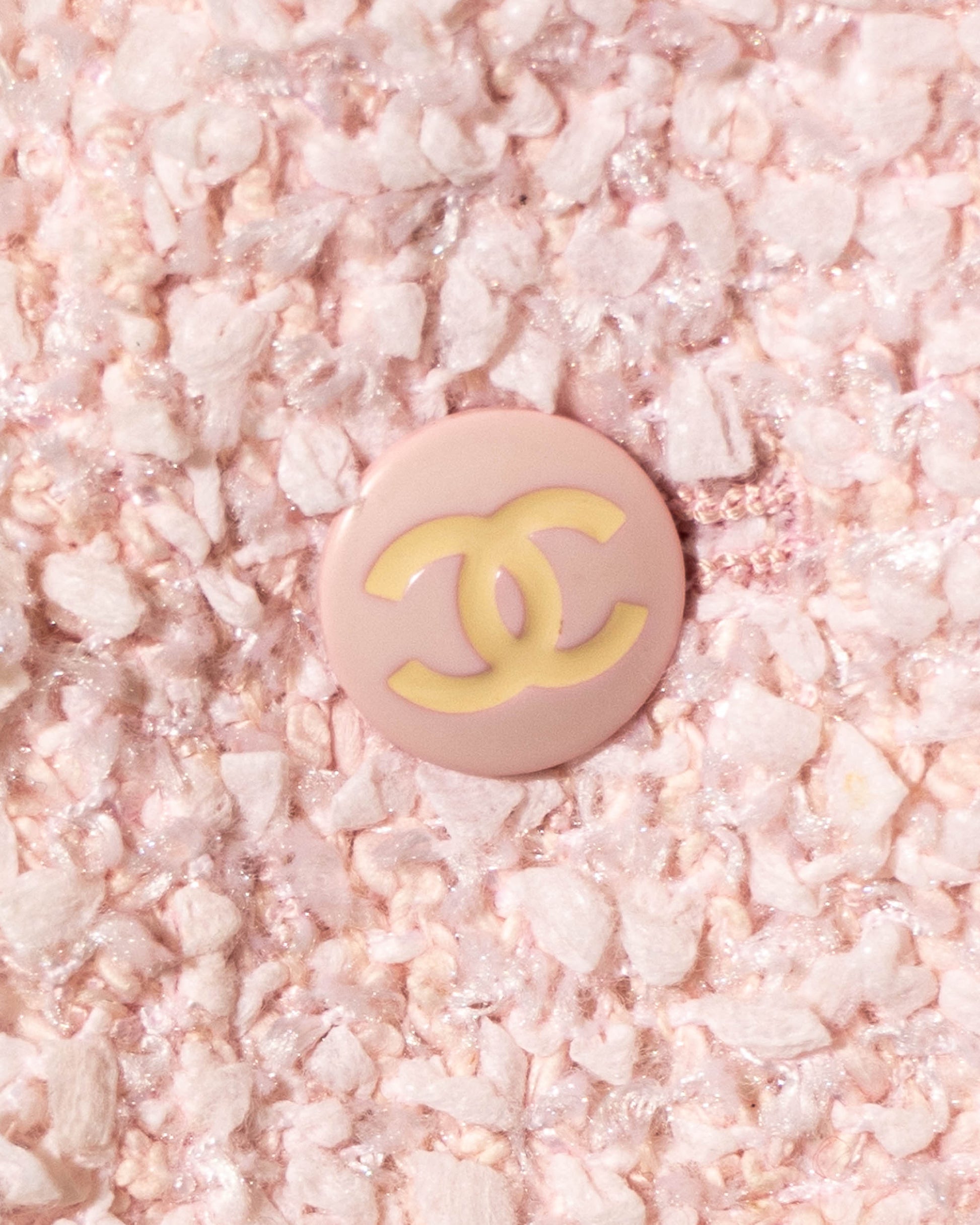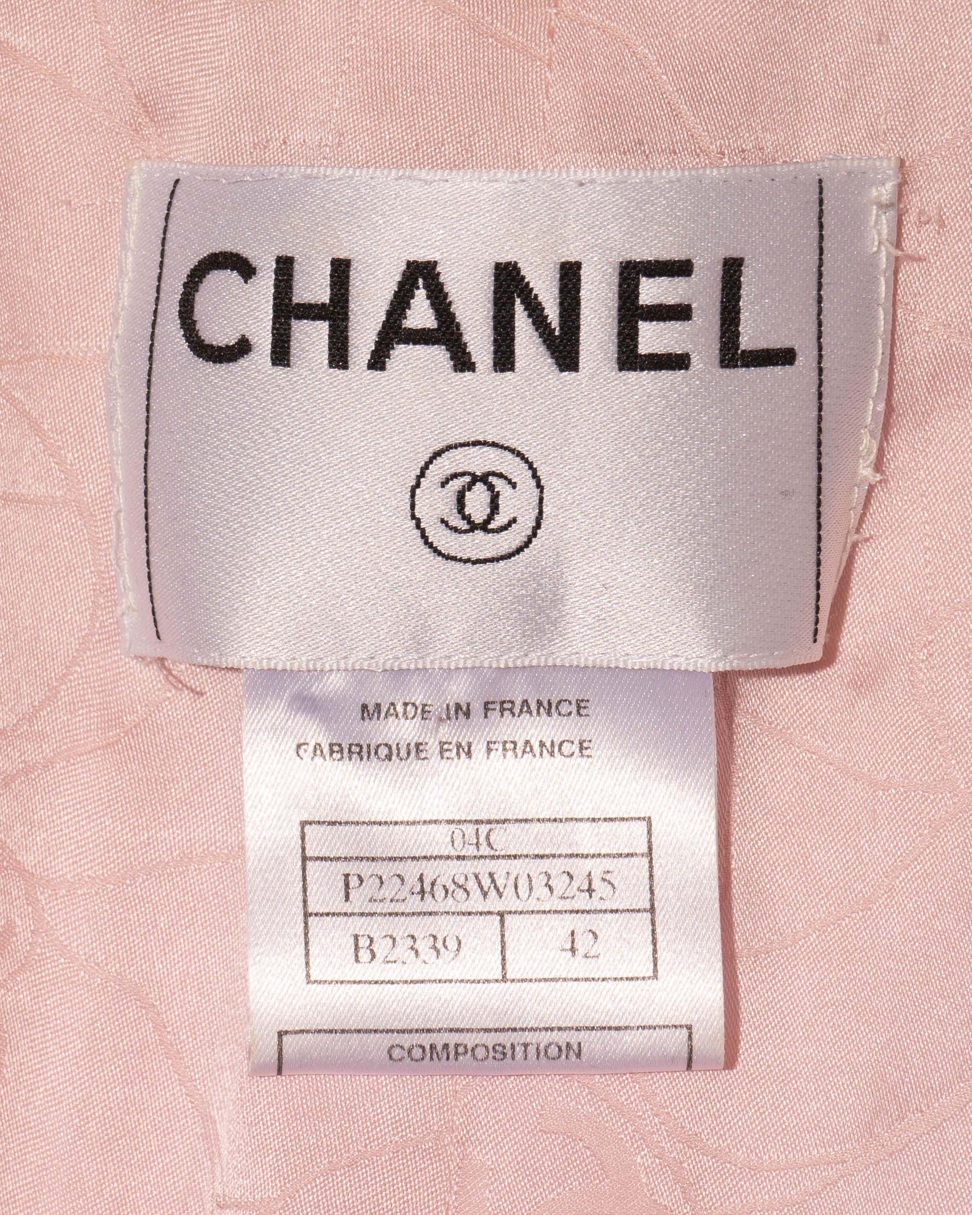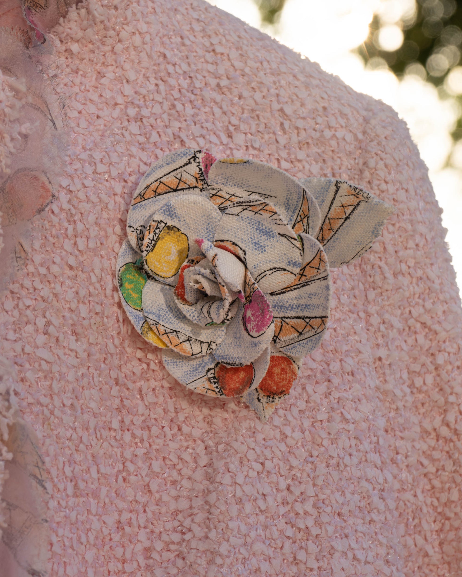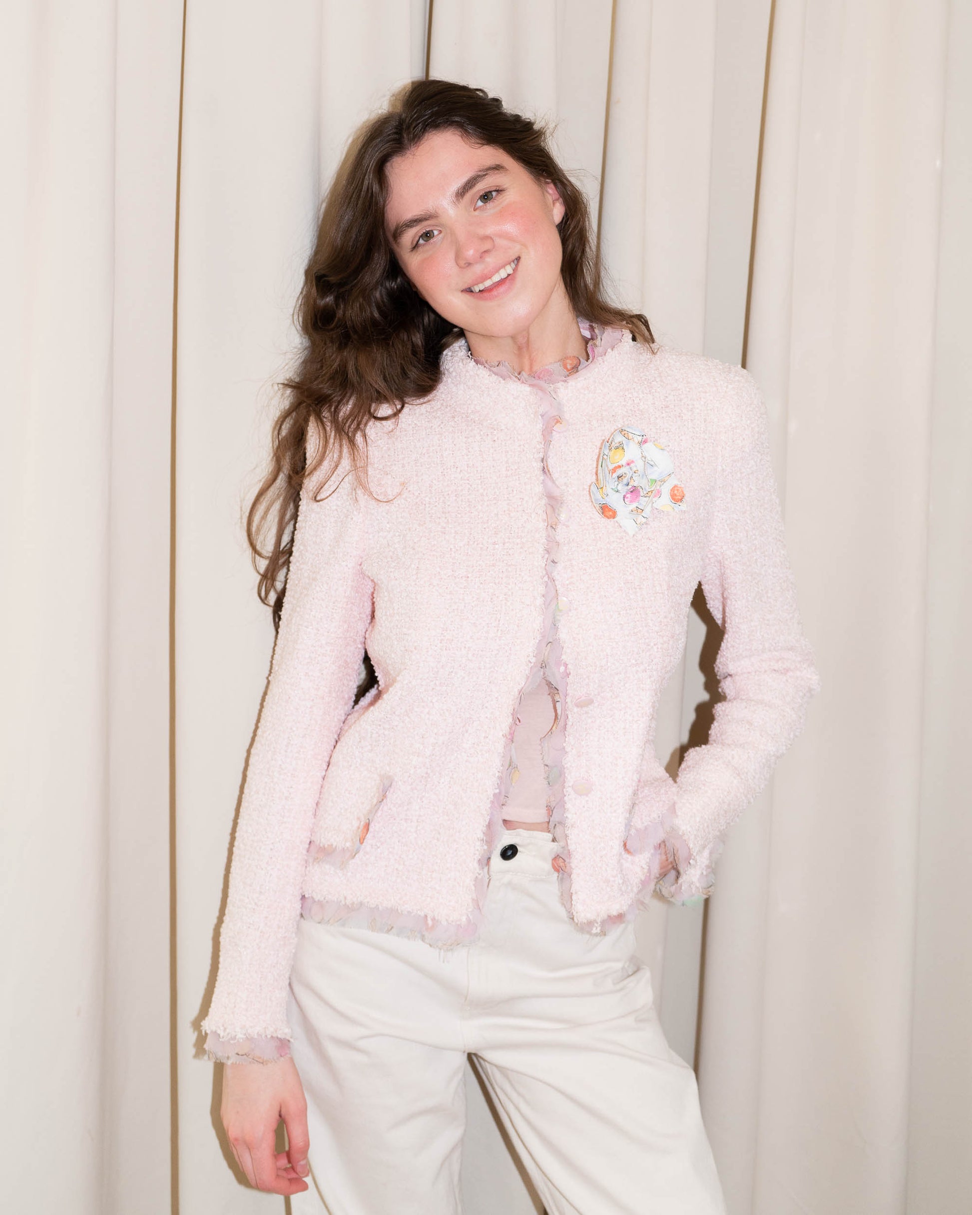 A pastel daydream from the early 2000s. This pink fantasy tweed jacket was designed under Karl Lagerfeld’s direction for Chanel’s Cruise 2004 collection. It features whimsical silk trim and a matching camellia brooch, both printed with a hand-drawn ice cream motif—rare details that make this piece truly collectible. Finished with tonal pastel CC-logo buttons, two slit pockets, and delicate fringe at the cuffs and hem. Lightweight and fully silk-lined, with a signature chain sewn at the hem for that classic drape.