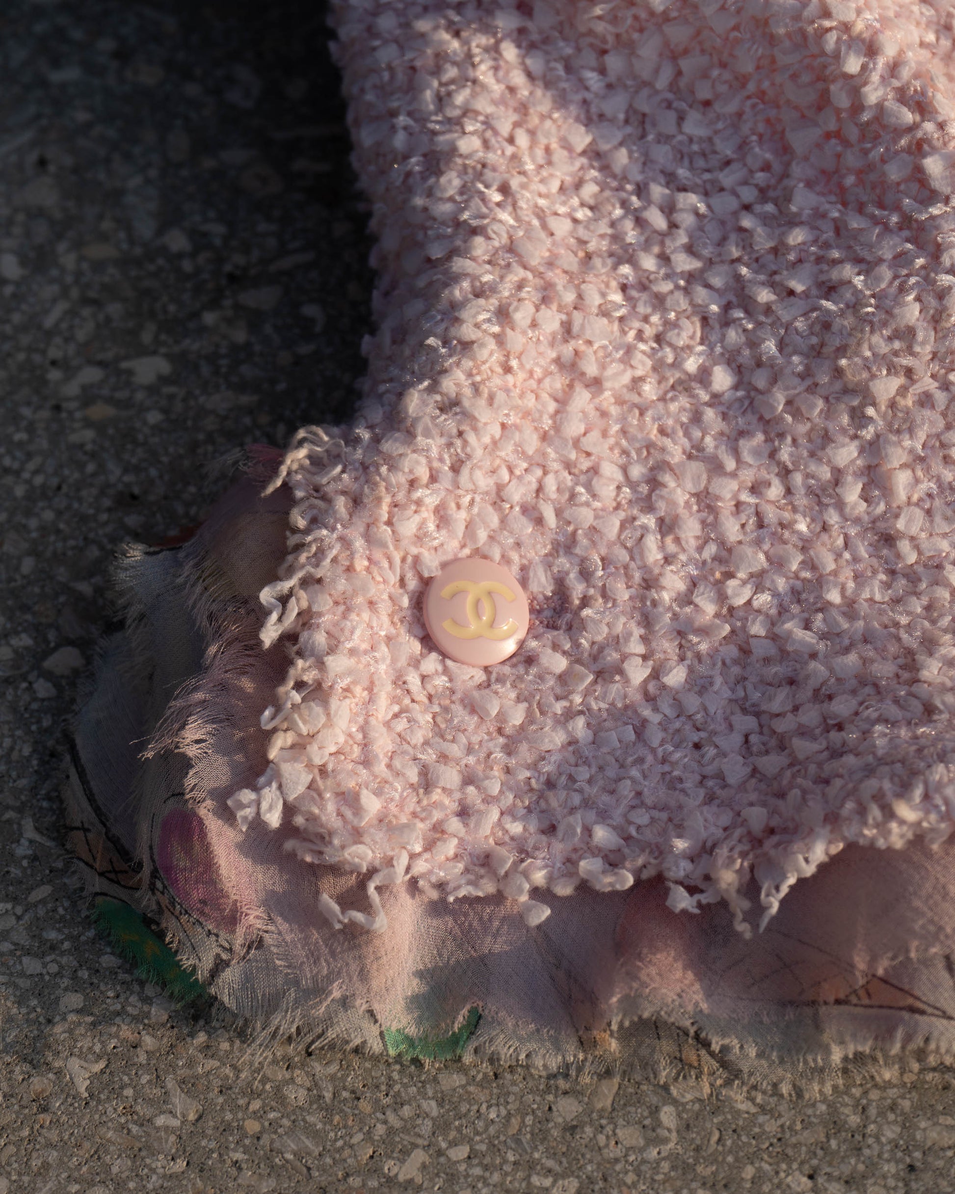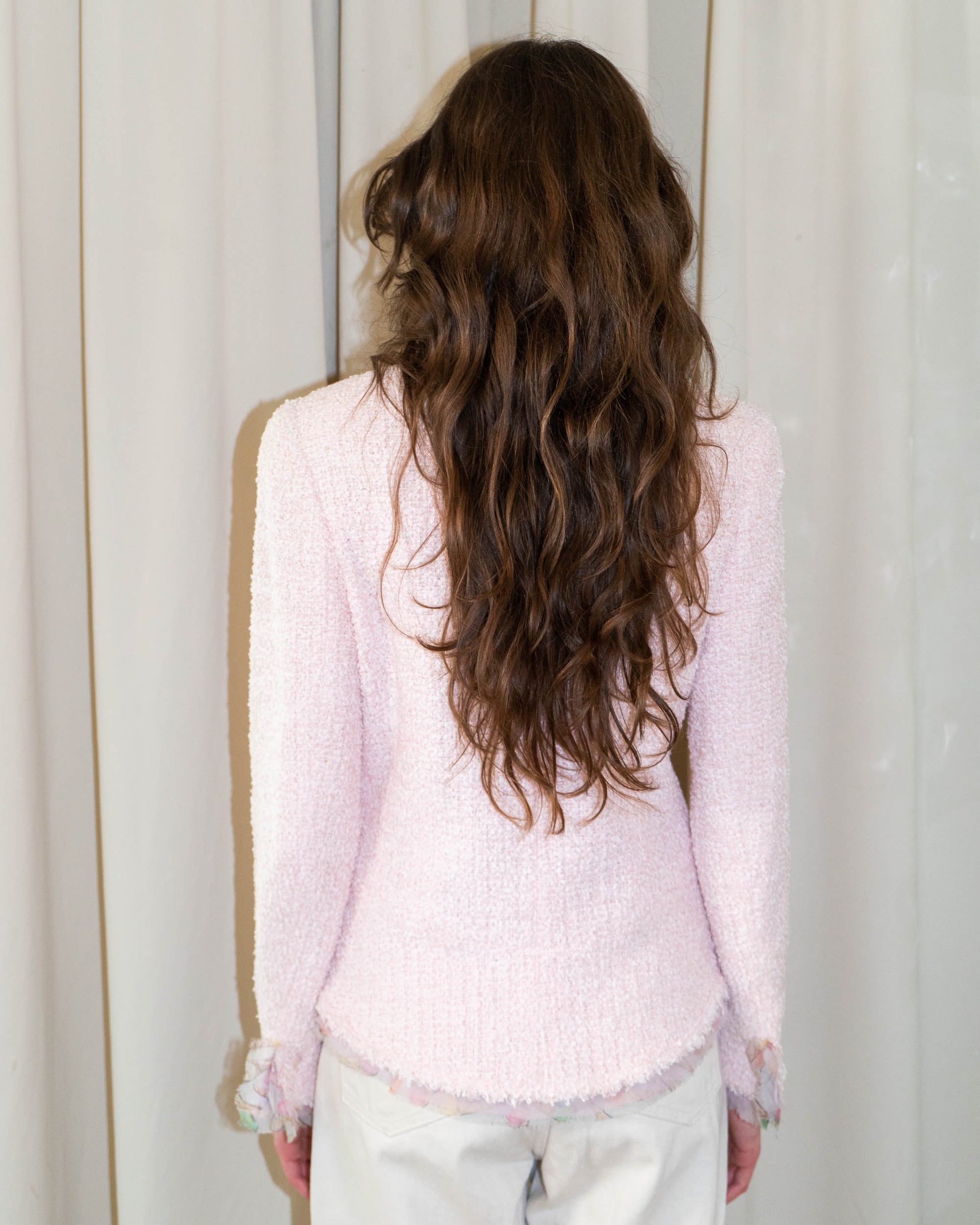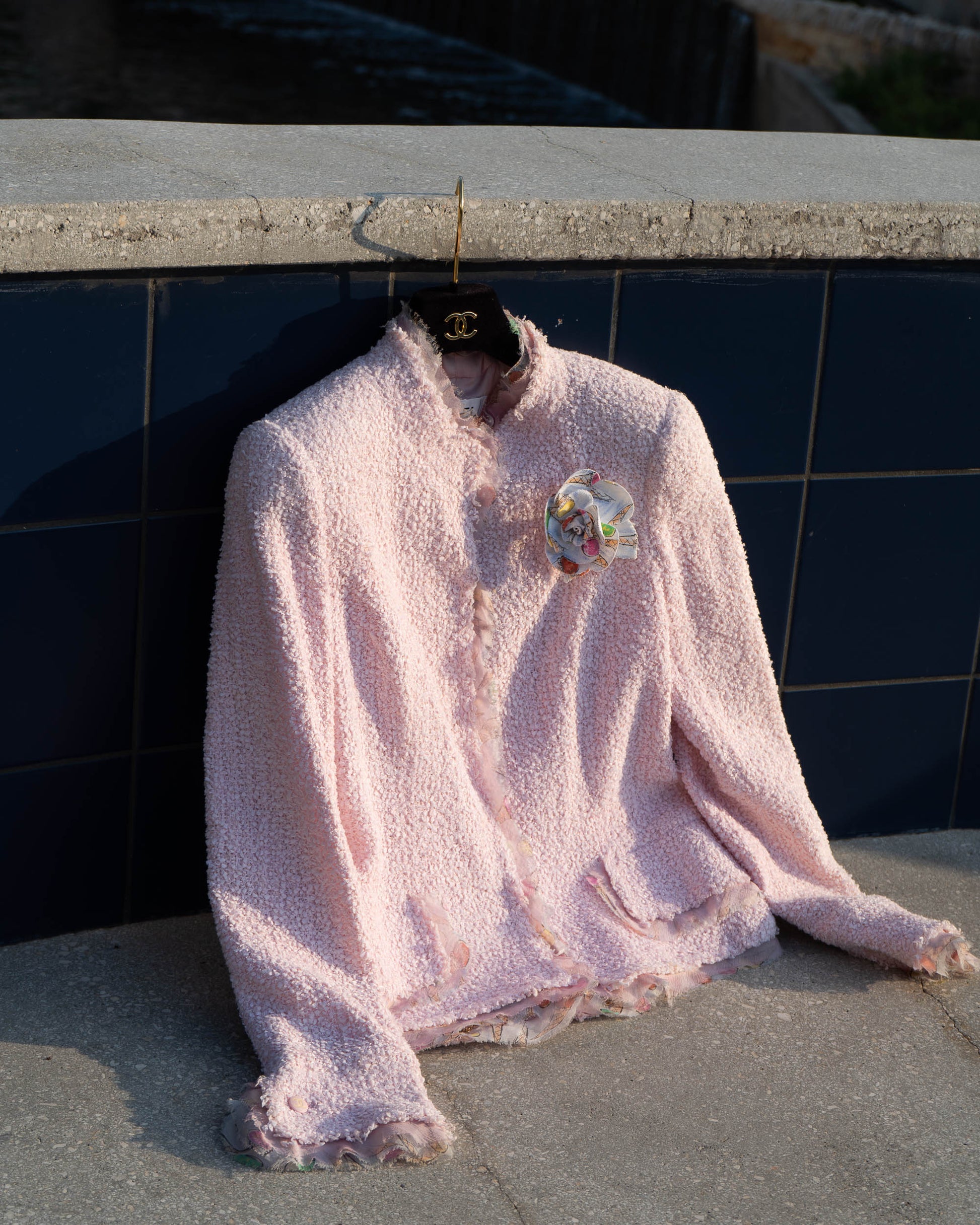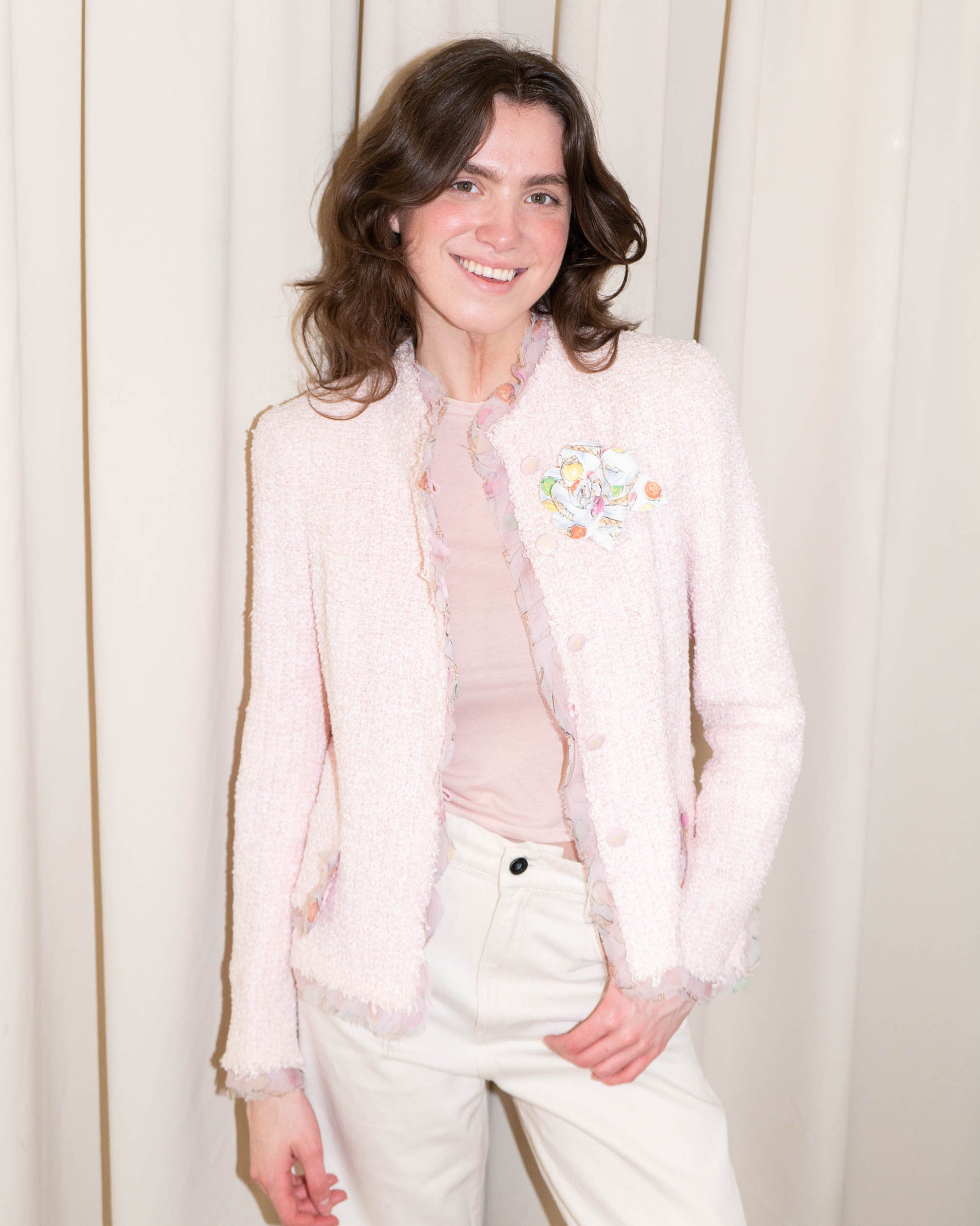 A pastel daydream from the early 2000s. This pink fantasy tweed jacket was designed under Karl Lagerfeld’s direction for Chanel’s Cruise 2004 collection. It features whimsical silk trim and a matching camellia brooch, both printed with a hand-drawn ice cream motif—rare details that make this piece truly collectible. Finished with tonal pastel CC-logo buttons, two slit pockets, and delicate fringe at the cuffs and hem. Lightweight and fully silk-lined, with a signature chain sewn at the hem for that classic drape.