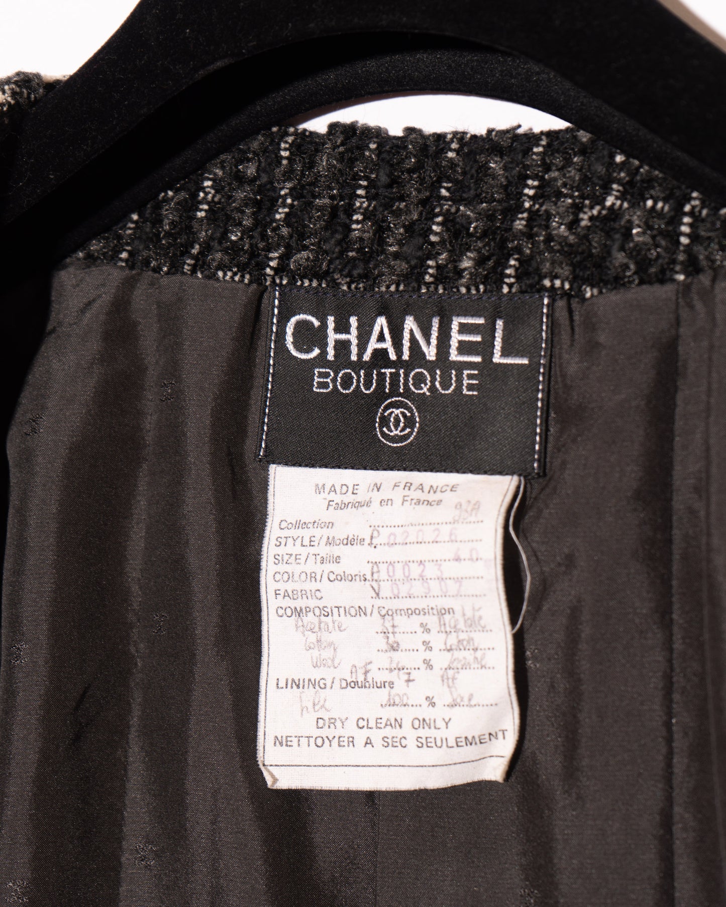 This Chanel jacket, presented in a gray tone tweed, is a testament to the timeless designs of Coco Chanel, reimagined by Karl Lagerfeld for the Fall 1993 collection. The luxurious fabric is crafted into a flattering silhouette, adorned with the iconic gold-tone interlocking C buttons that provide a striking contrast against the gray hue. Four patch pockets add both function and style. The jacket's trim carries an understated elegance, while the interior promises comfort with a silk lining and the distinctive Chanel chain at the hem, ensuring the piece hangs just so. A sophisticated addition to any wardrobe, embodying Chanel's legacy of elegance.
