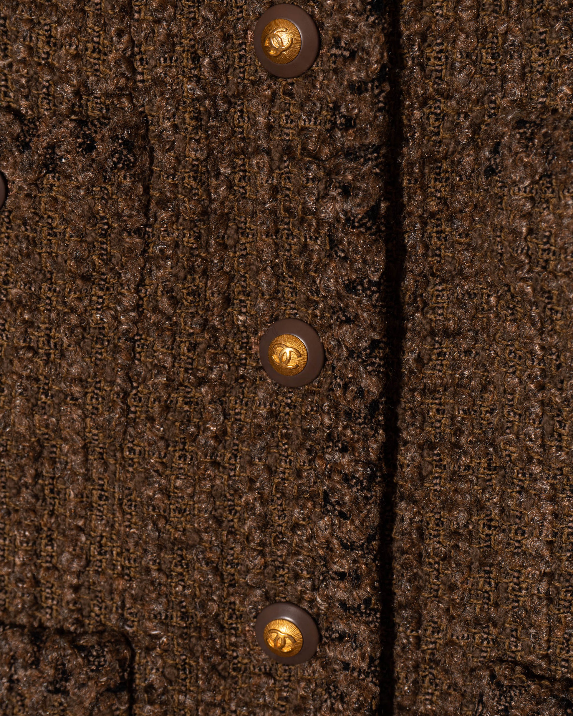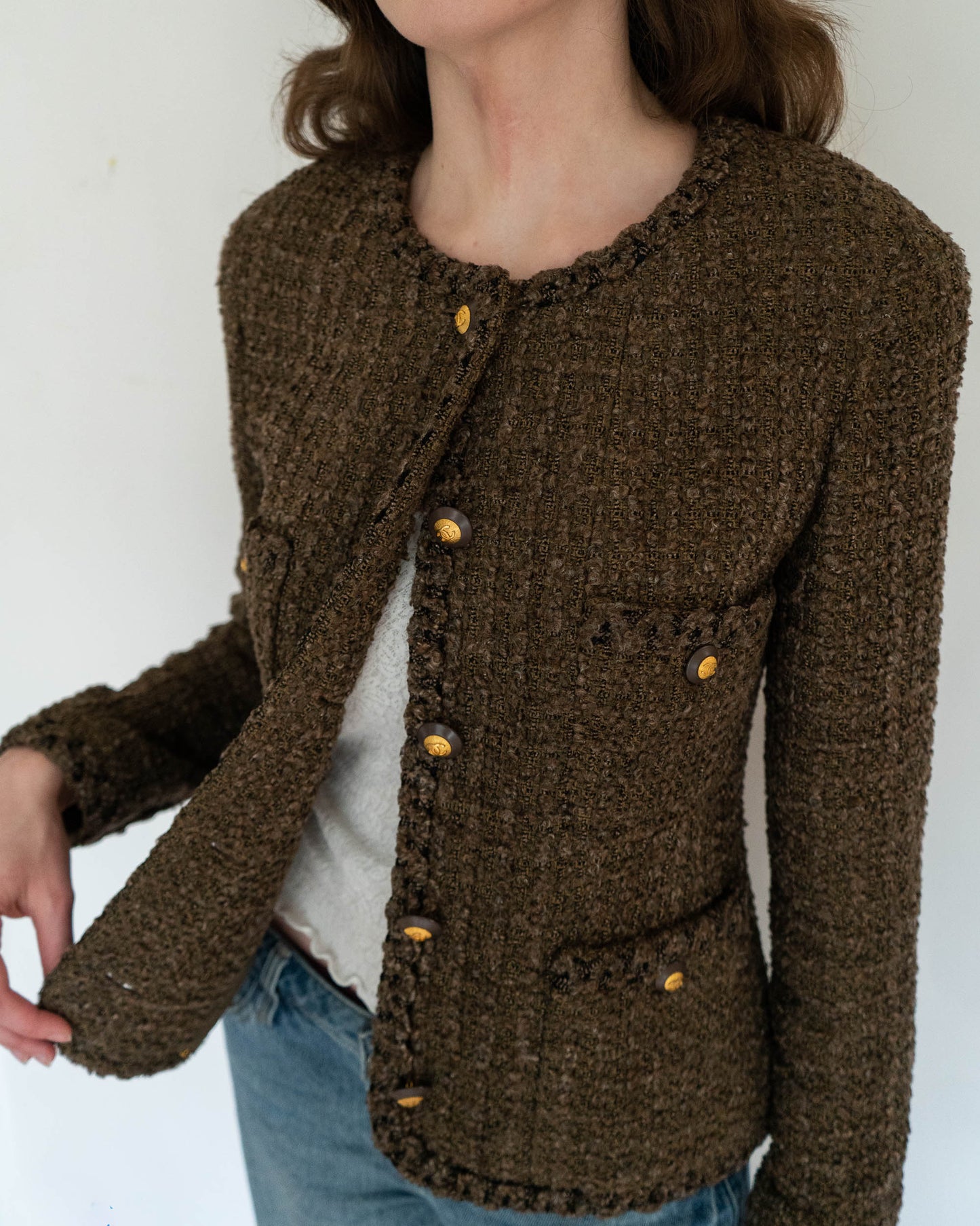 A classic from Chanel’s Fall 1993 collection under Karl Lagerfeld, this jacket channels the essence of Coco’s original vision. Crafted in plush tweed bouclé that subtly reminds us of a soft teddy bear, it features four front pockets, gold-tone interlocking CC buttons, and braided trim throughout. Fully lined in silk and finished with the house’s signature chain at the hem, it’s a timeless silhouette designed to drape flawlessly. An enduring icon of Chanel’s refined codes.