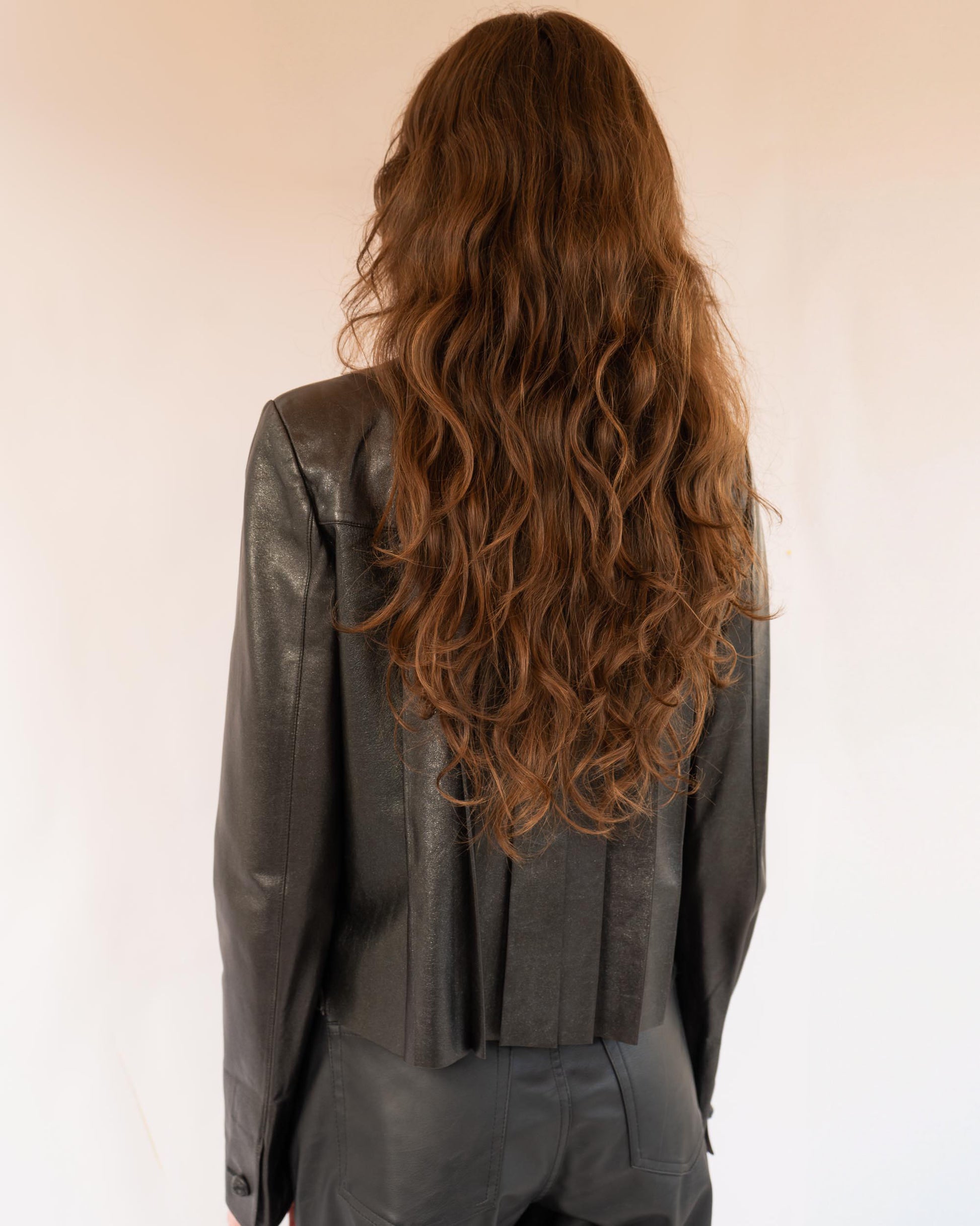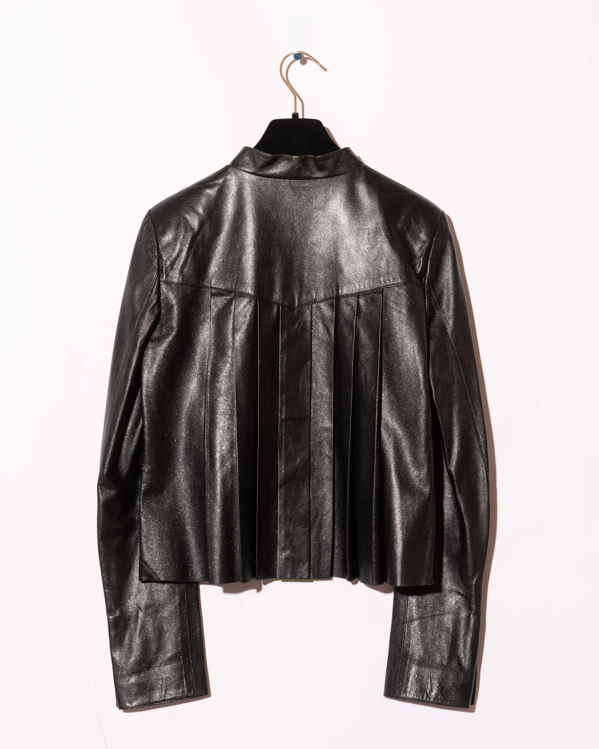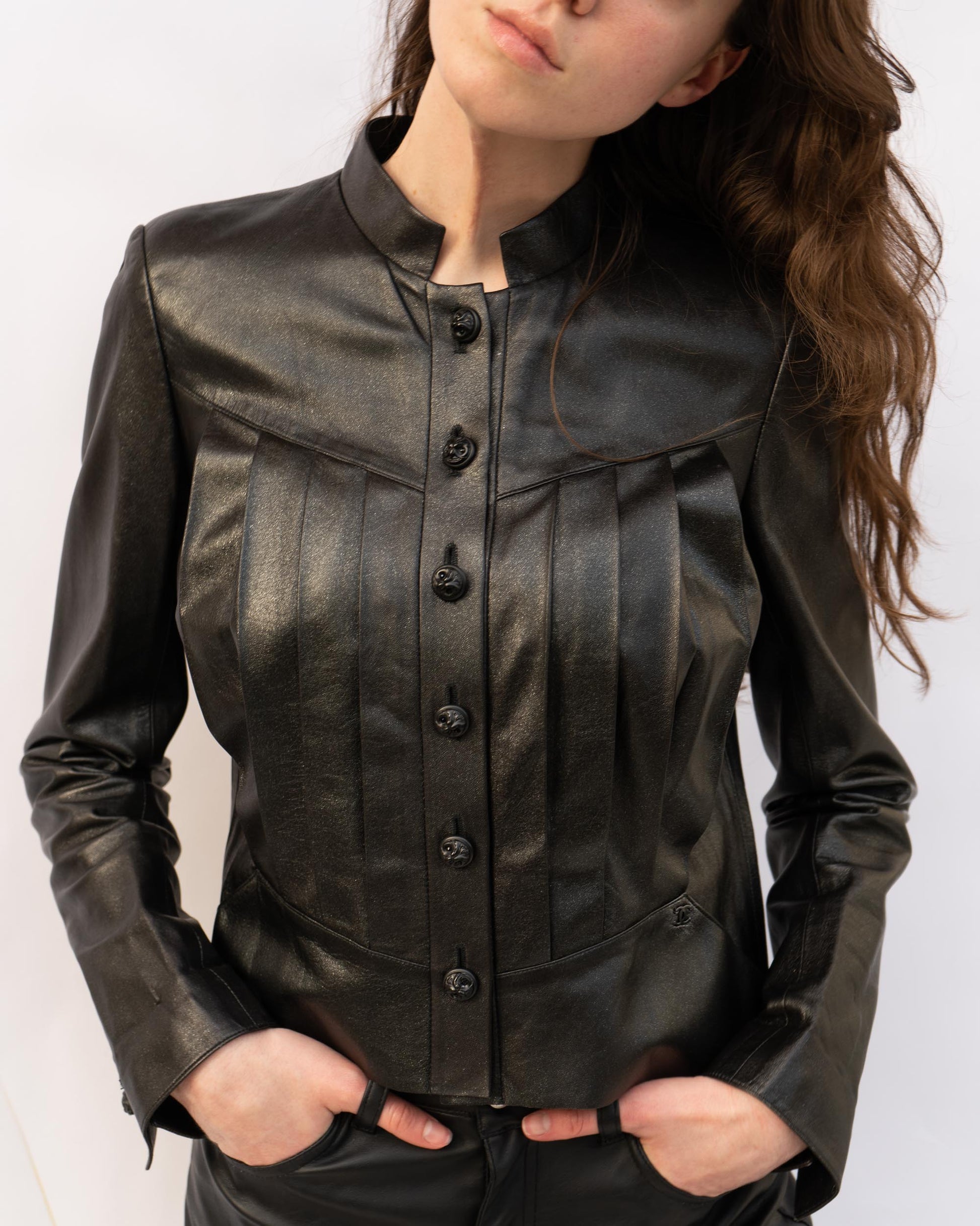 From Fall 2002, this rare Chanel piece is crafted from shimmering black lambskin with a soft, supple feel and sculptural structure. Featuring sharp front and back pleats, a mandarin collar, and two subtle front pockets, it balances elegance with edge.
