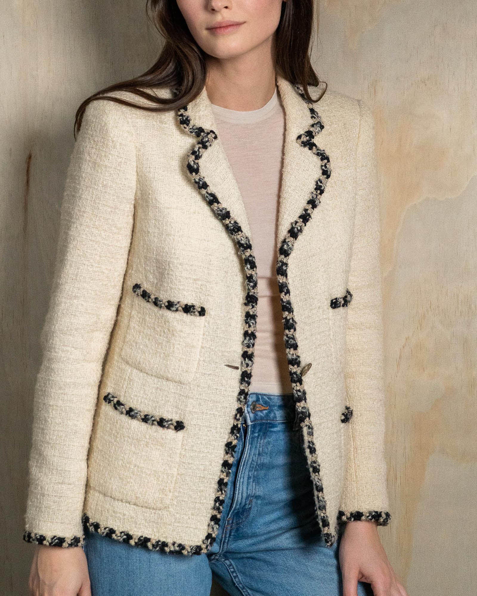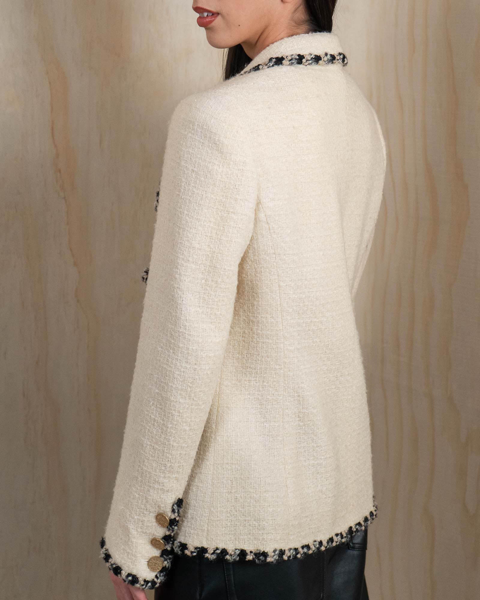 From the Fall 2006 collection, this Chanel jacket is crafted from a soft, ivory wool tweed with classic black-and-taupe boucle trim. The silhouette is clean and straight, anchored by four signature patch pockets and a single engraved CC button at the front. Sleek notched lapels and hand-woven trim highlight the artisanal finish that defines mid-2000s Chanel tailoring.