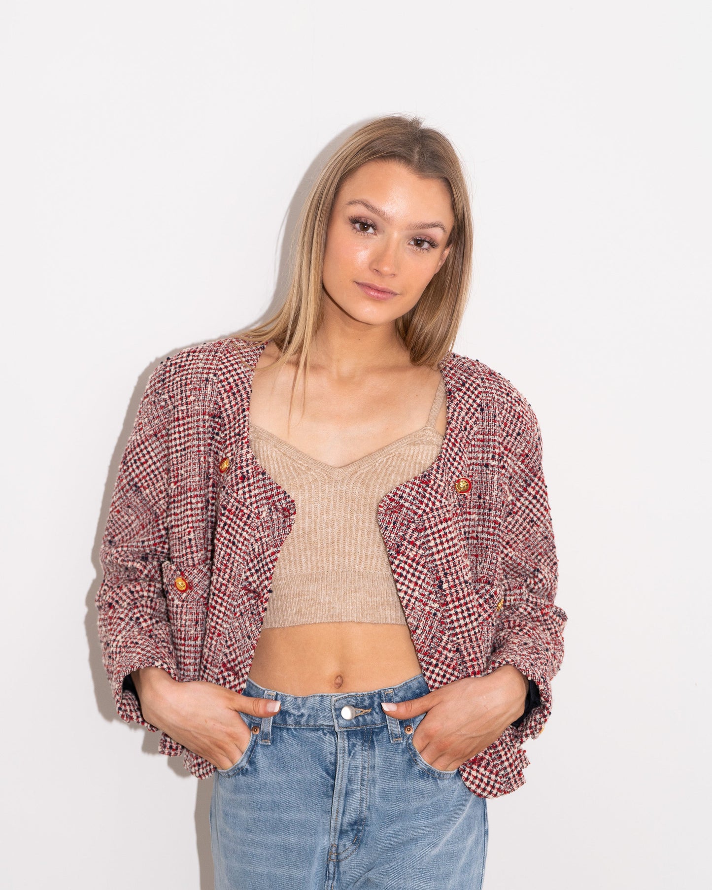 This beautiful double-breasted jacket from the 1980s is cut in a white, red, and dark navy plaid tweed. Lined in silk and finish with the trademark chain at the hem, this piece gives us 1980s supermodel vibes. We can easily imagine Naomi Campbell or Cindy Crawford walking down the runway wearing this jacket.