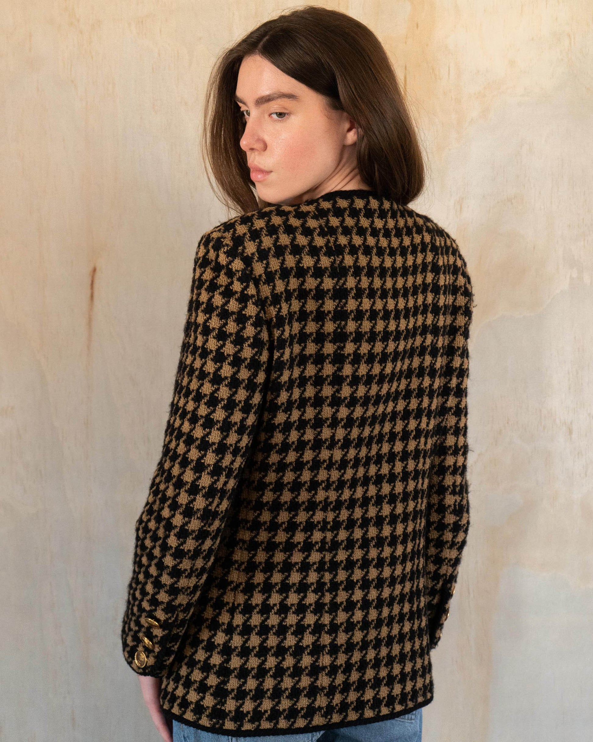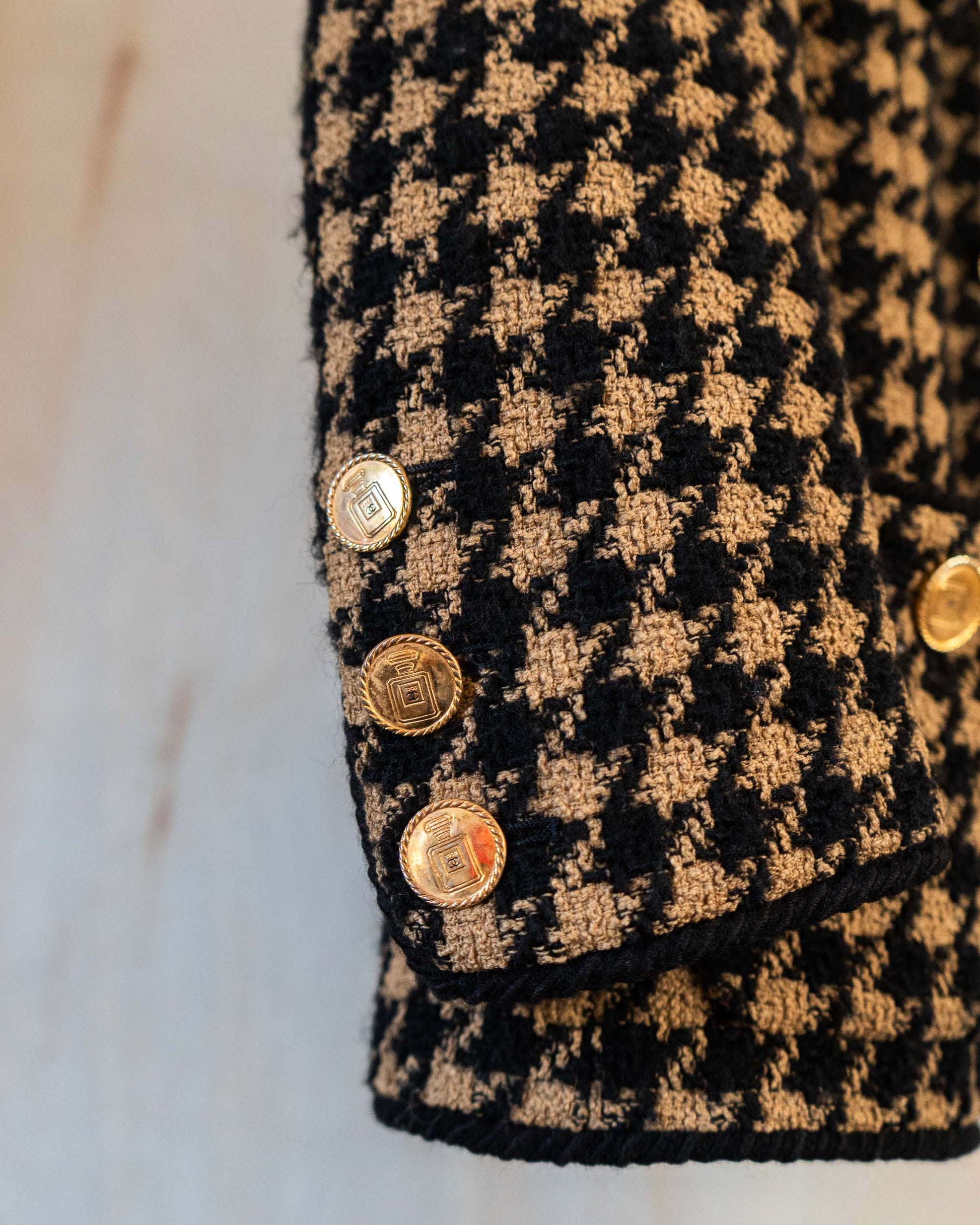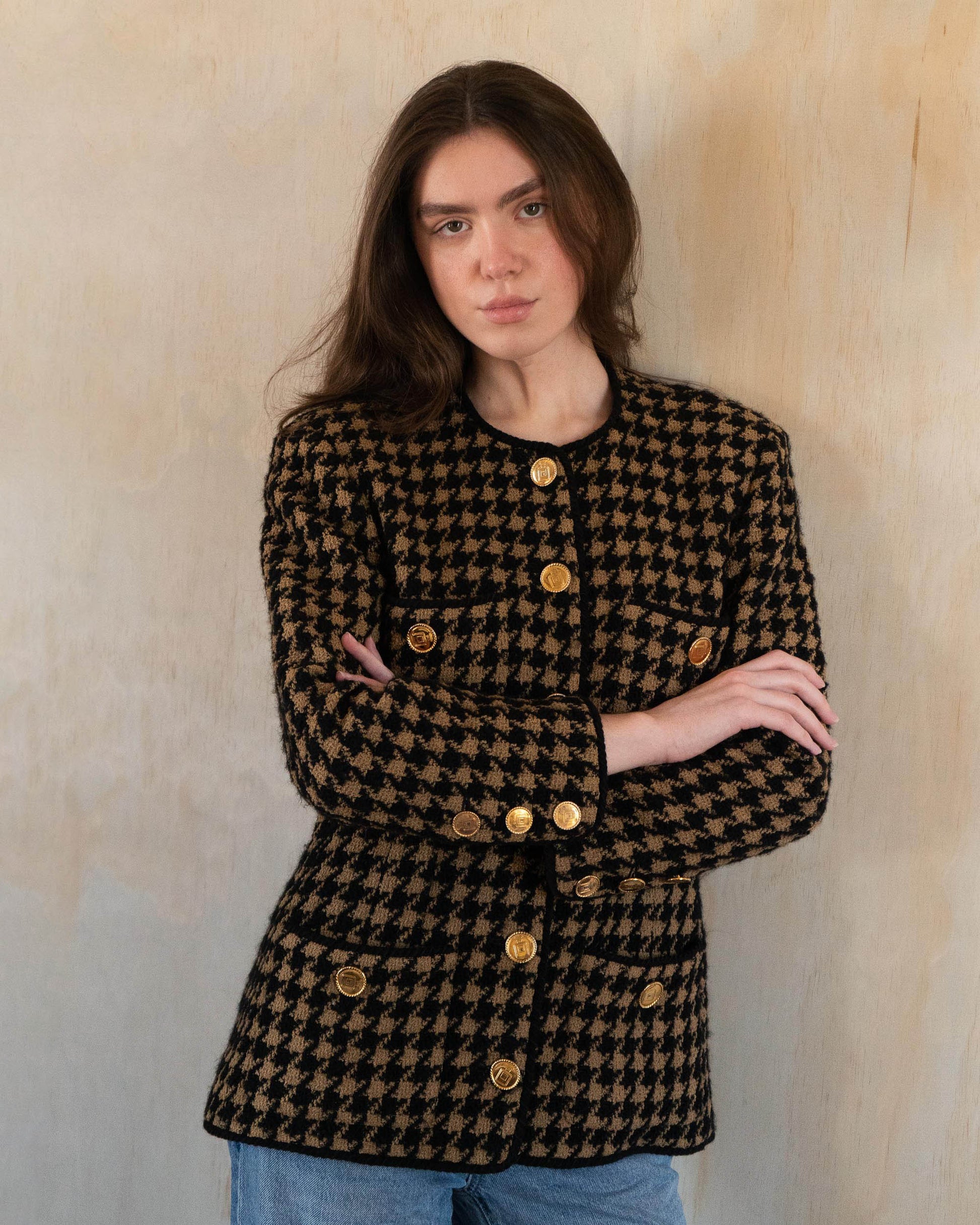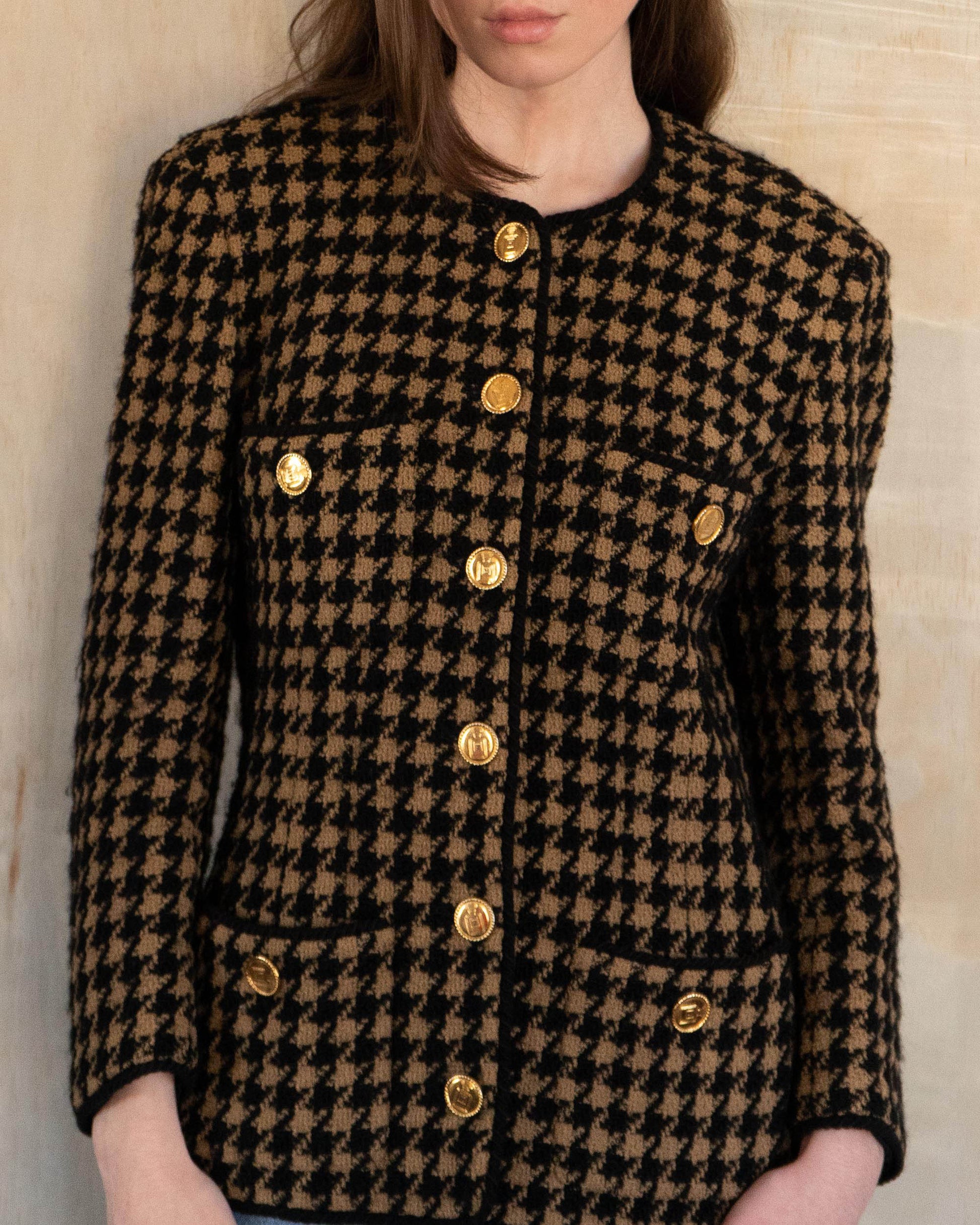 A wearable slice of Chanel history that’s anything but ordinary. Designed under Karl Lagerfeld in the 1980s, this houndstooth wool tweed jacket boasts all the hallmarks of the iconic Maison—four functional pockets, a universally flattering silhouette, and gold-tone buttons showcasing both the Chanel logo and the No. 5 perfume bottle motif. Lined in sumptuous silk for all-day comfort, it captures the timeless allure of vintage Chanel while staying undeniably cool for the modern wardrobe.