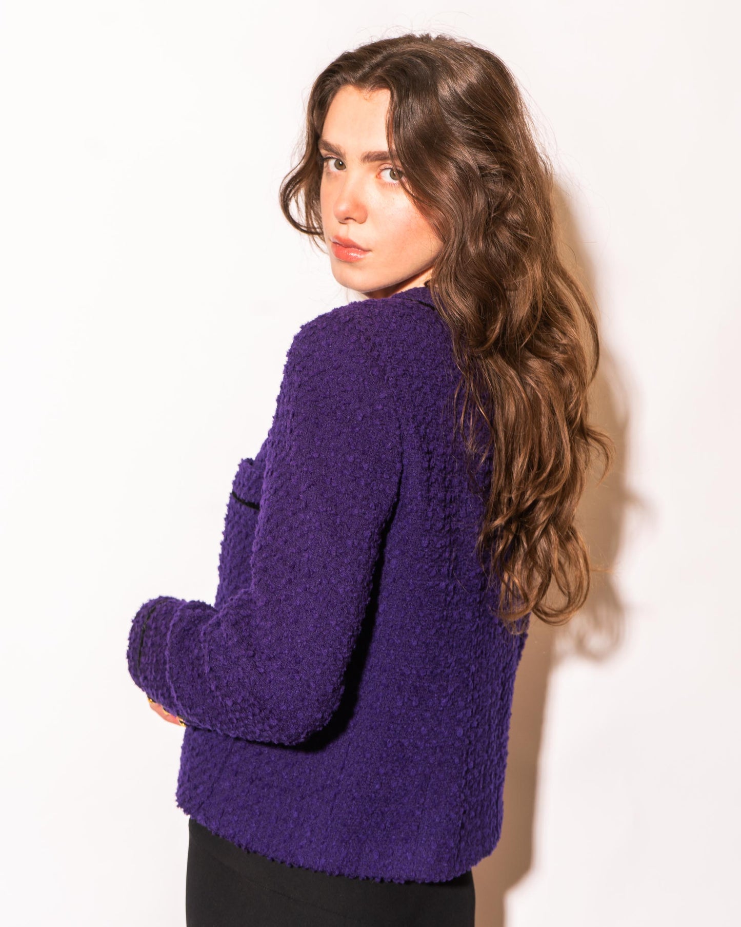 From Chanel’s Fall 1993 collection by Karl Lagerfeld, this jacket is a stunning example of timeless design with a bold twist. Crafted in a vibrant violet, it features four practical pockets accented with black velvet trim and iconic interlocking C logo buttons. Lined in silk with a chain at the interior hem, this piece is both luxurious and versatile—a true standout for any wardrobe.