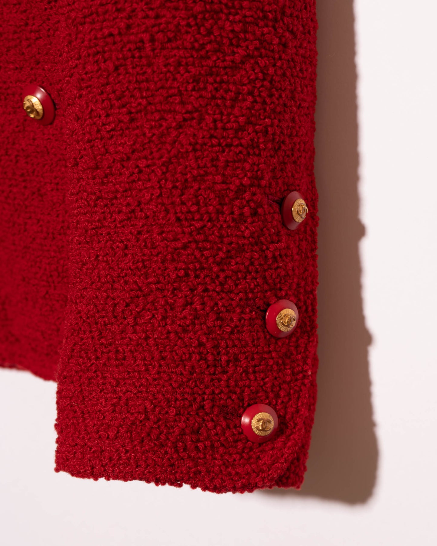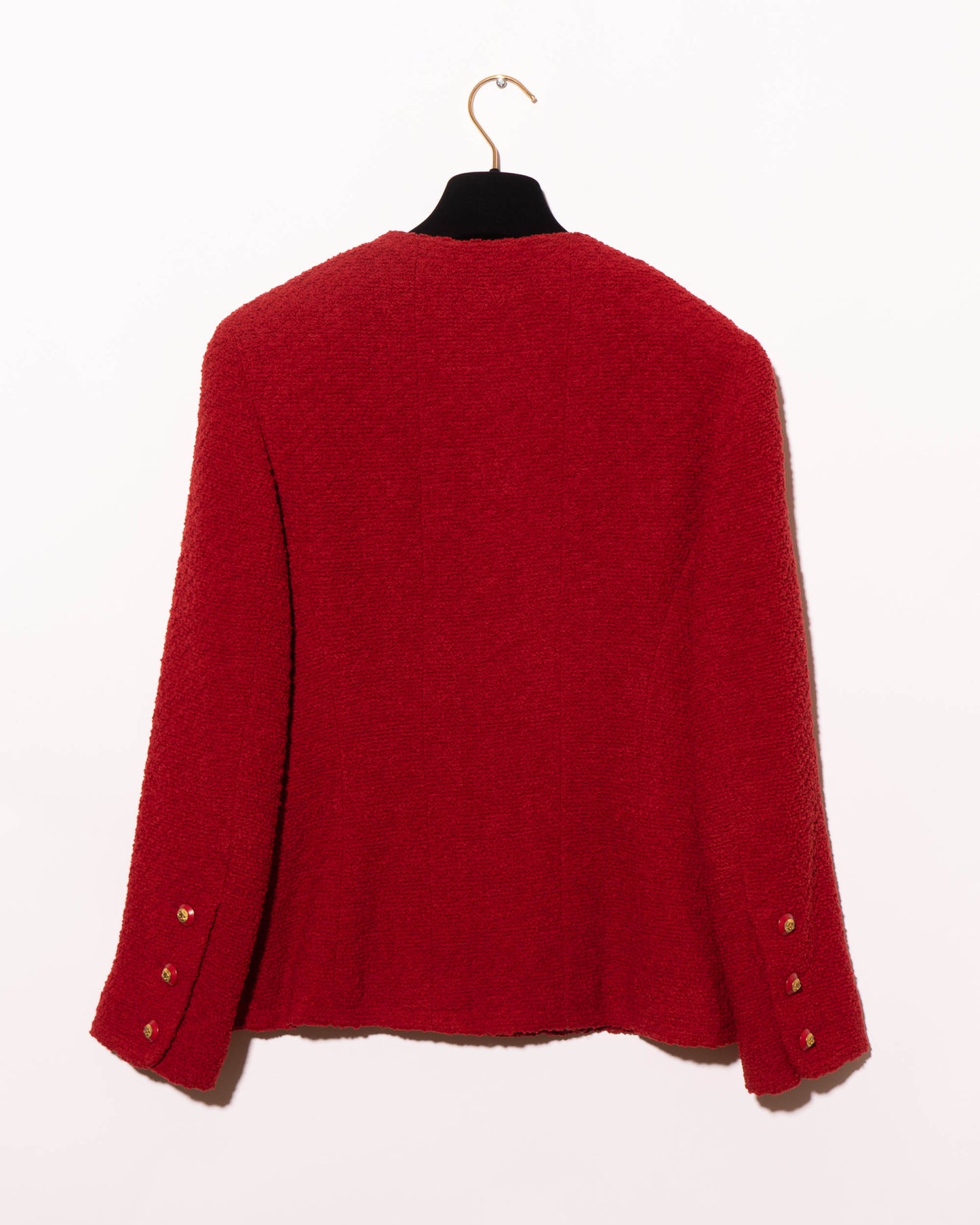 FR38-40 Rare Chanel Fall 1993 Classic Four Pocket Collarless Cut Red Tweed Boucle Jacket