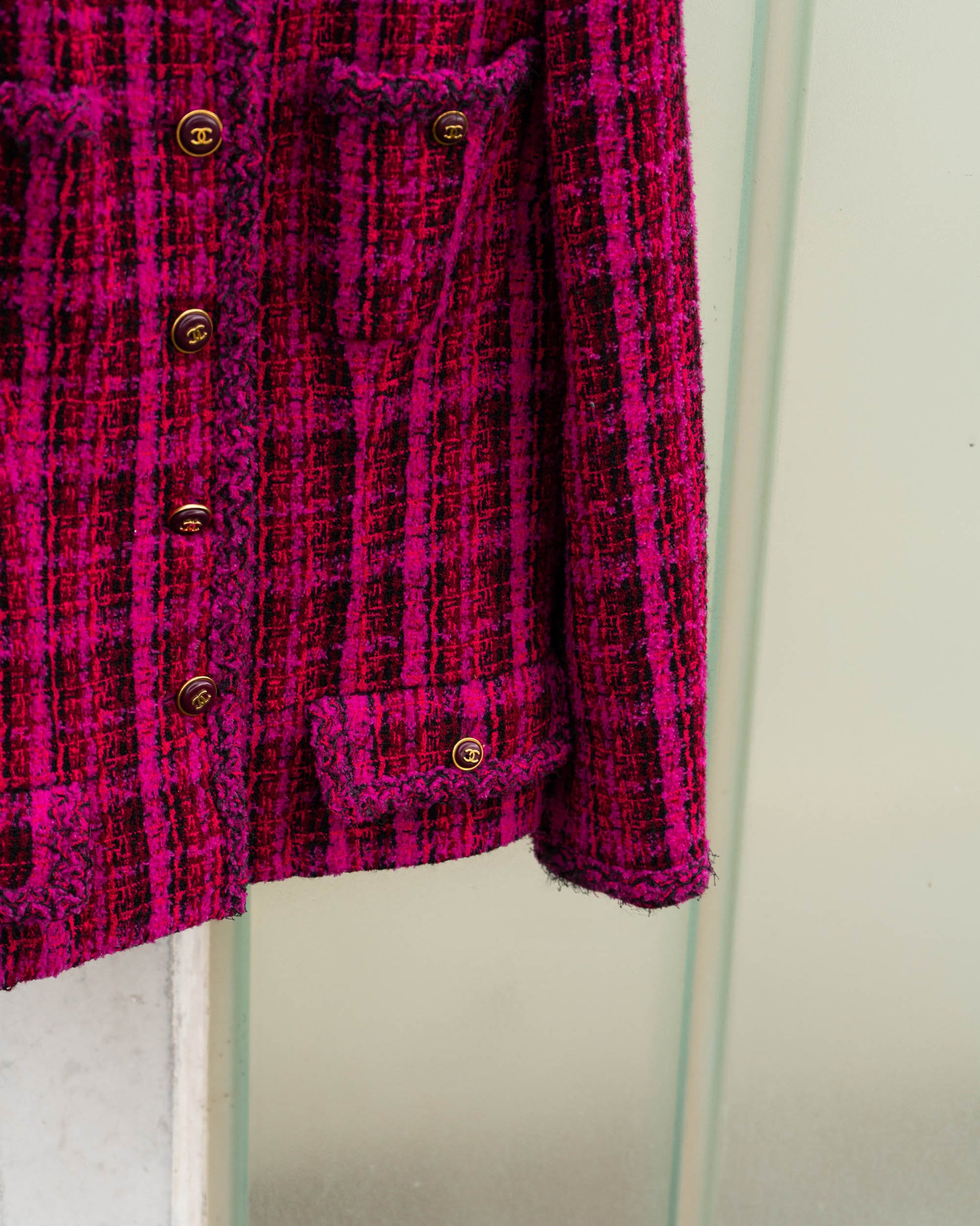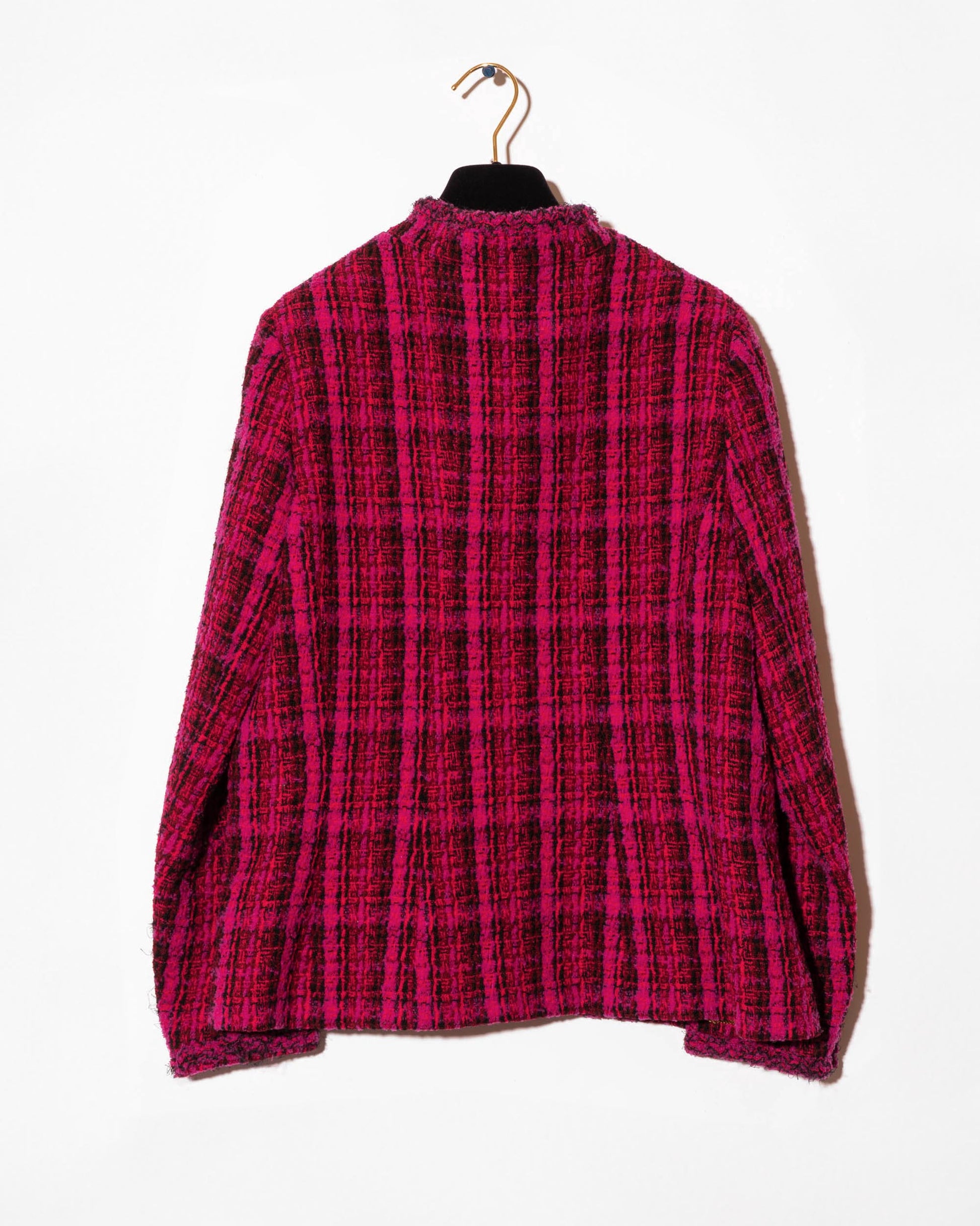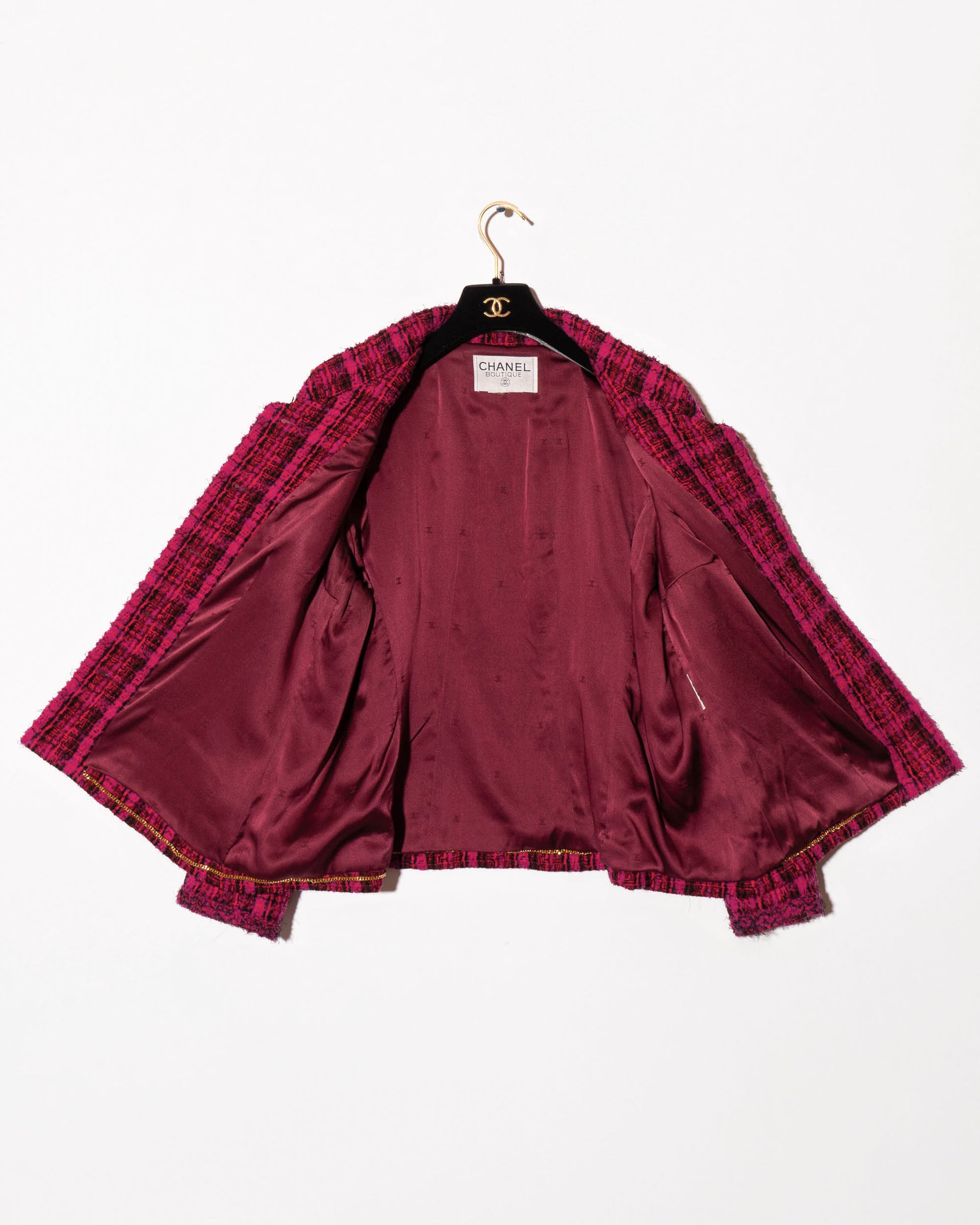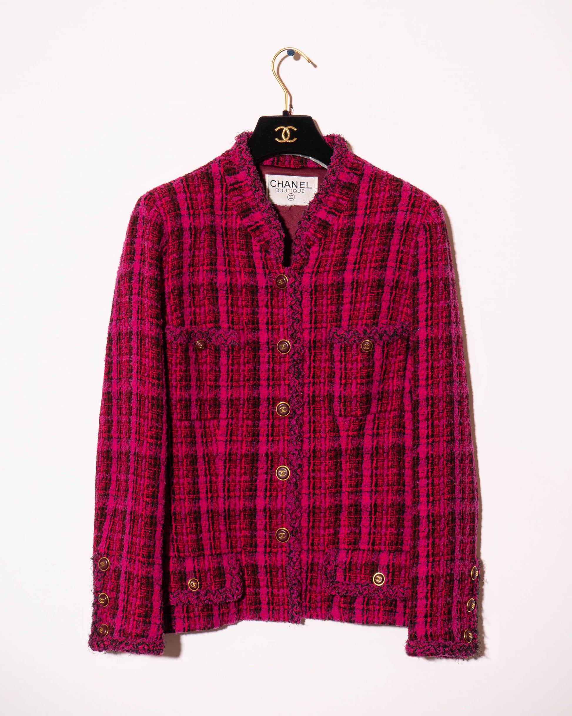 A rare and iconic piece from the Chanel Fall 1995 collection, this jacket captures the bold energy of 90s-era Karl. Crafted in vivid magenta and black plaid tweed, it features four pockets, gold-tone CC logo buttons throughout, and a deep burgundy silk lining finished with the classic chain at the hem.