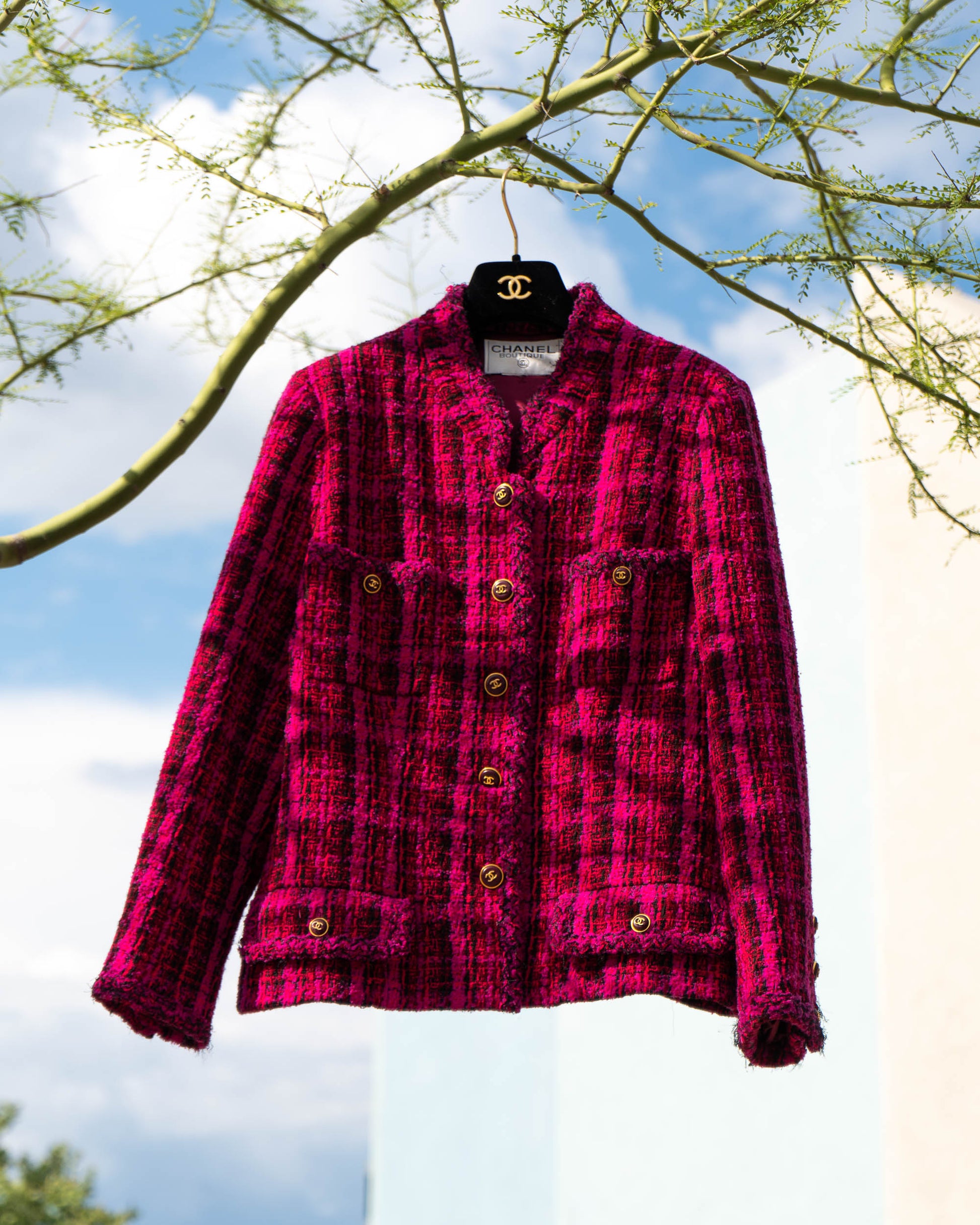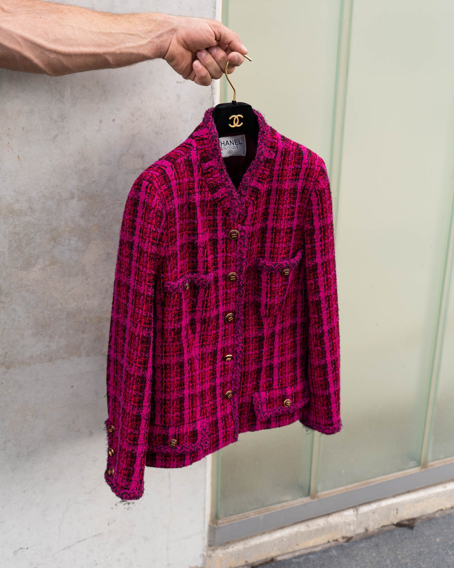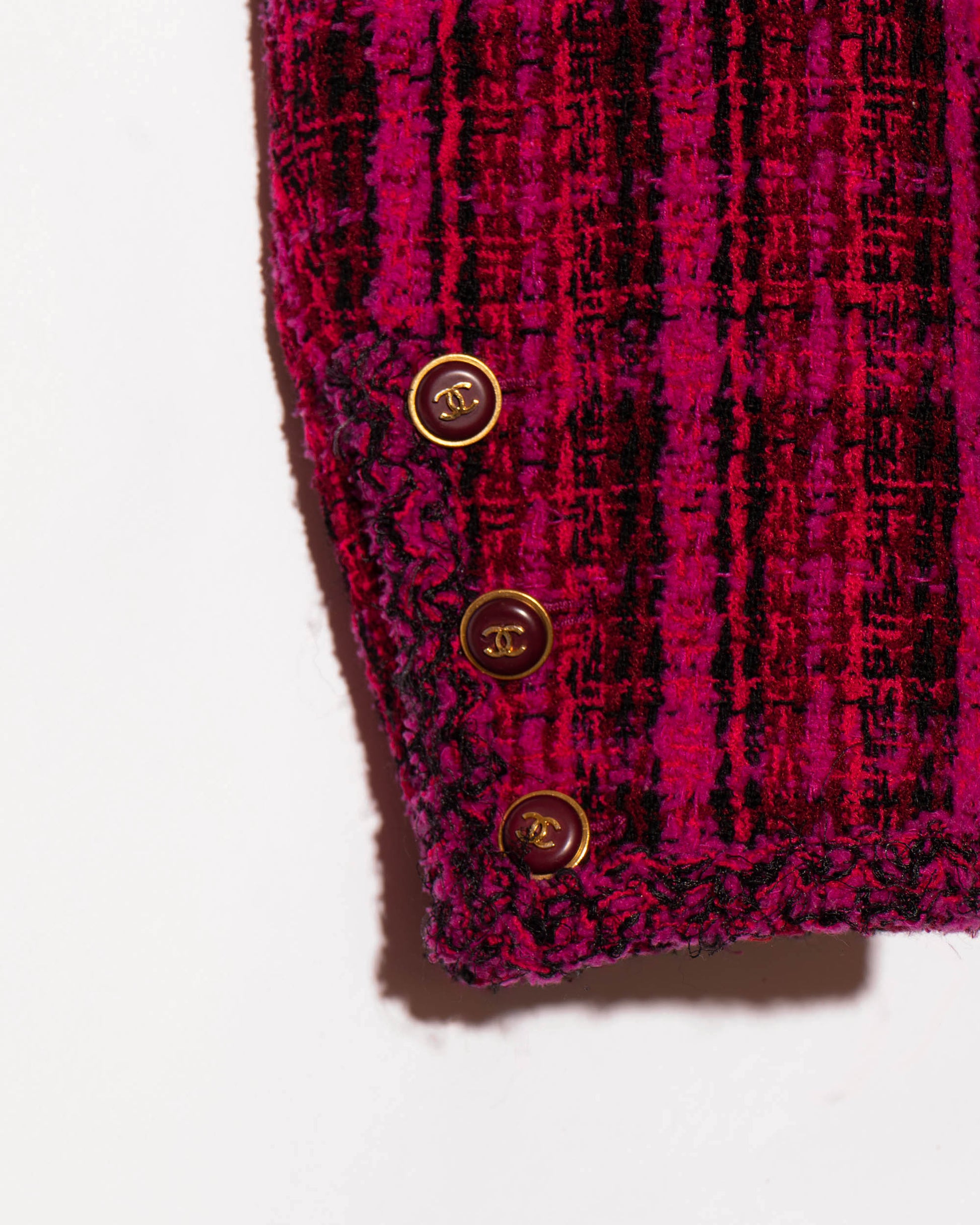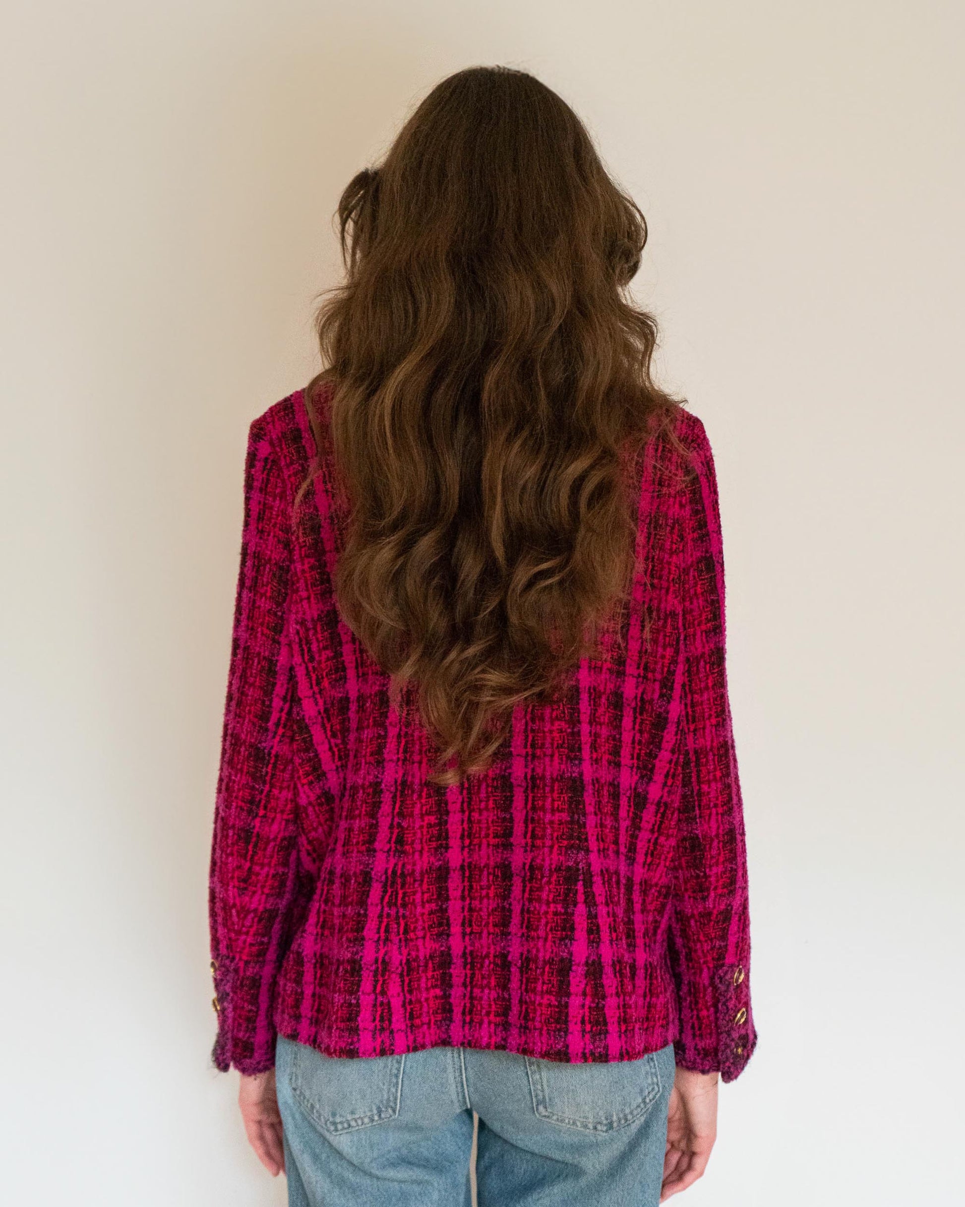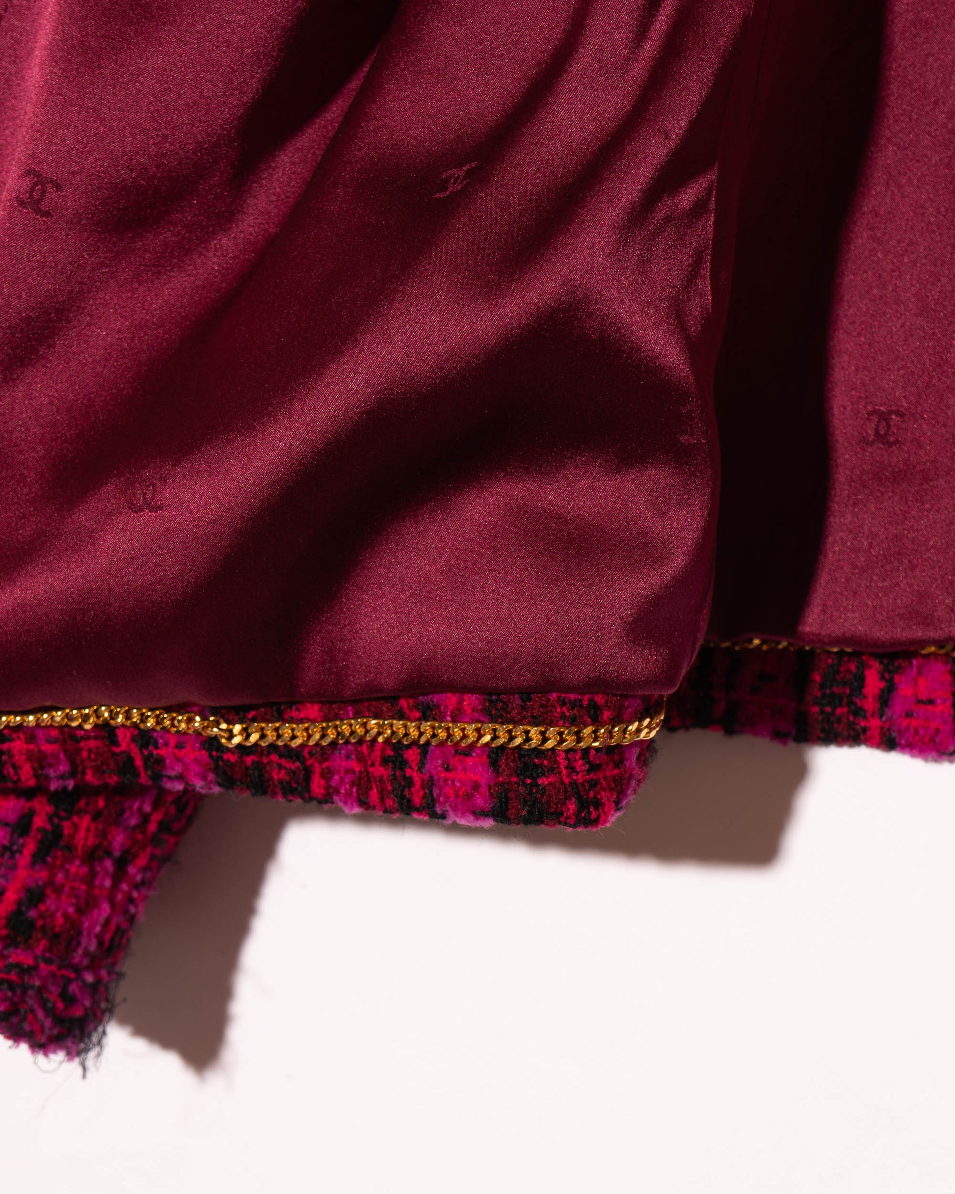 A rare and iconic piece from the Chanel Fall 1995 collection, this jacket captures the bold energy of 90s-era Karl. Crafted in vivid magenta and black plaid tweed, it features four pockets, gold-tone CC logo buttons throughout, and a deep burgundy silk lining finished with the classic chain at the hem.