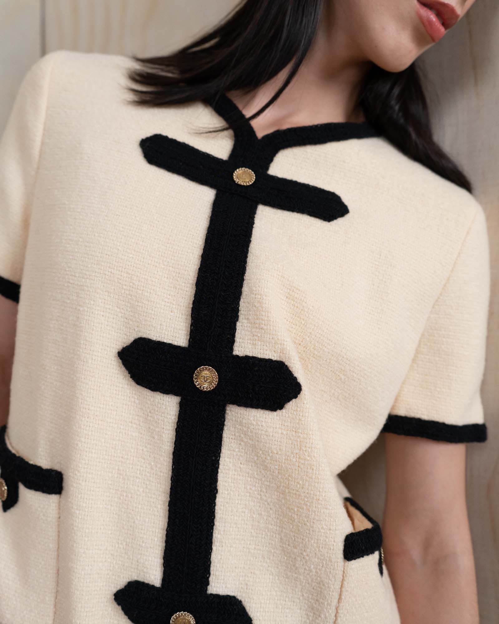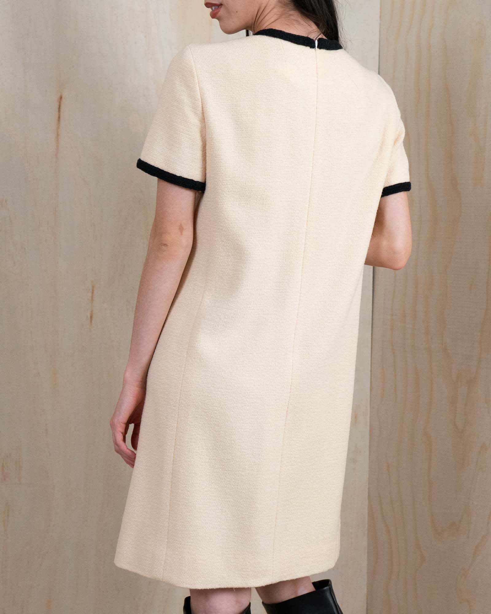From Chanel’s Fall 2005 collection, this ivory wool dress is a refined example of Karl Lagerfeld’s modern classicism. The straight, easy silhouette is defined by graphic black trim running through the neckline, front, sleeves, and pockets, creating a strong contrast against the soft wool ground. Gold CC buttons punctuate the front, adding subtle structure and balance.