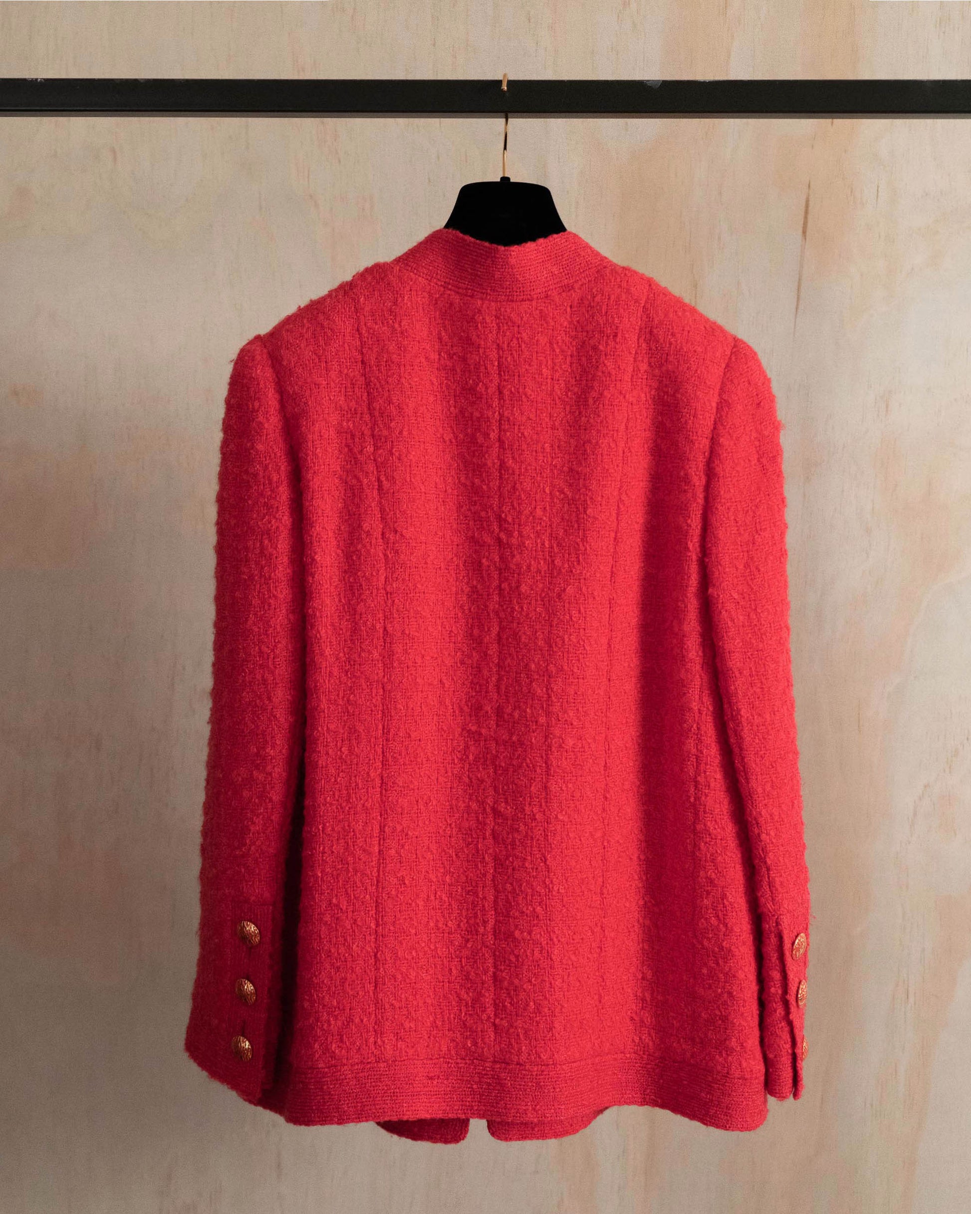 The color is rich and saturated, striking without being loud, the kind of red that lights up the face. A true couture jacket from the early 90s, rare and wearable, made to last a lifetime and beyond.